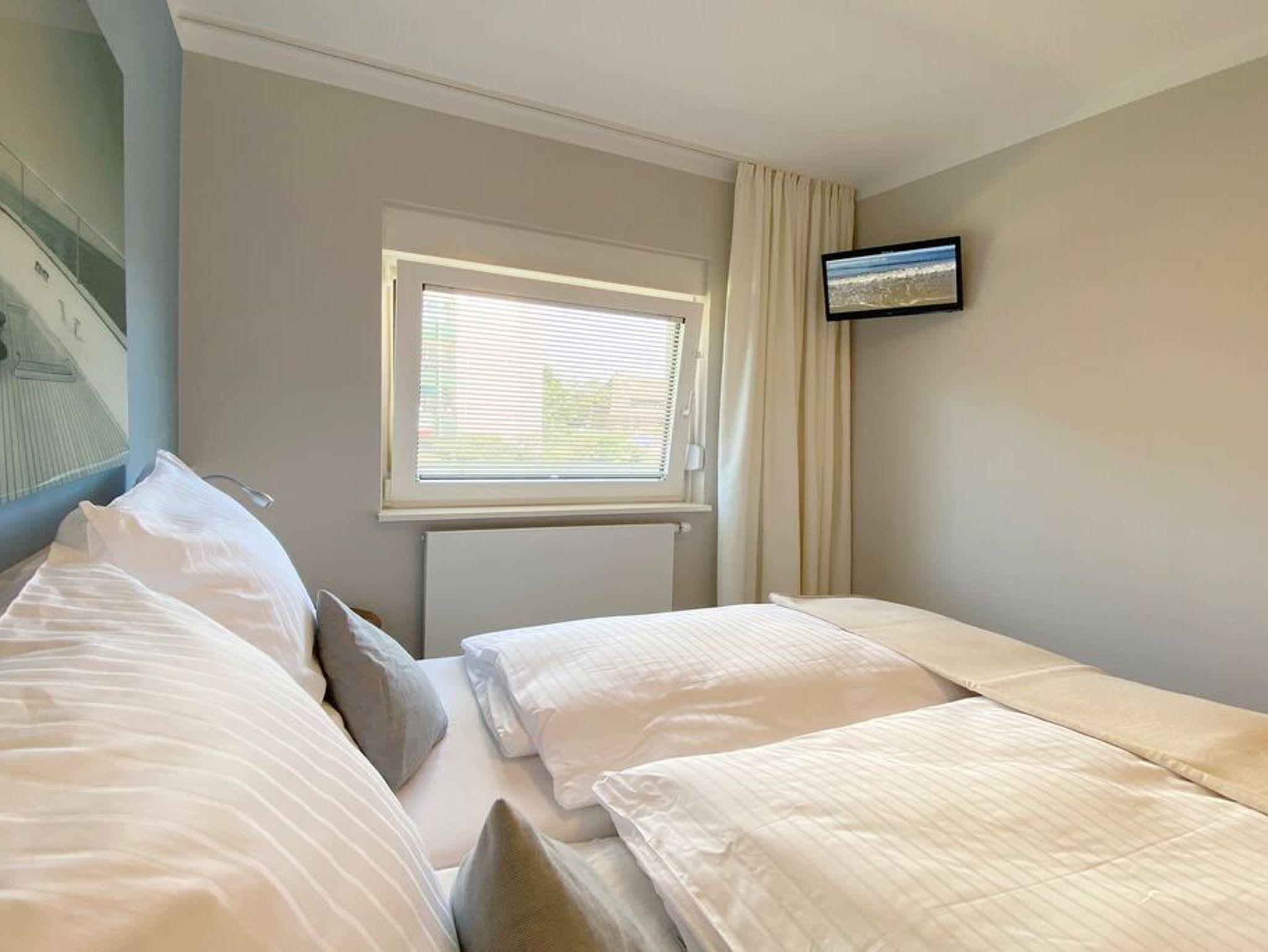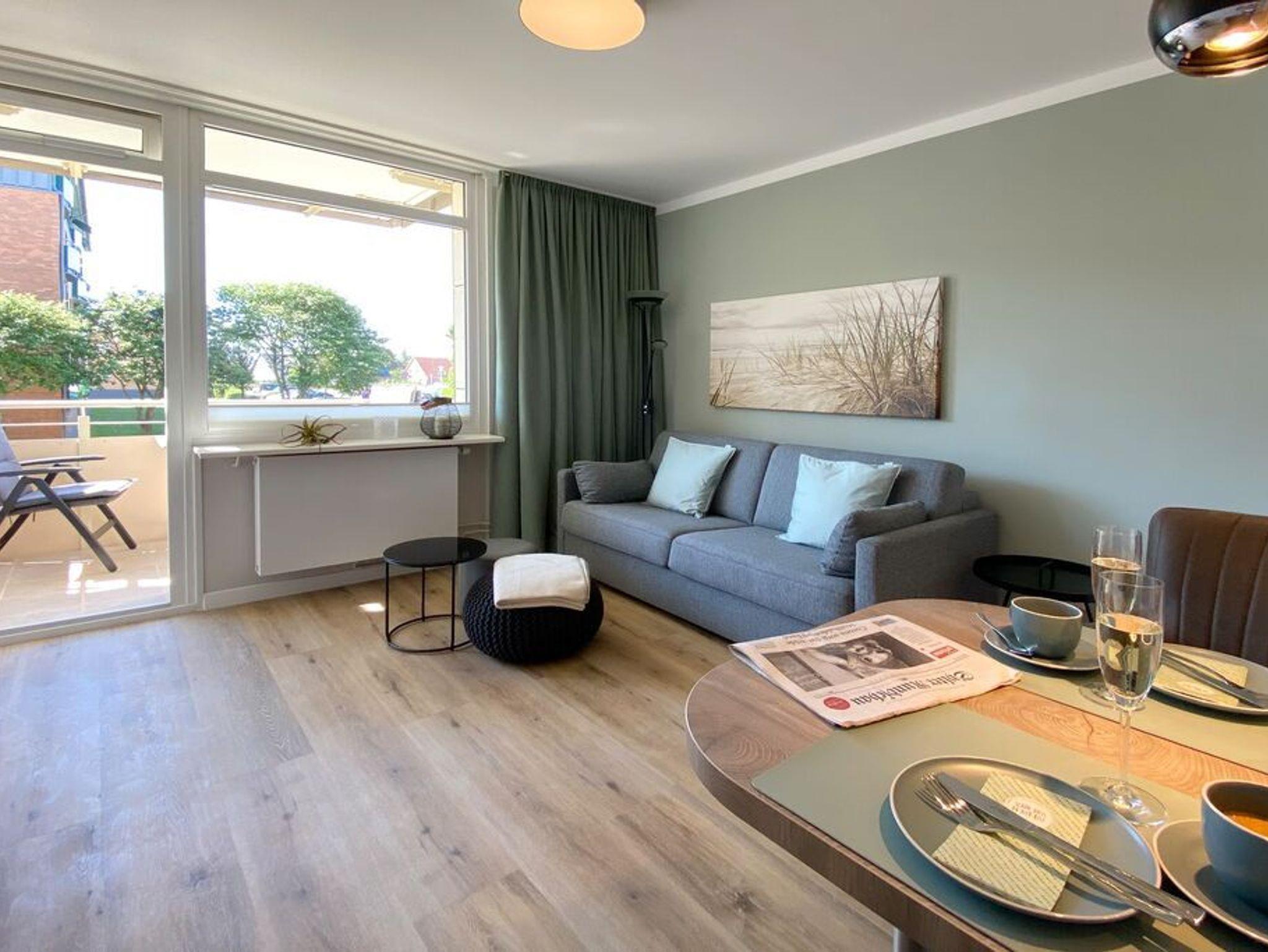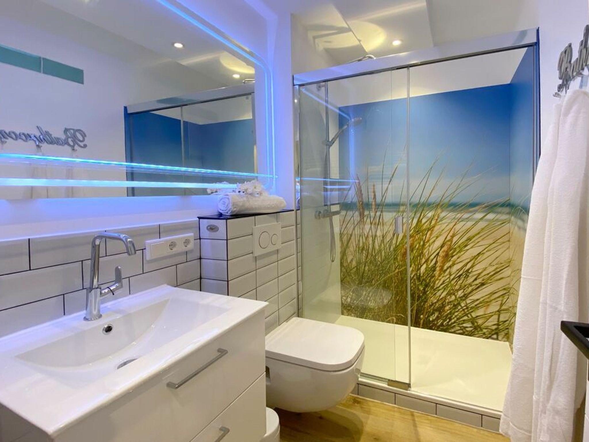Im Frühjahr 2020 wurde diese Ferienwohnung für 2 Personen komplett saniert und neu eingerichtet. Wohnbereich mit integrierter Küche, Couch zum Relaxen, Smart-TV und Zugang zum Süd-Balkon in bester Lage beim Süd-Wäldchen und kurzen Wegen zum Strand. Modernes Badezimmer mit großzügiger Erlebnisdusche, Waschbecken, Handtuchwärmer und WC.