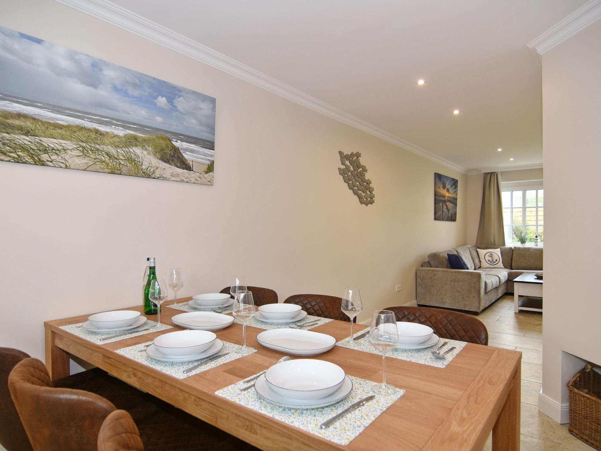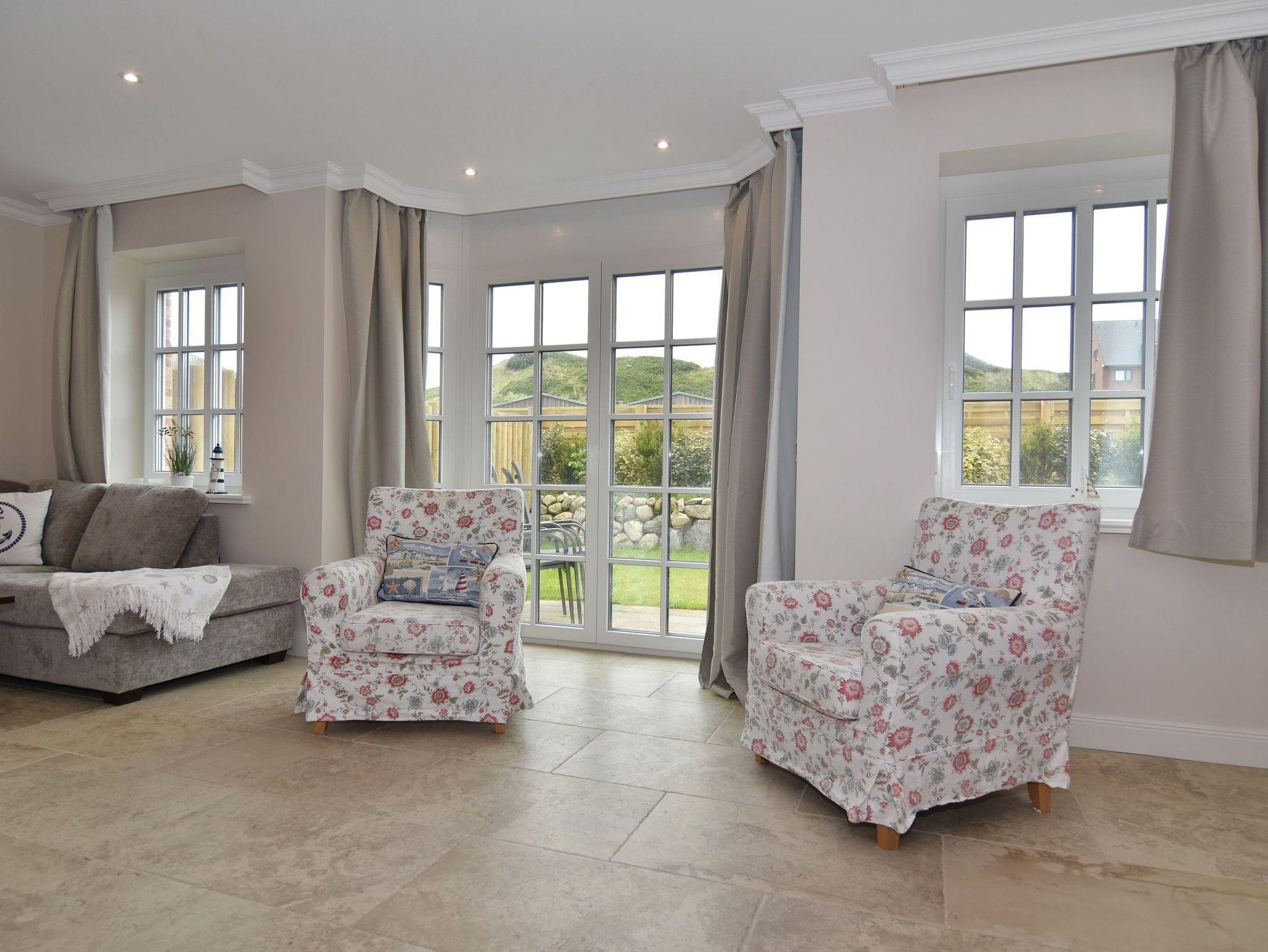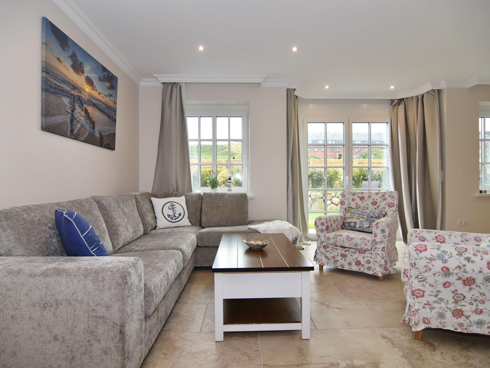 Großzügige Doppelhaushälfte in zentaler und strandnaher Lage Westerlands. EG: Wohnraum mit Essplatz, Sitzecke, TV, Kamin, offene Küche mit Kühlschrank, Backofen, Mikrowelle, Ceranfeld, Geschirrspüler, Kühlschrank und Gefrierschrank. Garten mit Südterrasse und Terrassenmöbeln. Gäste-WC, Heizungs-/Abstellraum mit Kinderreisebett (120x60, ohne Matratze und Bettzeug) und Kinderhochstuhl. OG: 2 Schlafzimmer mit Doppelbetten (180x200, 2 Matratzen), 1 Schlafzimmer mit 2 Einzelbetten (je 90x200). Alle Schlafzimmer mit Kleiderschrank und TV. Ein Bad ensuite mit großer bodentiefer Dusche, Waschmaschine und Trockner, ein Bad mit Wanne mit Duschvorrichtung, das vom Flur aus begehbar ist. Parkmöglichkeiten am Haus für maximal 2 Pkws. Fahrräder können derzeitig im Garten, später auch in der Garage abgestellt werden. Tierhaltung ist gestattet und muss kostenpflichtig angemeldet werden. Der Garten ist komplett eingezäunt. Rauchen im Objekt ist nicht gestattet.