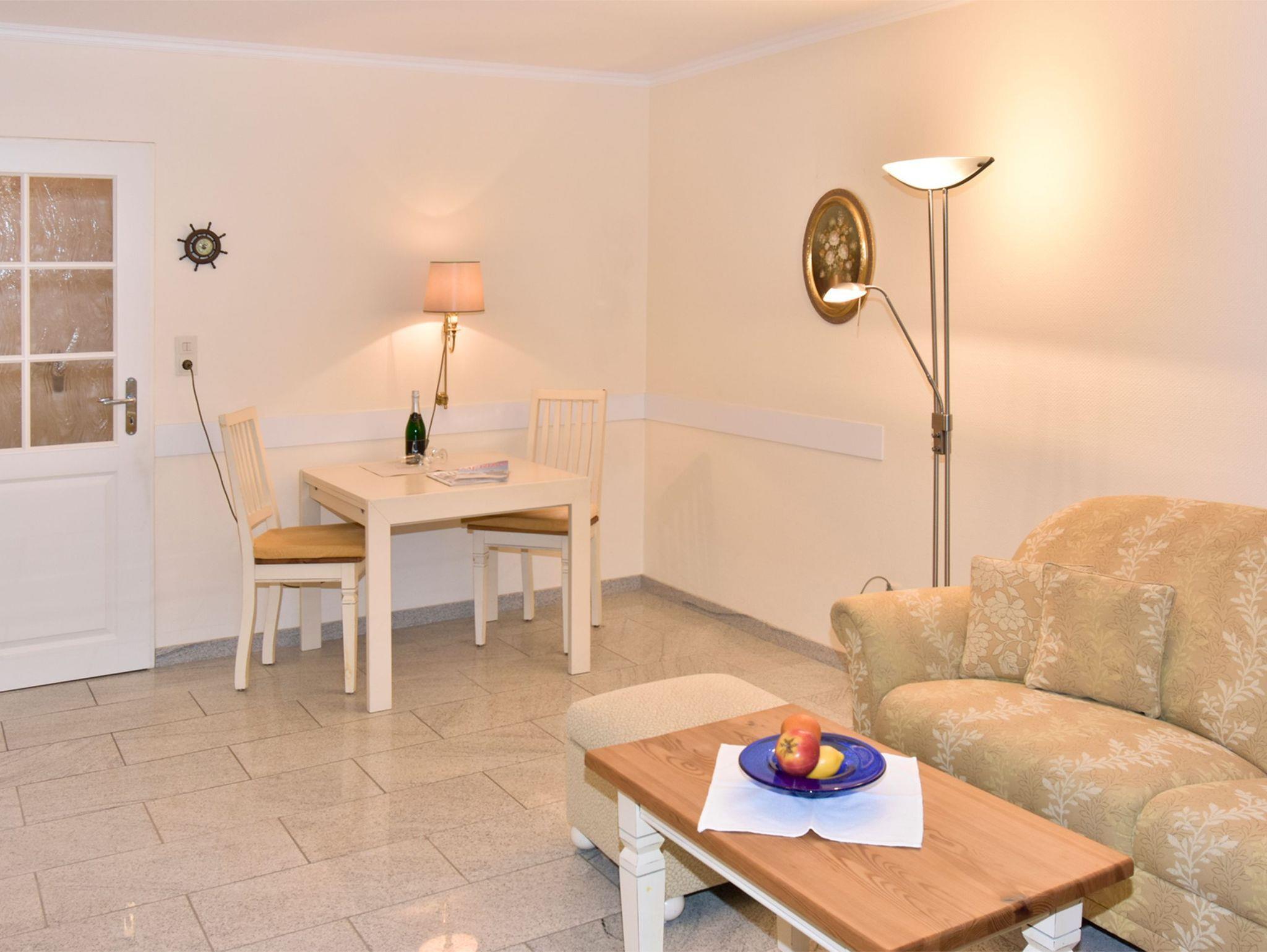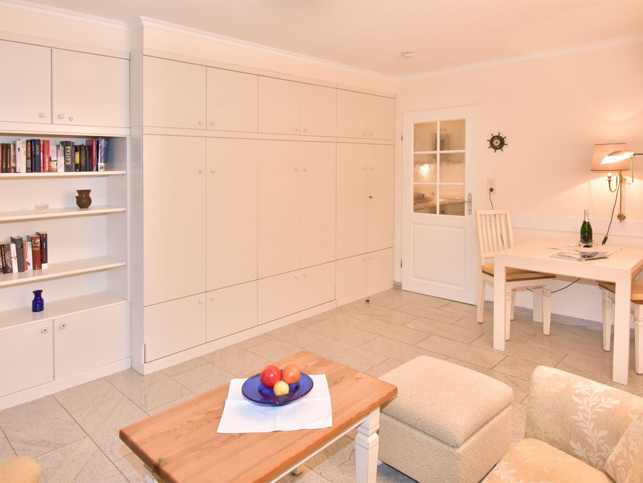 Der Wohn-/Schlafraum besteht aus einer gemütlichen Sitzgarnitur (Zweisitzer und Sessel mit Fußhocker), einem Doppelschrankbett (einzeln klappbar), einem Essplatz, Kabel-Flachbild-TV, Radio und kostenlose Internetnutzung per W-Lan.