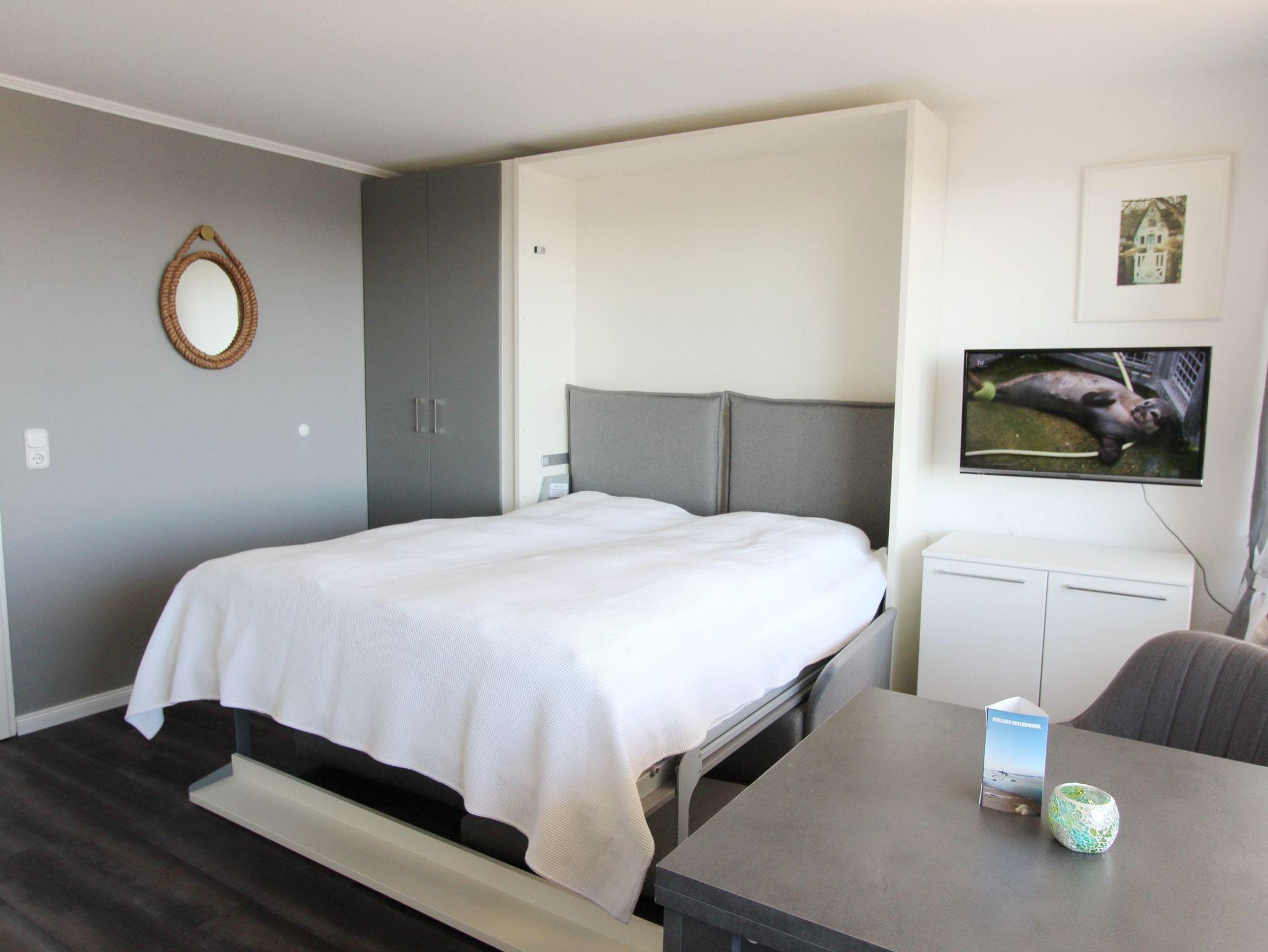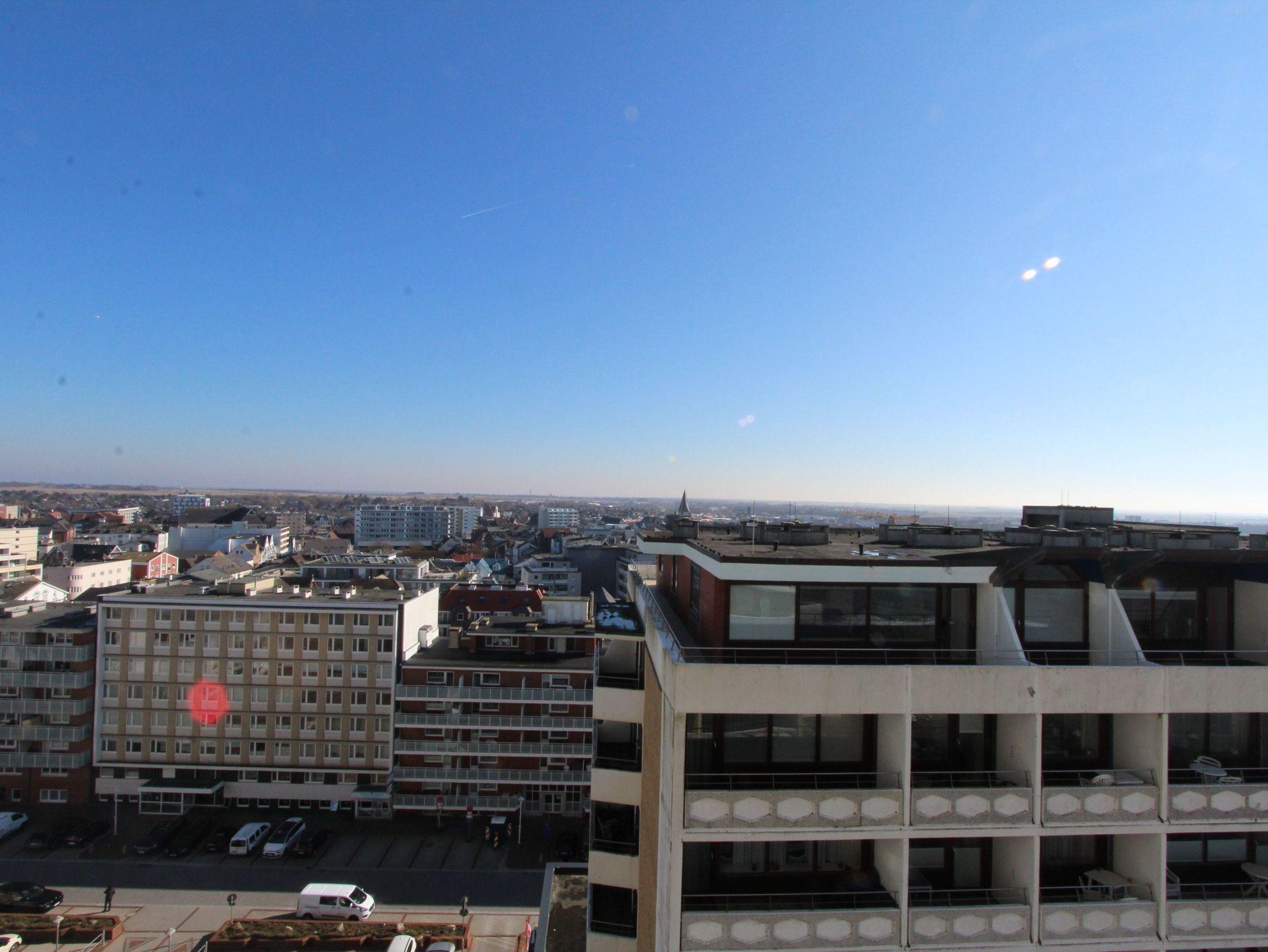 Einzimmerwohnung in der 9. Etage im Haus Metropol mit herrlichem Weitblick über die Insel und die Stadt Westerland. Bei klarem Wetter können sie bis zum nordfriesischen Wattenmeer und dem Festland schauen. Der kombinierte Wohn-/Schlafraum hat einen vorgelagerten großen Ostbalkon mit Balkonmöbeln und Auflagen. Ein Doppelschrankbett, ein Essplatz mit 2 Stühlen am Fenster, eine Couch und 2 Fernsehsessel mit Fusshockern und viel Schrankfläche, für Ihre persönlichen Dinge, steht ihnen zur Verfügung. Im Wohnraum wurde Designboden verlegt. Das Badezimmer hat eine Dusche, einen Duschhocker und einen Handtuchtrockner. In der separaten Küche mit Mikrowellen Backkombination, Ceranfeld mit 4 Herdplatten, Geschirrspüler und zusätzlicher Senseo Padmaschine können sie sich selbst verpflegen. Zur technischen Ausstattung dieser Wohnung gehört: ein Flachbildfernseher und ein Radio mit CD Player. Das freie WLAN Netzwerk Hotspot (WEG Haus Metropol - Passwortfrei - ohne Gewähr) steht ihnen kostenfrei zur Verfügung. Wohnungsgröße ca. 38 m².