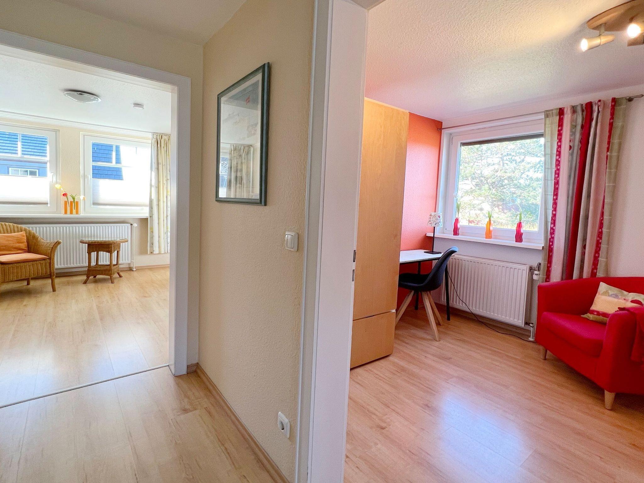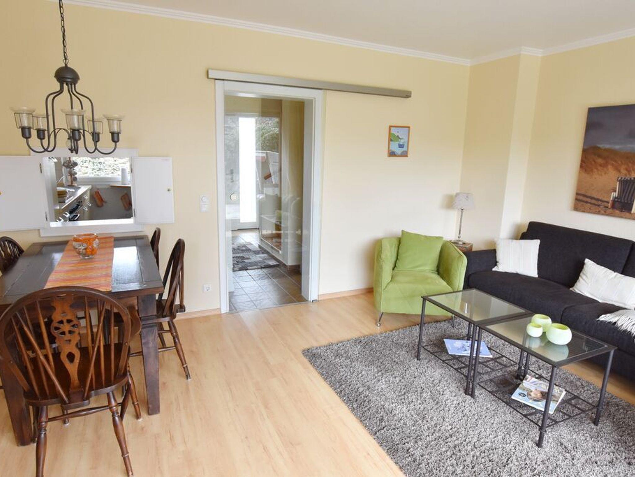 Erdgeschoss: Wohnzimmer mit Essecke und Sitzgruppe. Separate Küche mit Durchreiche zum Wohnzimmer und ein Gäste-WC