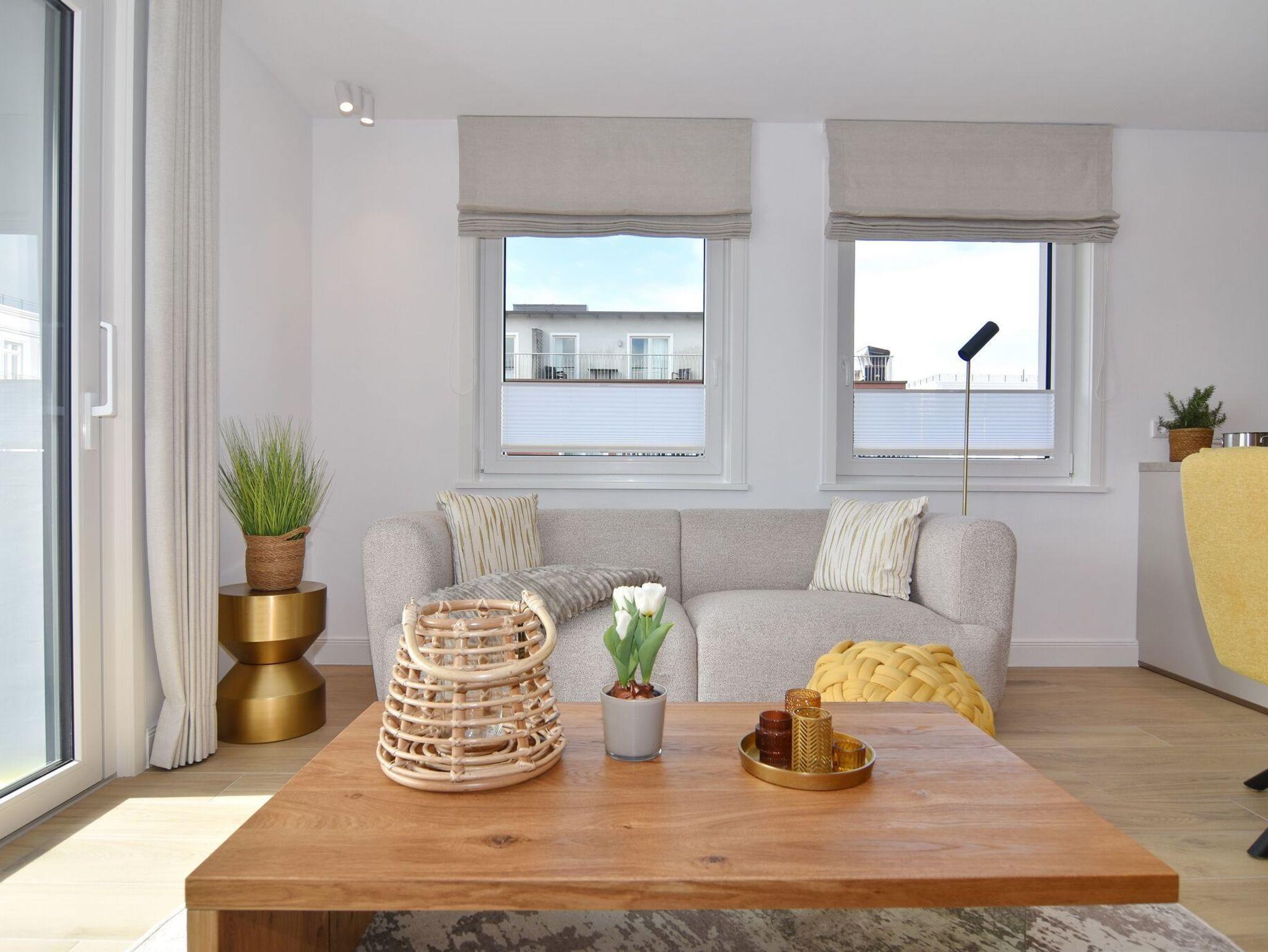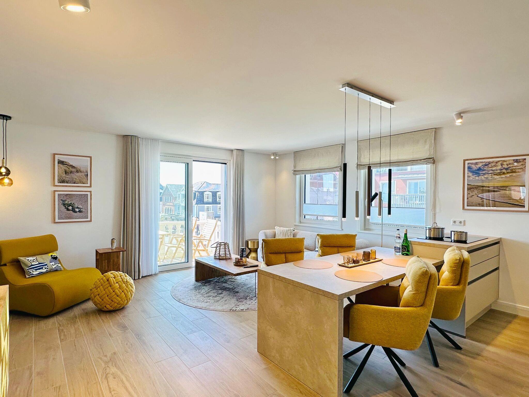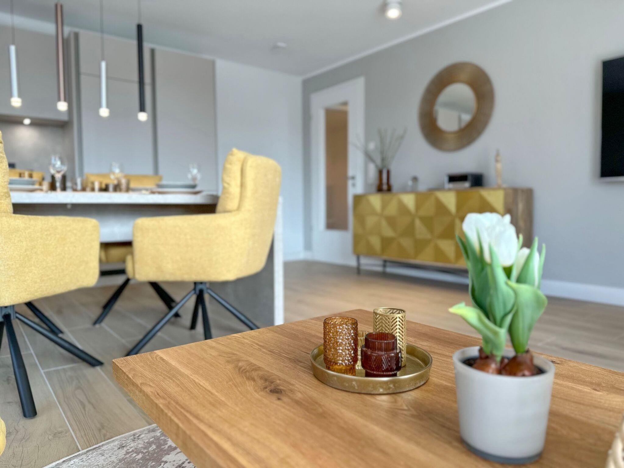 Die hochwertige 3-Zimmer-Wohnung im 2. OG mit ca. 81 qm ist für maximal 4 Personen. Vom geräumigen Flur mit Garderobe gelangen Sie in das Wohnzimmer mit offener Küche und möblierten Südbalkon. Die hochwertige Küche bietet neben Bora Induktionsherd auch Geschirrspüler, Tiefkühlschrank und Backofen mit integrierter Mikrowelle. Beide Schlafräume bieten mit Boxspringbetten (180x200 und 200x200) der Marke FBF hochwertigen Schlafkomfort und verfügen über Einbauschrank und TV (1 Kinderbett ist in beiden Schlafzimmern zubuchbar). Die Wohnung verfügt über 2 moderne Duschbäder mit Haar- und Handtuchtrockner. Die Wohnung ist mit großformatigen Fliesen ausgelegt und verfügt über Fußbodenheizung. Lediglich die Schlafräume sind mit Teppichware versehen. Internet (ohne Gewähr) und Smart-TV sind vorhanden.