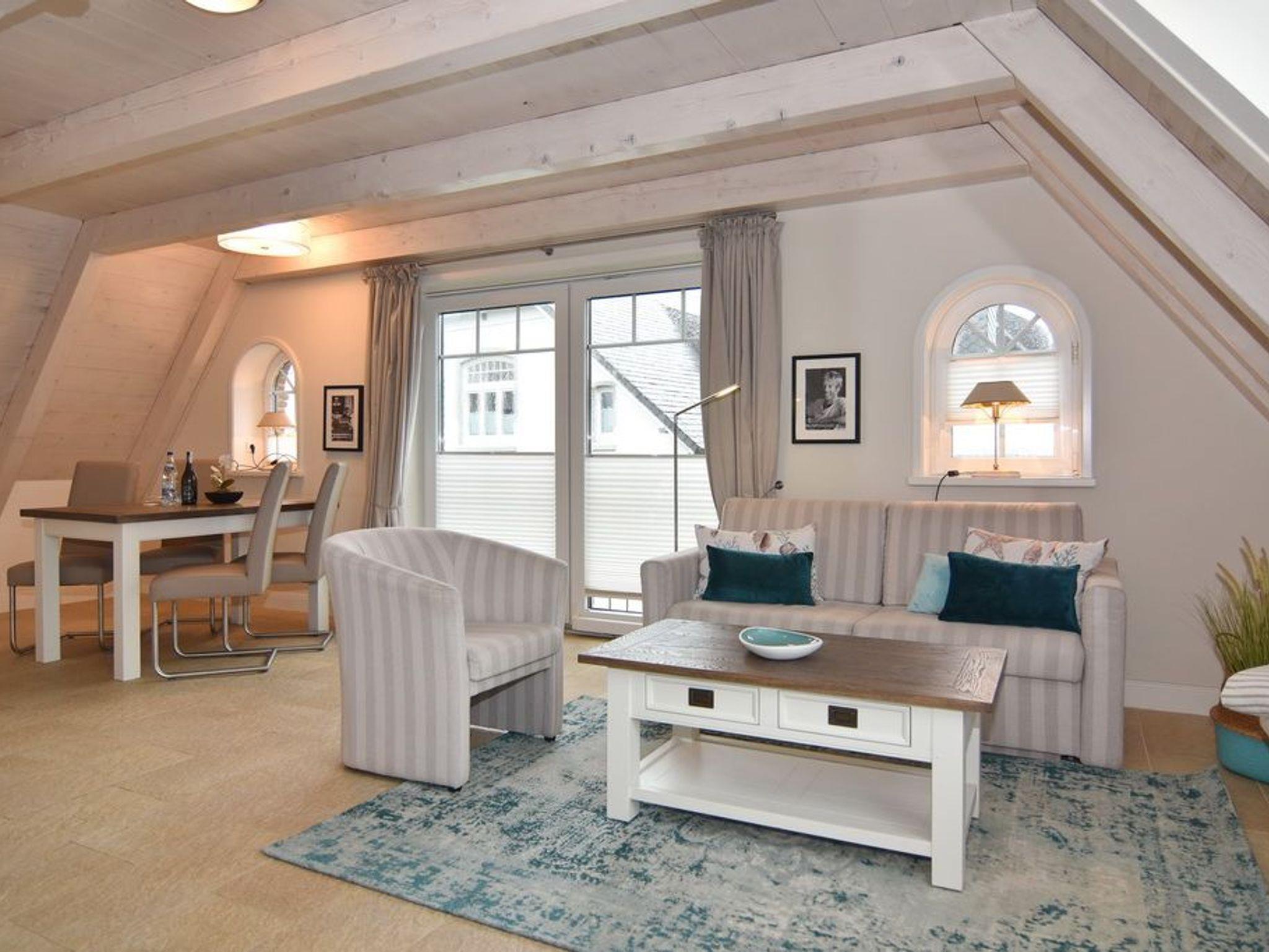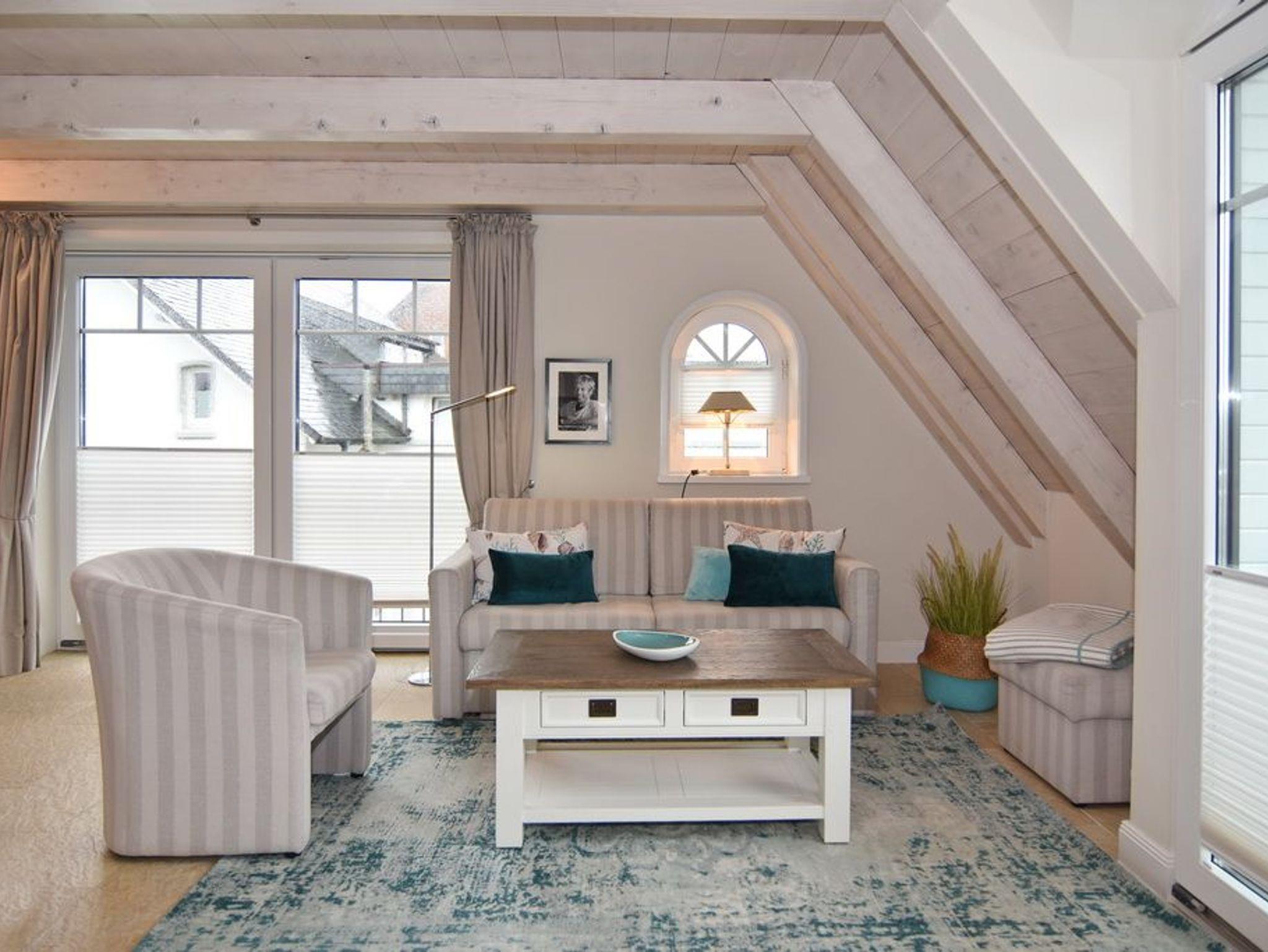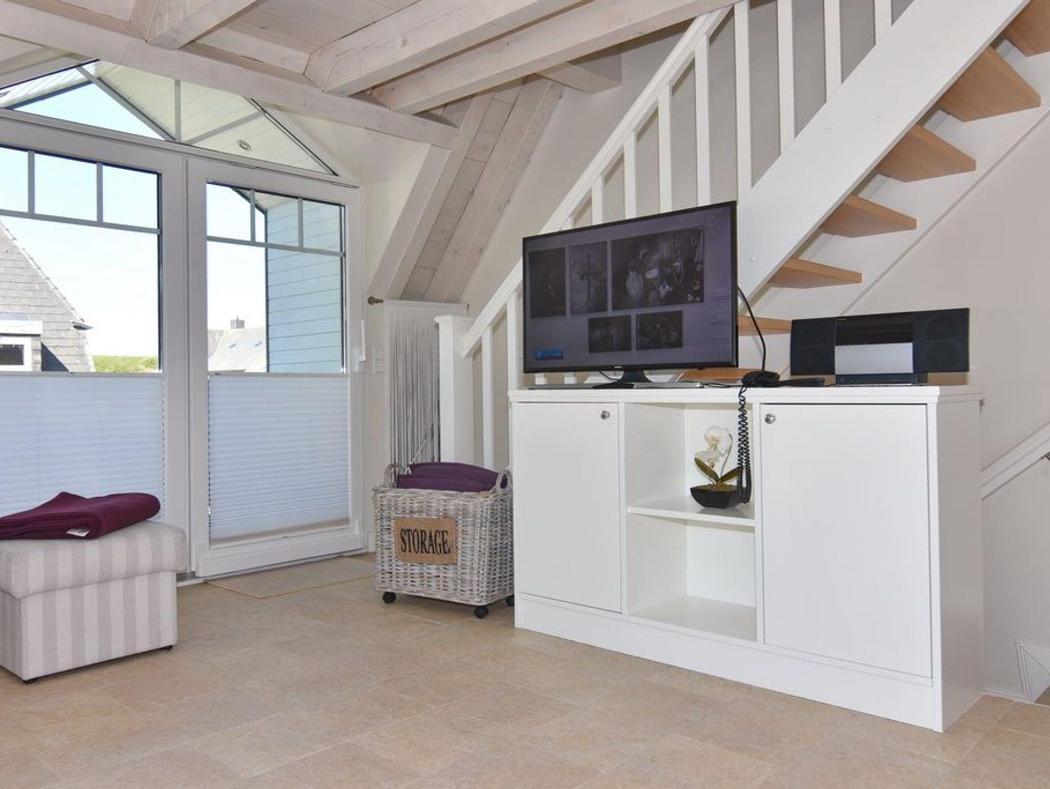 Schöne 2-Zimmer-Ferienwohnung in direkter Lage am Strandübergang. Nichtraucher-Whg.! Ca. 60m². EG: Vorflur mit Garderobe, offene Treppe ins OG. Sonniges Wohnzimmer mit Couchecke, Essplatz sowie integrierter Küche mit Geschirrspüler, Mikrowelle und Backofen, Flatscreen/Stereoanlage, W-Lan (ohne Gewähr), Duschbad/WC, Westbalkon mit Balkonmöbeln. offene Treppe aus Wohnzimmer ins DG: Schlafzimmer mit Doppelbett (2x90x200) und Flatscreen, Gäste-WC. Pkw-Stellplatz kann kostenlos gebucht werden. Bettwäsche und Handtücher sind zur Anreise aufgezogen!
