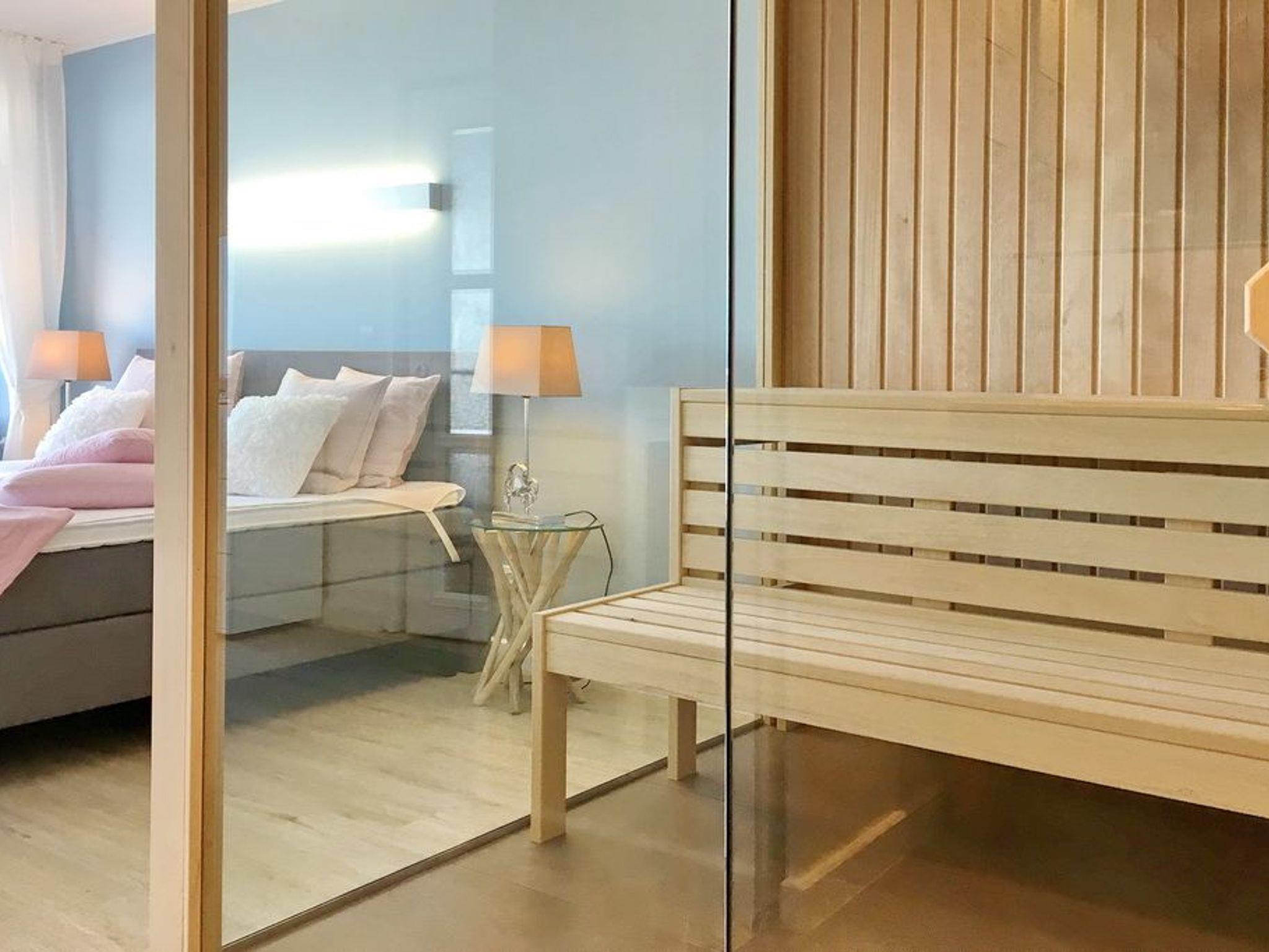 Das ist nicht zu toppen. Diese exklusive 2-Zimmer-Ferienwohnung im Haus Metropol bietet neben einer wunderschönen Ausstattung eine Sauna mit Blick auf das Meer. Genießen Sie auf 76m² ein elegantes Wohnzimmer mit geräumiger Sitz- und Essecke und einer Küche, die keine Wünsche offen lässt. Der freie Küchenblock bietet viel Arbeitsfläche, so dass hier jeder kulinarischer Traum erfüllt werden kann. Die Sitzecke lässt sich zu einer Schlafgelegenheit mit einer Liegefläche von 140 x 200 cm umfunktionieren. Das separate Schlafzimmer mit Doppelbett (2x90x200), Kleiderschrank und Flat-TV verfügt genauso wie das Wohnzimmer über einen eigenen Westbalkon. Direkt ans Schlafzimmer angrenzend befindet sich die finnische Sauna mit großer Panoramascheibe, so dass Sie von hier aus auf das Meer schauen können. Zwei Duschbäder mit Regenduschen sorgen für die entsprechende Abkühlung. Ein Abstellraum mit Schrankfläche bietet nochmals Platz für Kleidung und Gepäck. Diese Wohnung ist eine strikte Nichtraucher-Wohnung, Tierhaltung ist hier nicht gestattet. Ein PKW-Stellplatz kann kostenpflichtig gebucht werden. Bettwäsche und Handtücher sind zur Anreise aufgezogen.