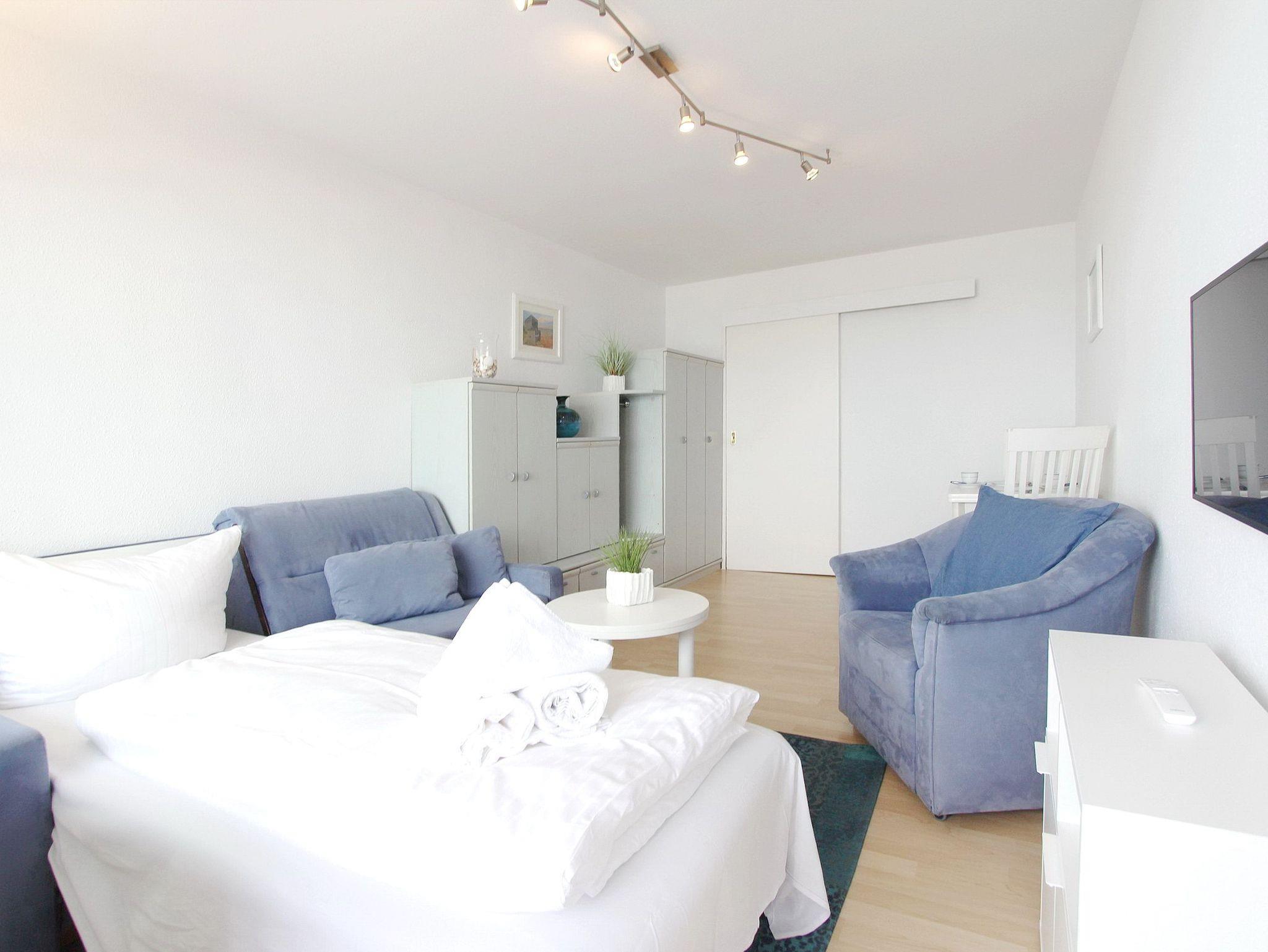 Gemütliche Einzimmerwohnung in der 1. Etage im Haus Metropol mit schönem Blick auf die Nordsee. Wohn-/Schlafraum mit Laminatboden und vorgelagertem Westbalkon mit Balkonmöbeln. Die Wohnung ist ausgestattet mit einem Schlafsofa, einem Fernsehsessel, einer Schrankwand und einem Essplatz mit 2 Stühlen. Das Badezimmer hat eine Dusche, einen Handtuchtrockner und Fön. Im Flur befindet sich eine Einbauküche mit 4 Herdplatten, Backofen und einer Nespresso Kapselmaschine. Zur technischen Ausstattung der Wohnung gehört ein Flachbildfernseher und ein Radio. Ein freies WLAN Netzwerk (WEG Haus Metropol - Passwortfrei - ohne Gewähr) steht ihnen kostenfrei zur Verfügung. Diese Nichtraucherwohnung hat eine Größe von: ca. 25 m².