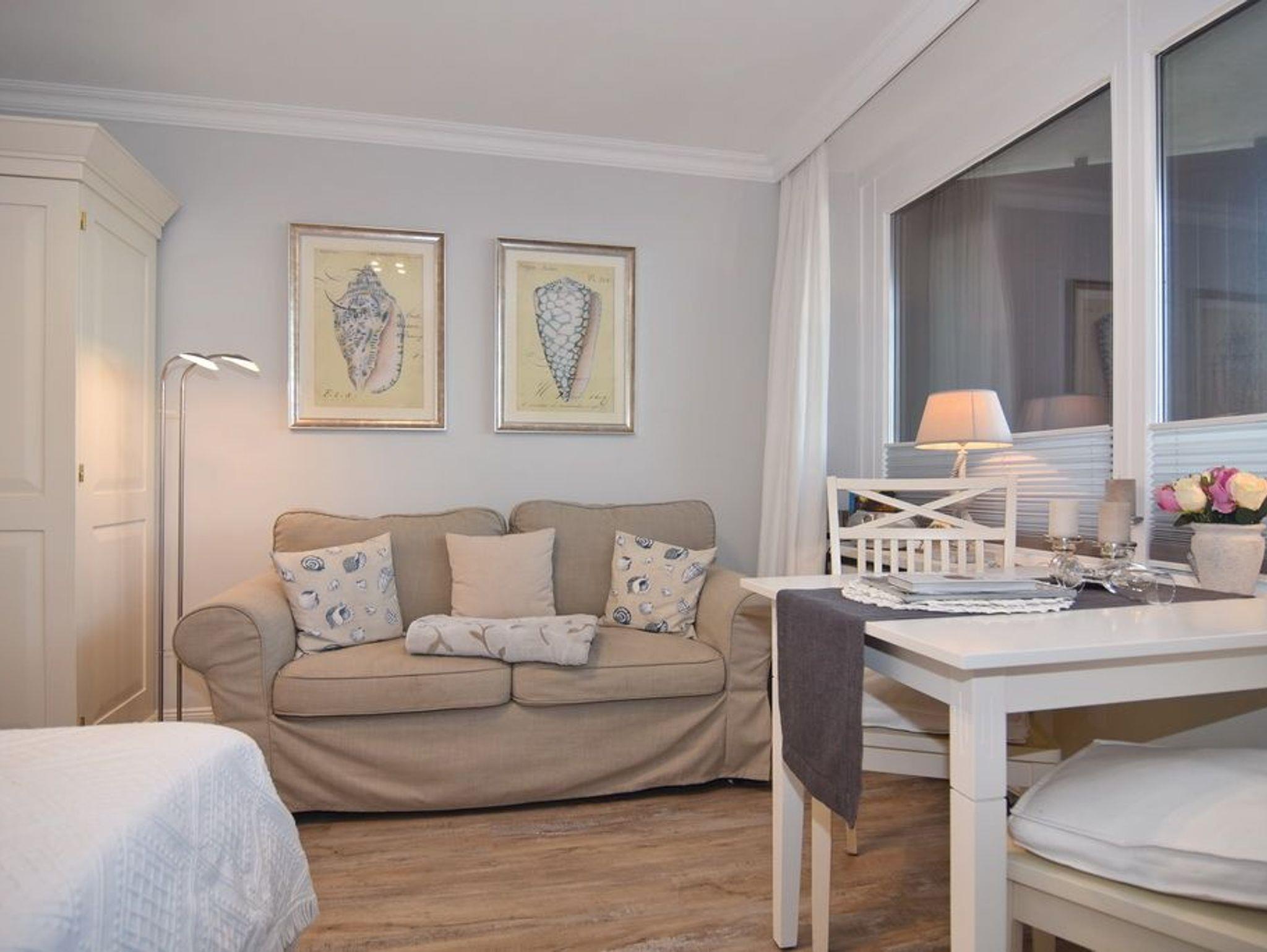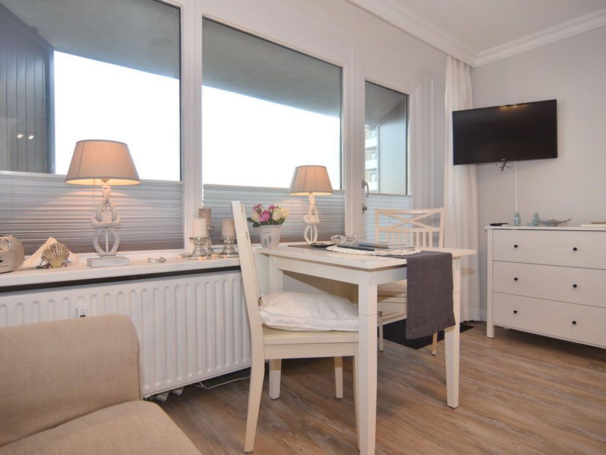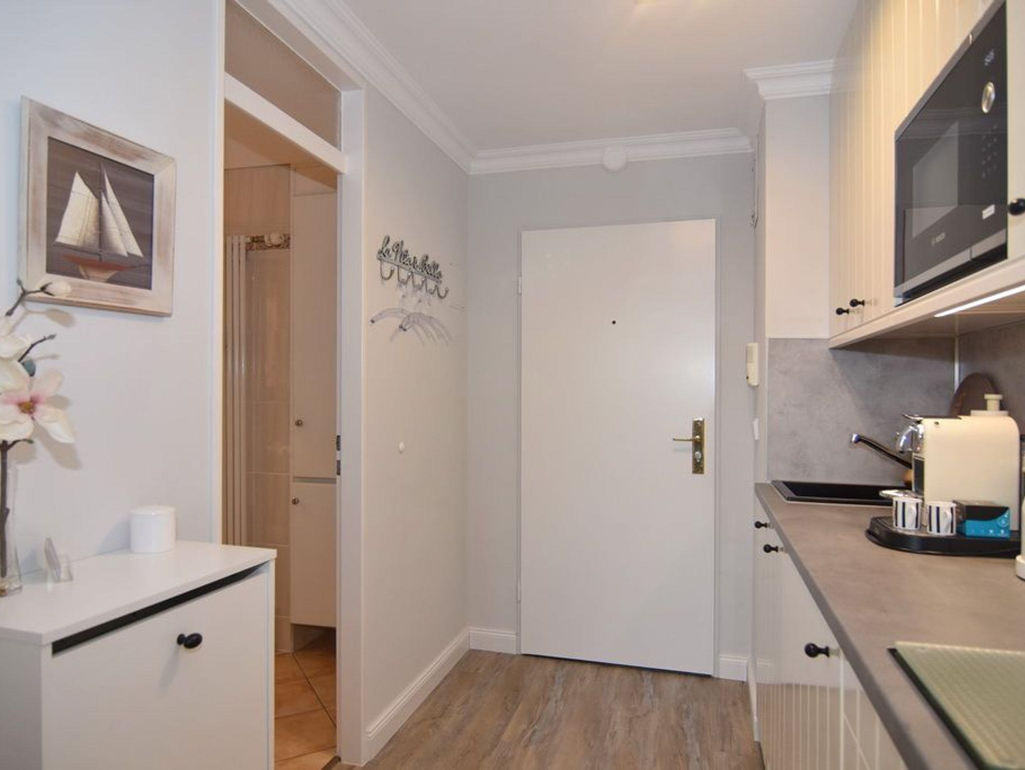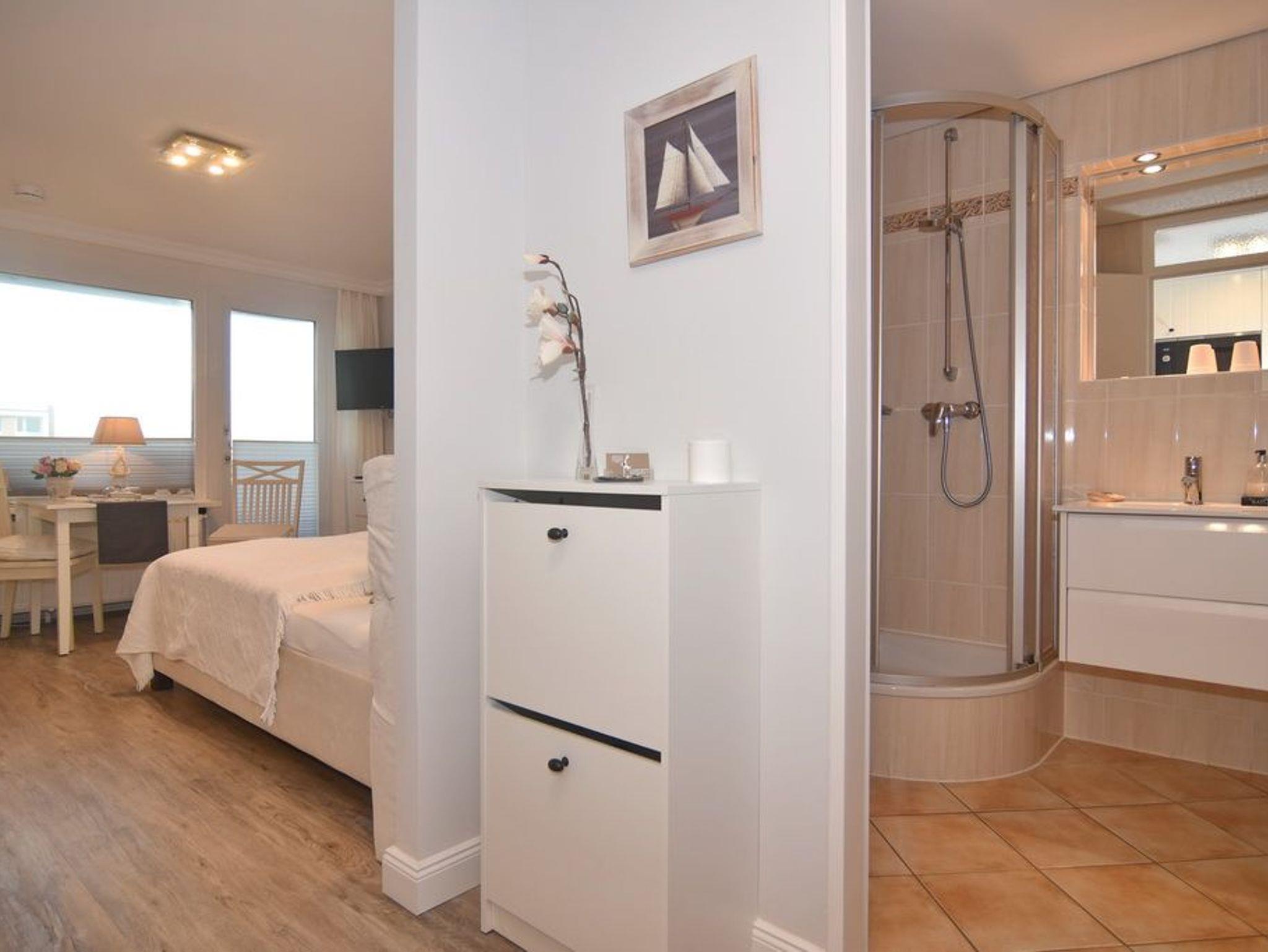 Wunderschöne 1-Zimmer-Wohnung im 3.OG zur Landseite im Haus Metropol. Die Wohnung hat einen kombinierten Wohn- / Schlafraum mit Doppelbett (160x200), 2-Sitzer-Couch und Essplatz am Fenster. Von hier aus gelangen Sie auf den möblierten Ostbalkon. Die offene Küchenzeile verfügt über einen Kühlschrank mit Gefrierfach, 2-Platten-Ceranherd, Geschirrspüler und Mikrowelle. Das Bad ist mit Dusche, Waschtisch und WC ausgestattet. Ein Föhn ist vorhanden. Die Wohnung ist mit einem hellen Designboden in Holzoptik verlegt. Insgesamt ist die Wohnung hell, modern und mit viel Liebe zum Detail ausgestattet. Rauchen und Tierhaltung sind in der Wohnung nicht gestattet. Bettwäsche und Handtücher sind zur Anreise aufgezogen. Ein PKW-Stellplatz kann kostenpflichtig zugebucht werden.