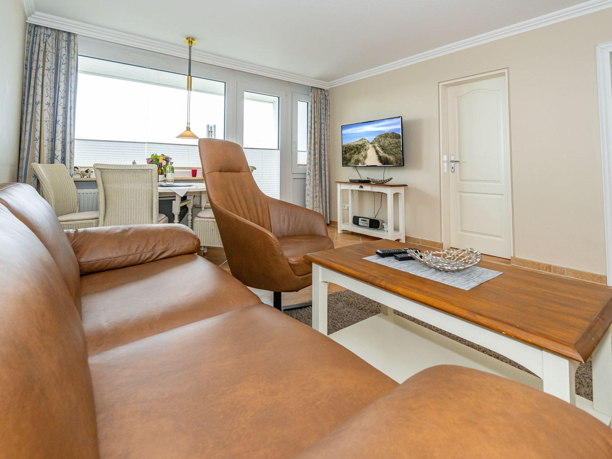 Der Wohnraum besteht aus einer gemütlichen Sitzgarnitur (2-Sitzer-Ledercouch, 2 Sessel), Essplatz, großer Kabel-Flachbild-TV, Radio/CD-Player.