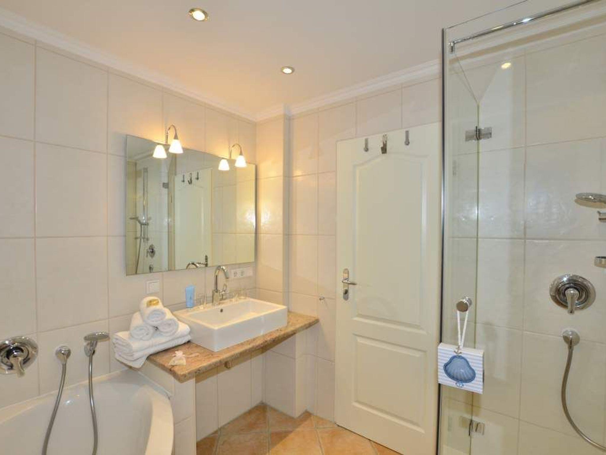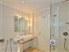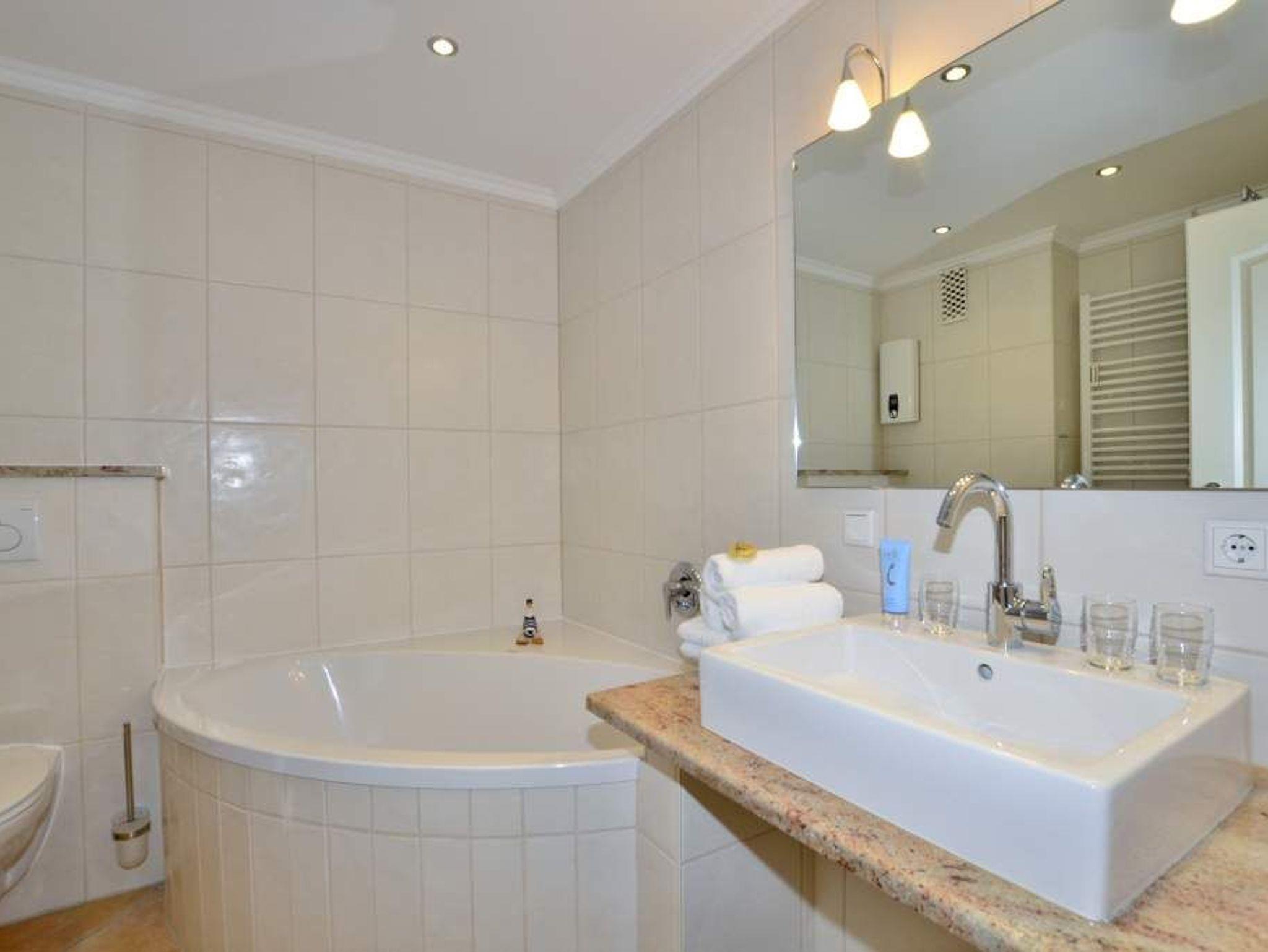 Im modernen, großzügigen Bad befinden sich eine Dusche, eine Eckbadewanne, ein WC, ein Waschtisch, ein Handtuchtrockner und Fön.
