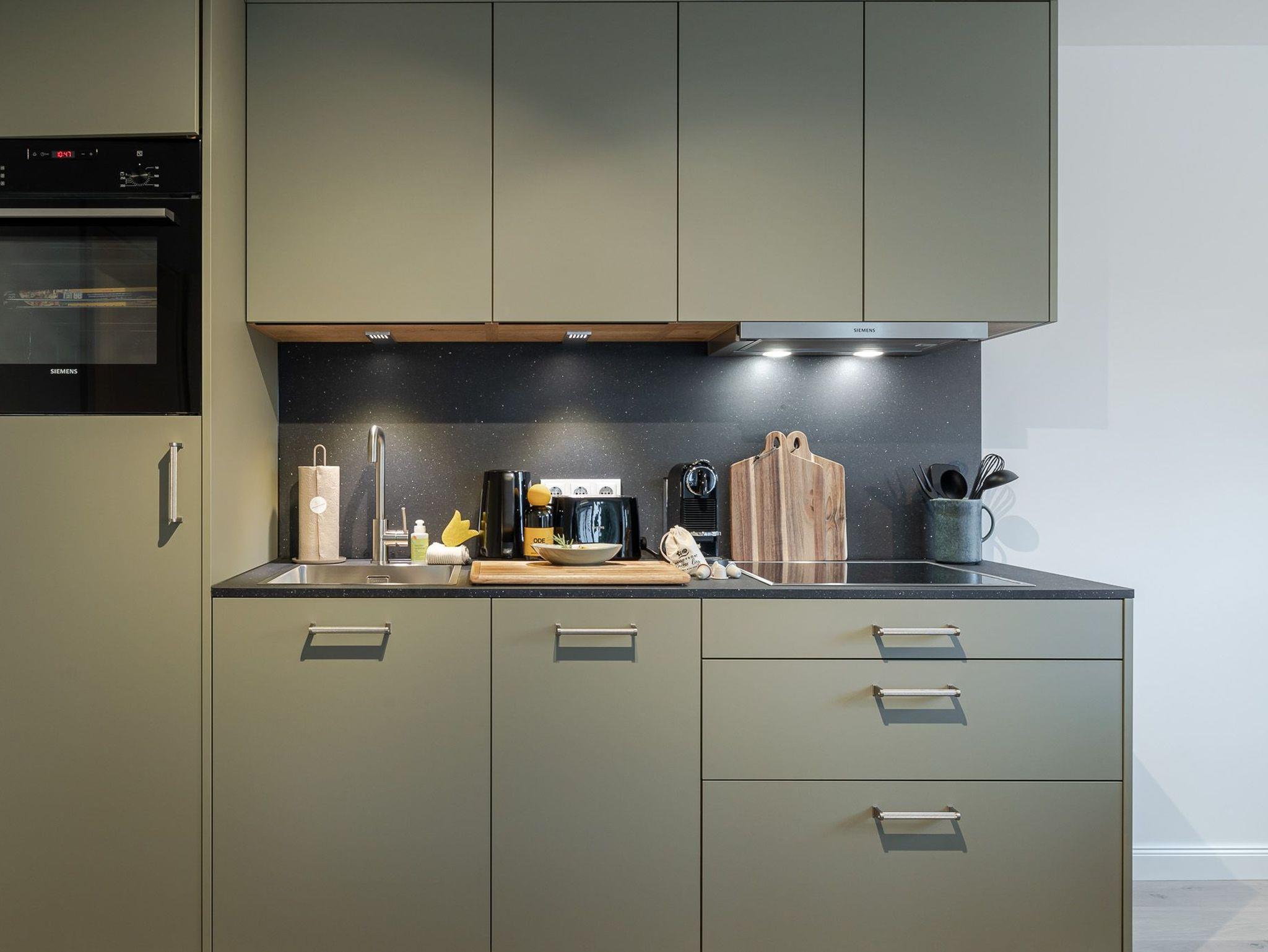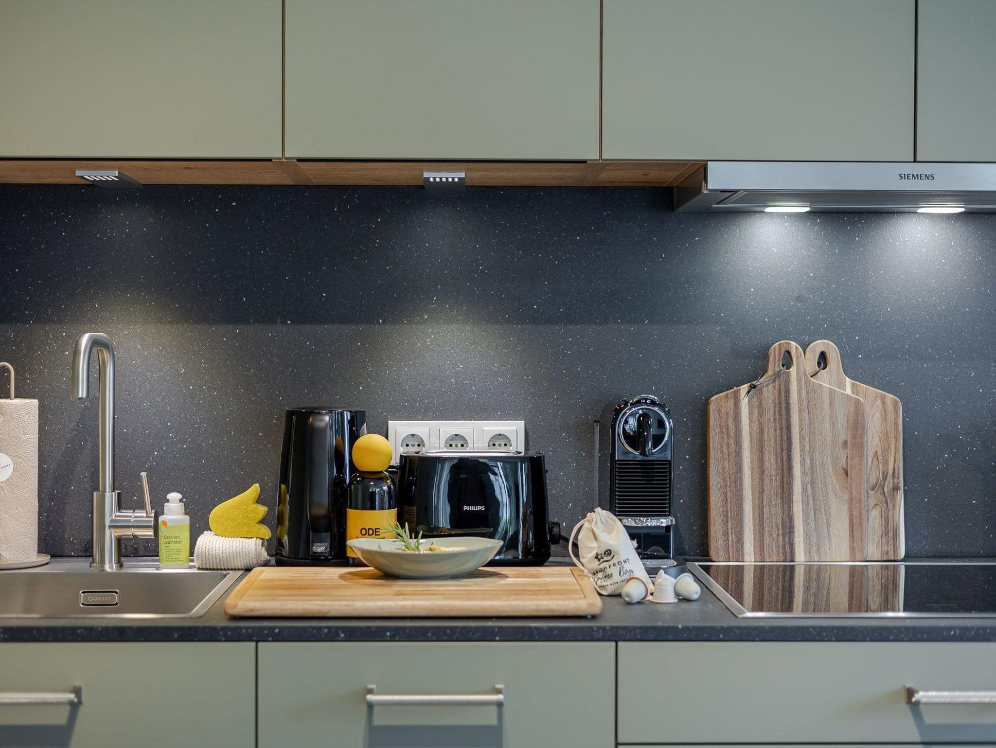 Vom Wohnbereich aus haben Sie den direkten Blick auf die Küche, die mit Markengeräten, z.B. der Firma Miele sowie allerlei nützlichem Equipment ausgestattet ist. Ob ein kleiner Snack oder ein vollwertiges Dinner - hier macht das Kochen einfach Freude.