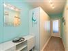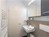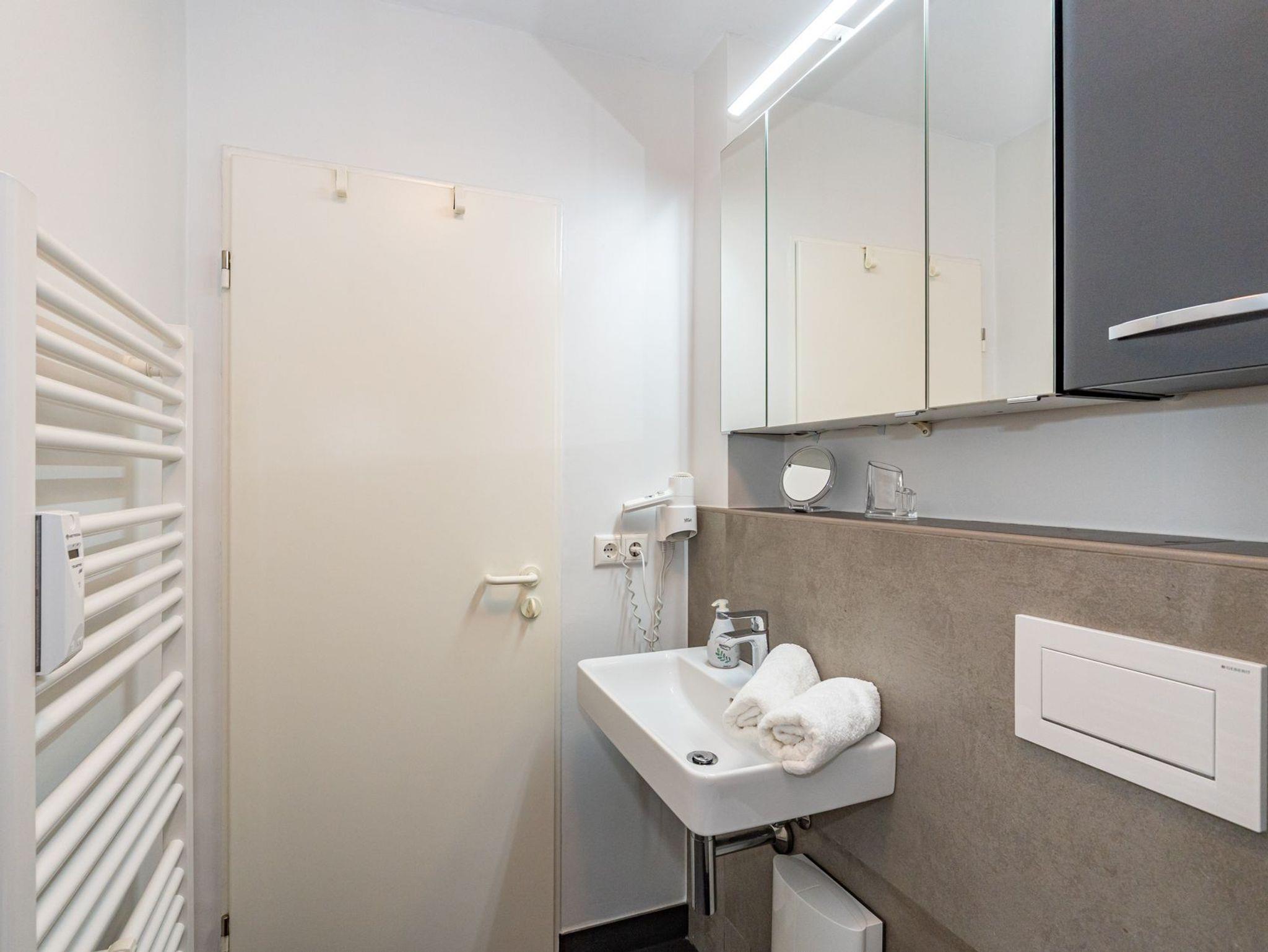 Das moderne Badezimmer ist mit Dusche, Waschtisch, Handtuchtrockner, Fön, Kosmetikspiegel und WC komplett ausgestattet.