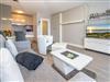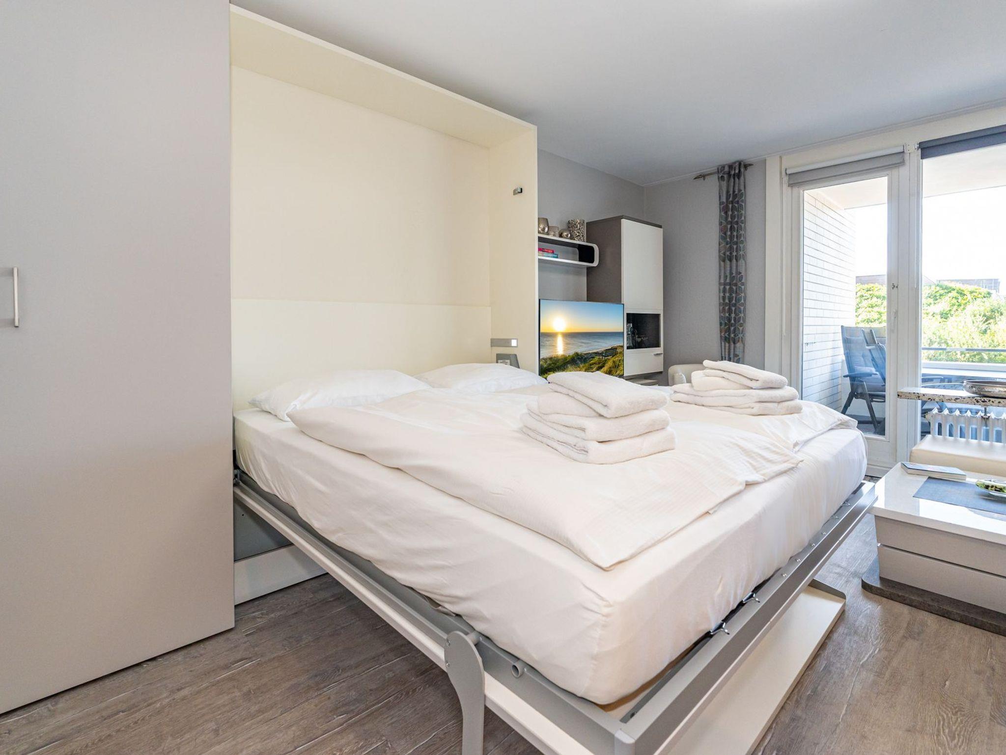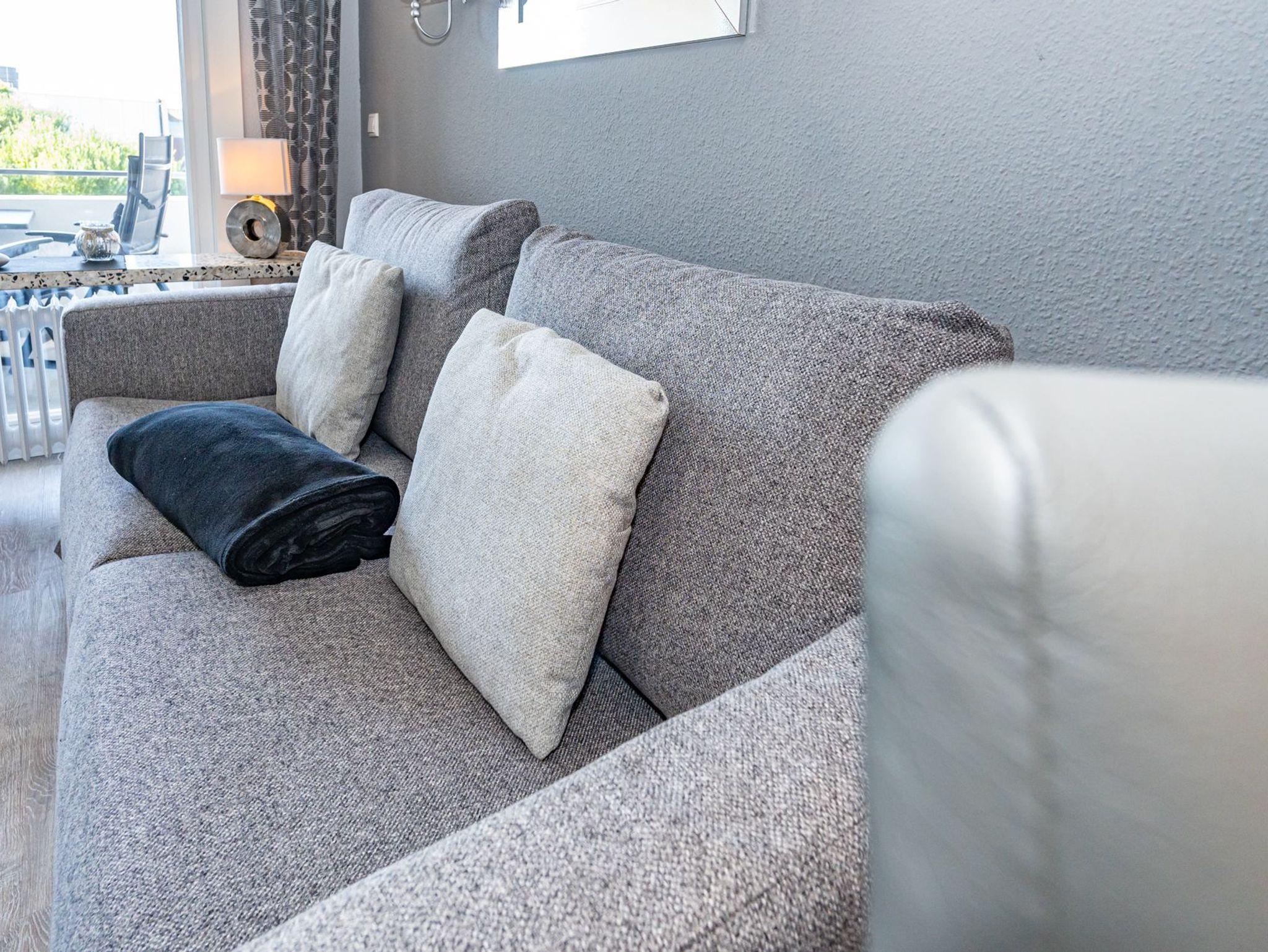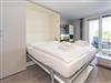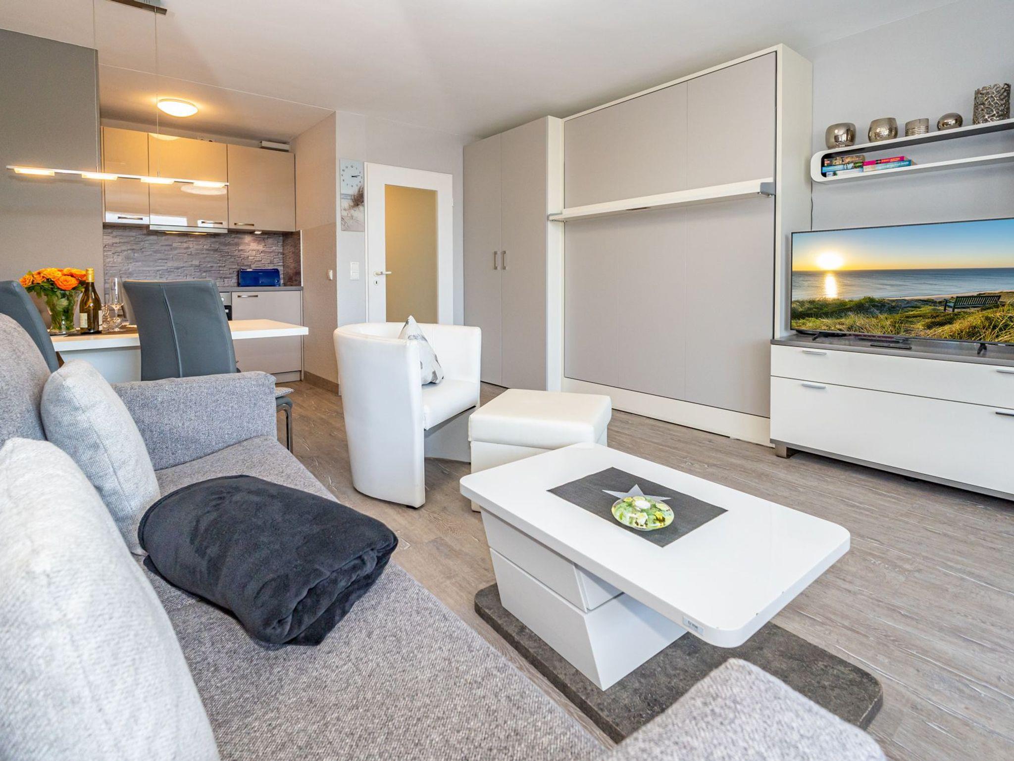 Der Wohnraum mit geschickter Raumaufteilung besitzt ein hochwertiges Sofa und einen bequemen Einzelsessel, sowie ein hochwertiges modernes Doppelschrankbett (Liegefläche ca. 1,60 x 2,00 m, durchgehende Matratze), dass am Tage einfach im Schrank verschwindet. Außerdem steht ein separater Essplatz, Sat-Flachbild-TV, WLAN und eine offene Einbauküche zur Verfügung.
