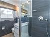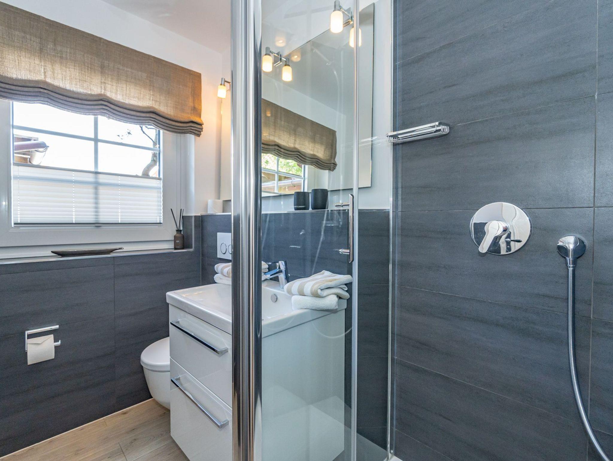 Das Badezimmer mit Fenster ist mit einer Dusche, Waschtisch, Handtuchtrockner, Fön und WC ausgestattet.