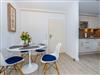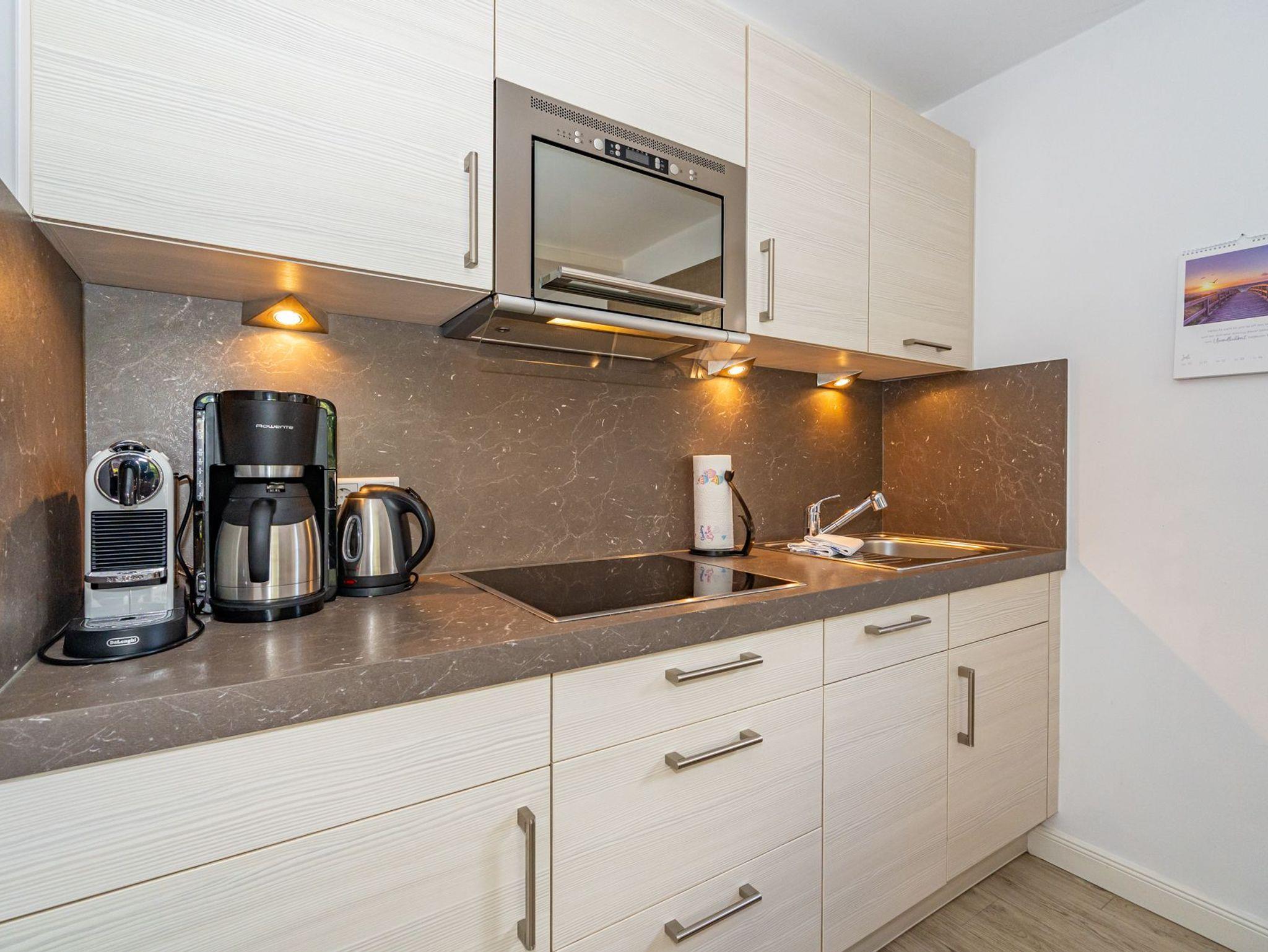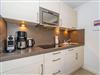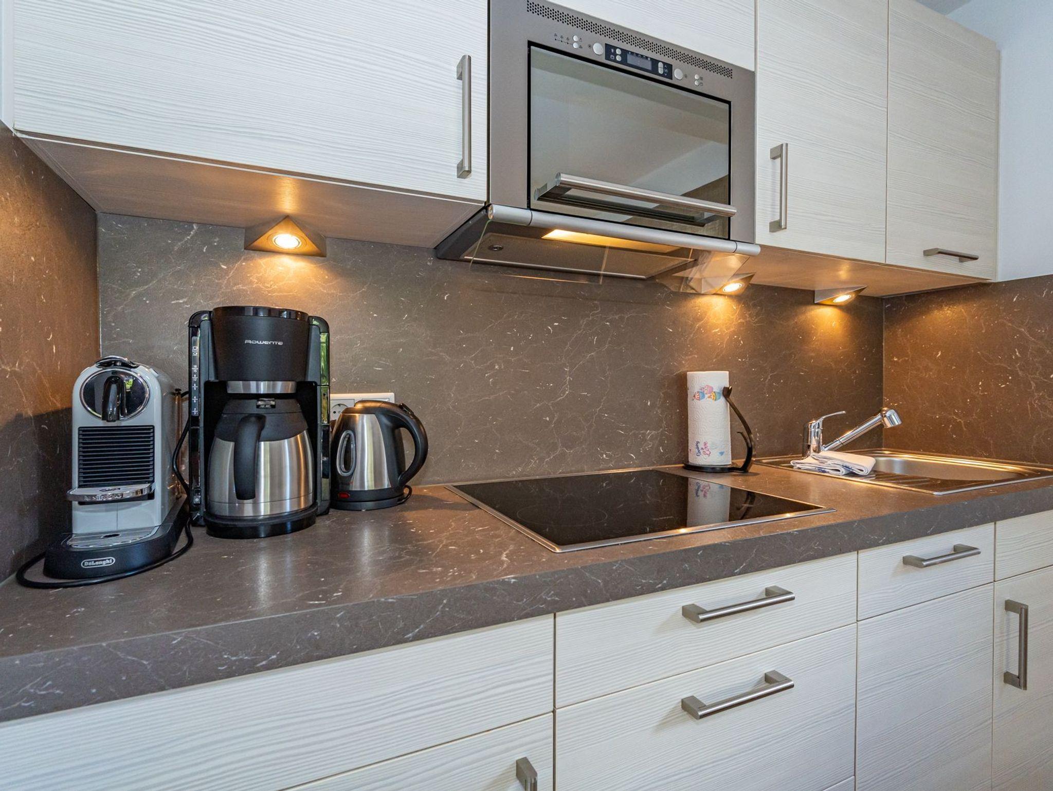 Die offene Einbauküchenzeile im Wohnzimmer besitzt einen Geschirrspüler, ein Ceranfeld und einen Kühlschrank mit 3*-Gefrierfach. Nespresso-Maschine (Kapseln), Kaffeemaschine, Wasserkocher und Toaster gehören zur Grundausstattung.