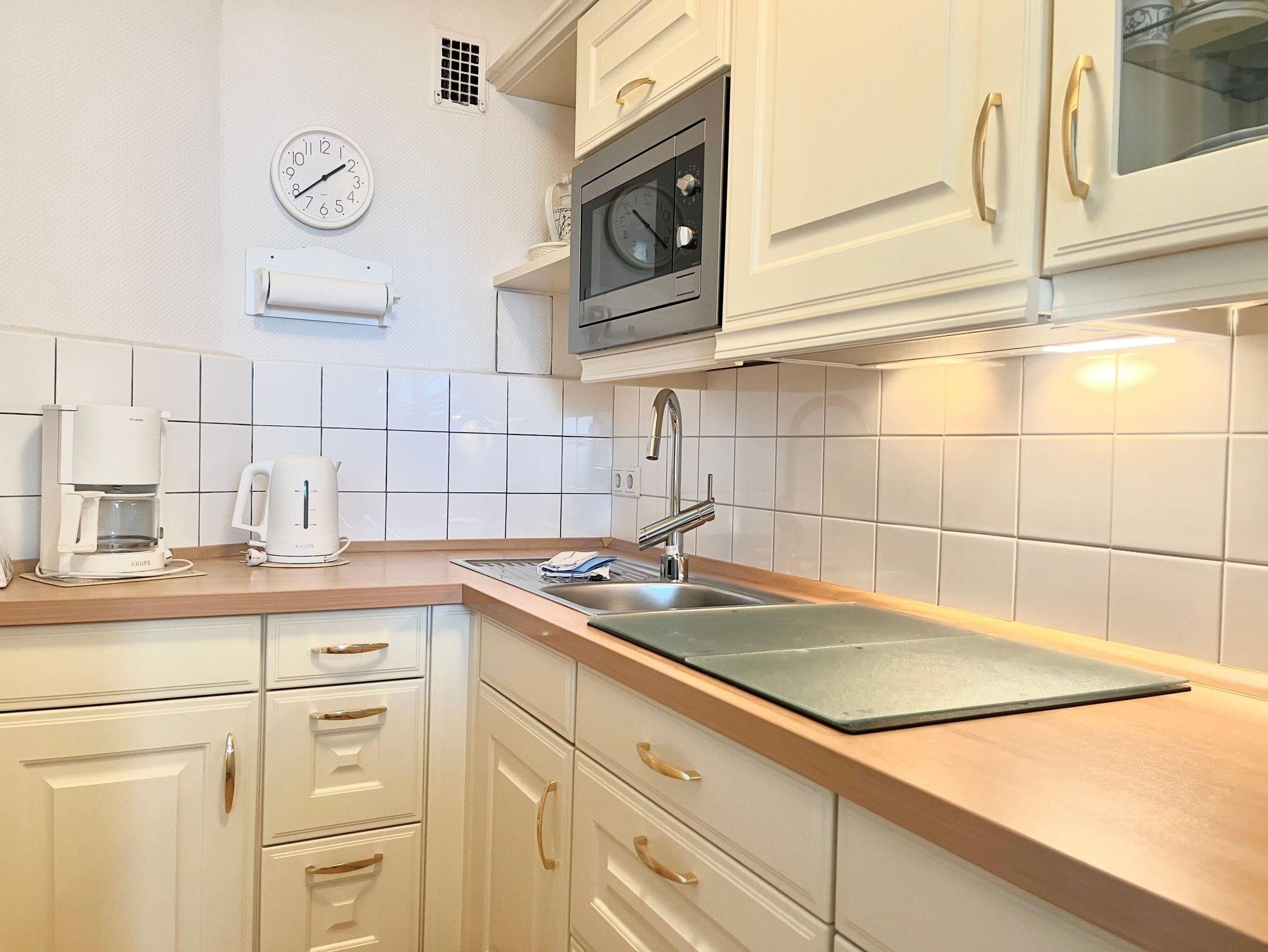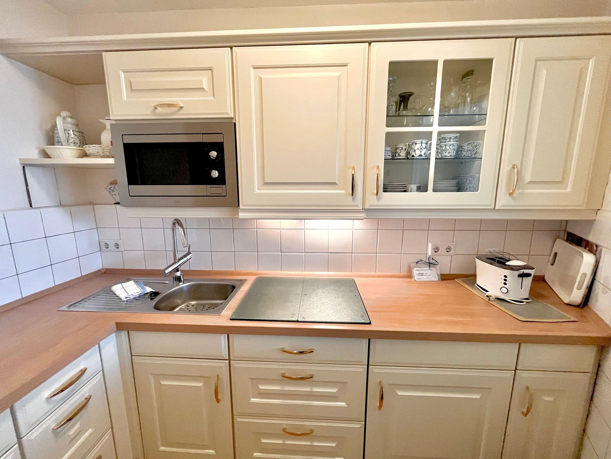 Eine separate Küche mit 4-Platten Ceran Kochfeld, Mikrowelle, Kühlschrank mit Gefriermöglichkeit, Kaffeemaschine, Wasserkocher, Toaster und Geschirr für den täglichen Gebrauch sind selbstverständlich.