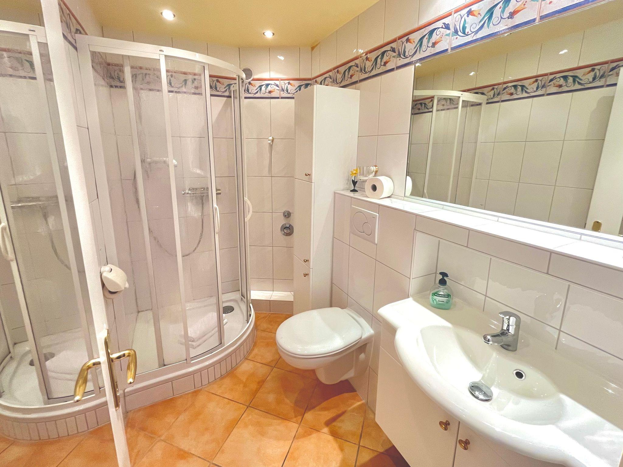 Ein helles Bad mit Dusche, WC, Waschtisch und Föhn.