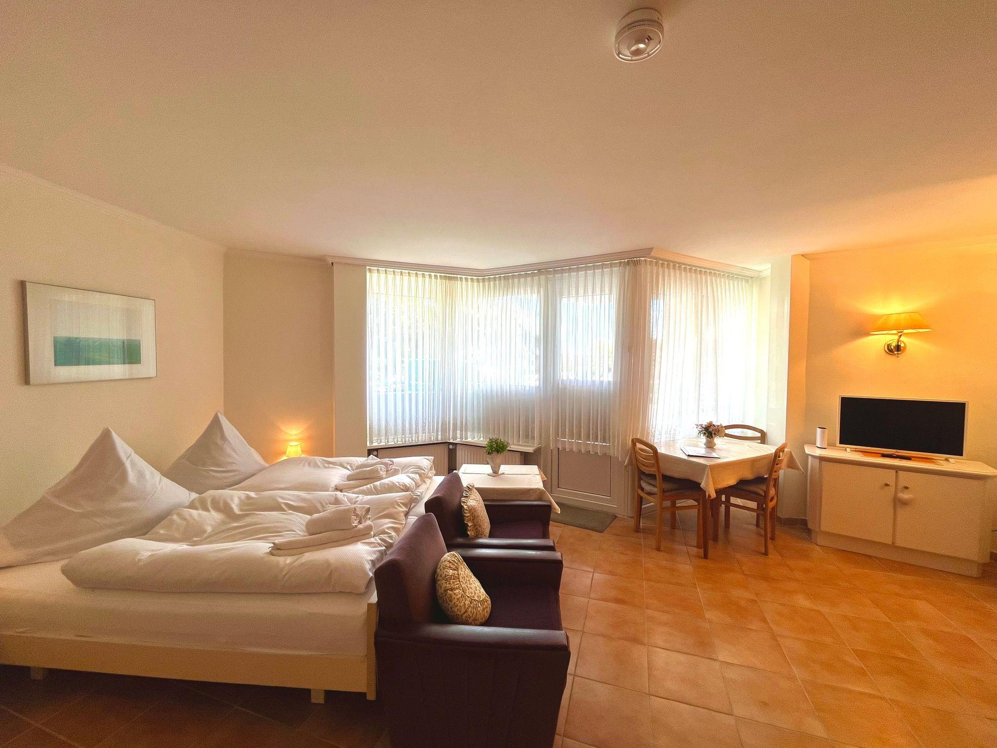 Ein kombinierter Wohn-Schlafraum mit Essecke, 2 Sesseln, Flachbild-TV, Doppelbett, Nachttischen, Leselampen, Kleiderschrank und Sideboard dienen zu Ihrem allgemeinen Wohlbefinden. Bettwäsche und Handtücher sind für Sie bereitgestellt.