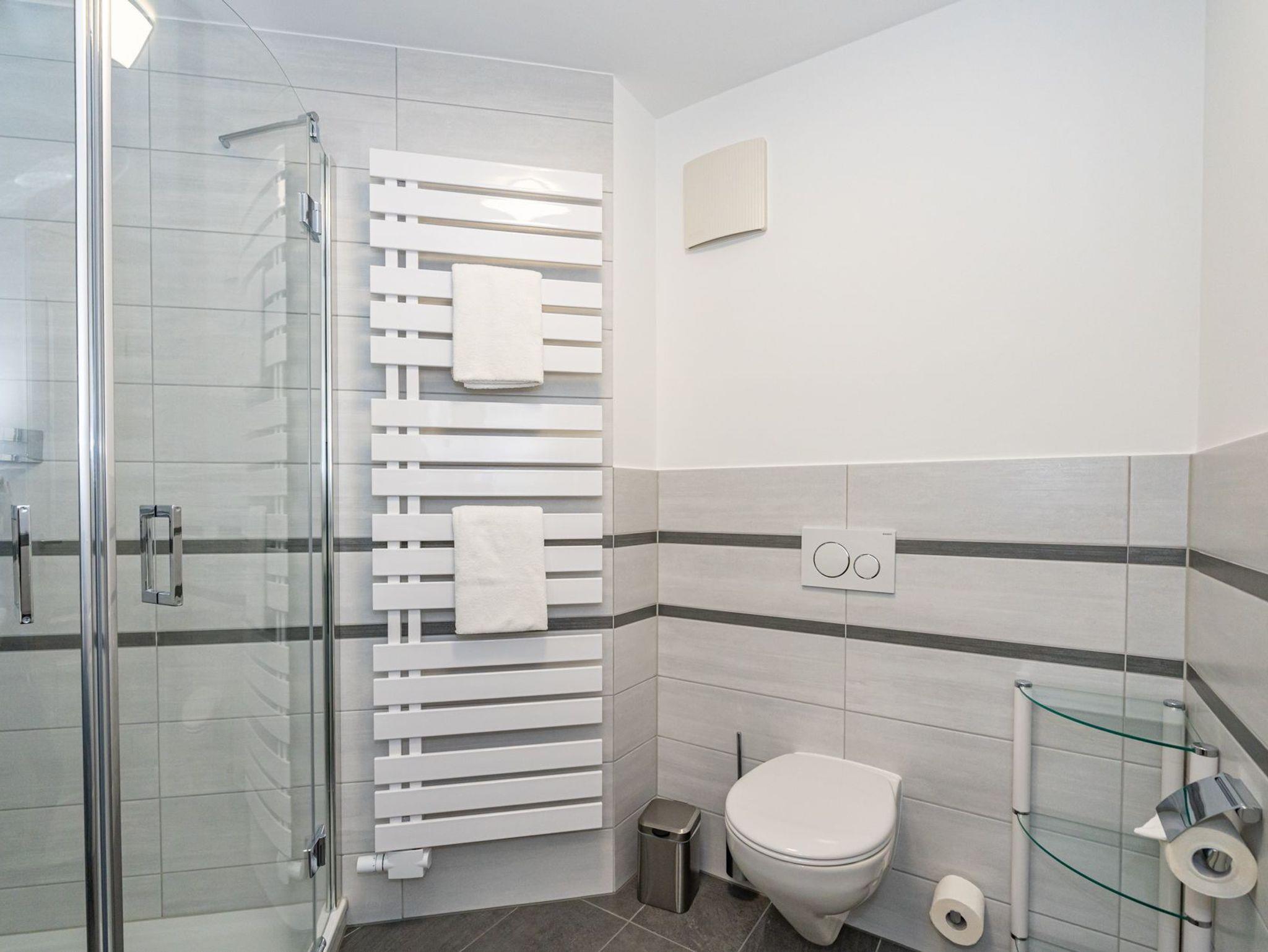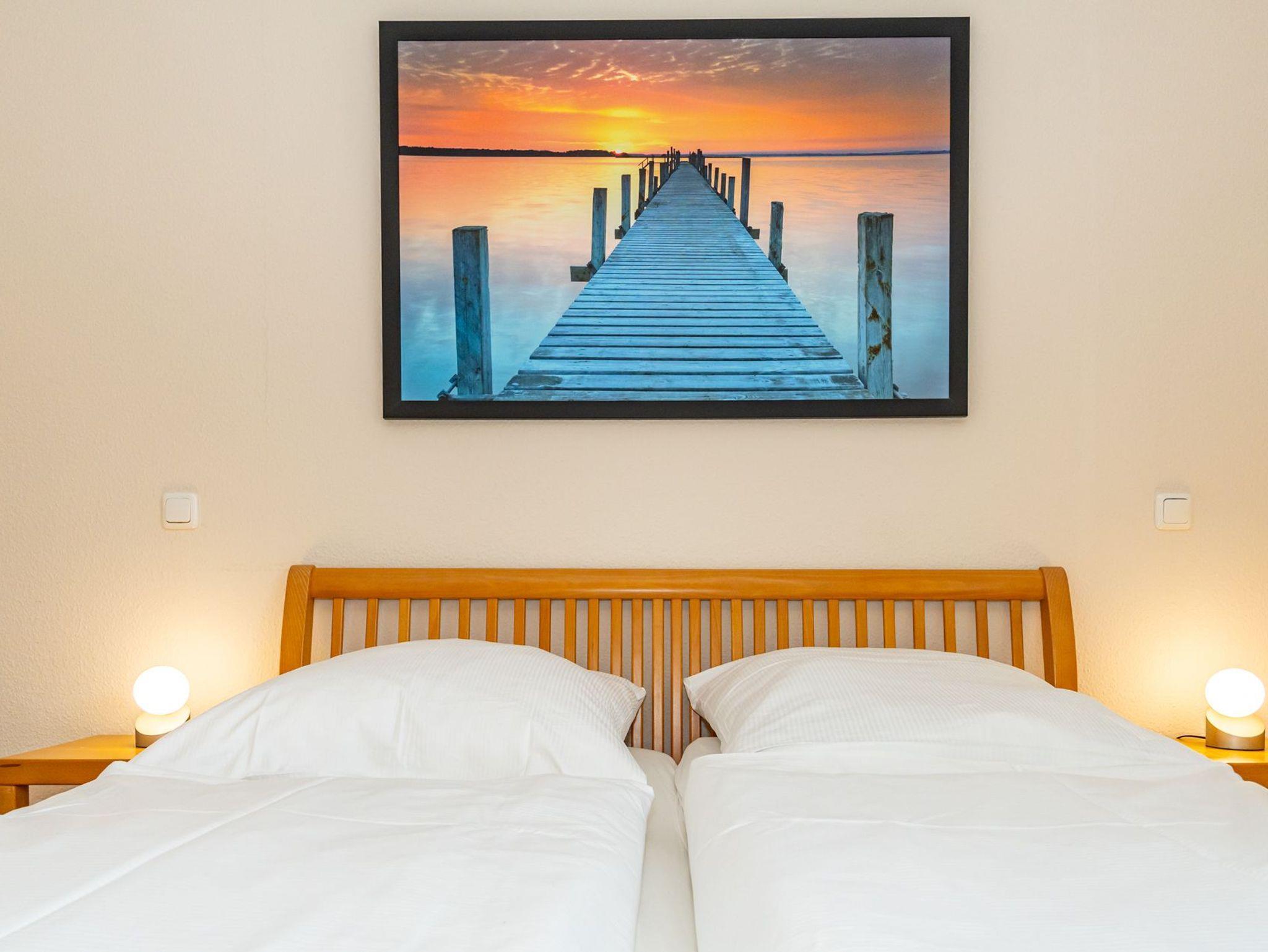 Vom Wohnzimmer aus betreten Sie das Schlafzimmer mit einem Doppelbett (zwei Einzelmatratzen je 0,80 x 1,95 m). Auch hier haben Sie Zugang zur Terrasse. Das helle Duschbad ist mit WC, Fön und modernen Armaturen ausgestattet.