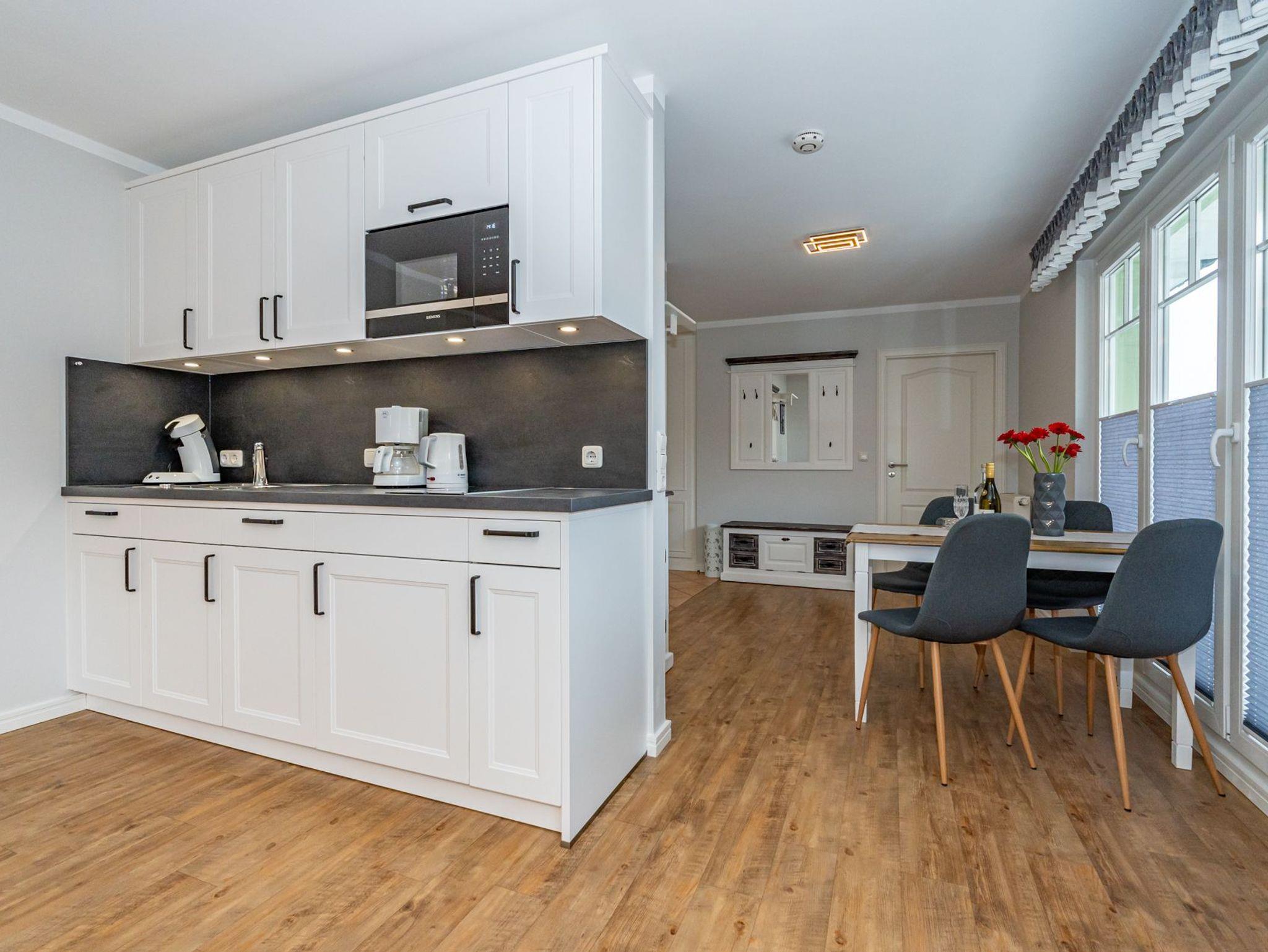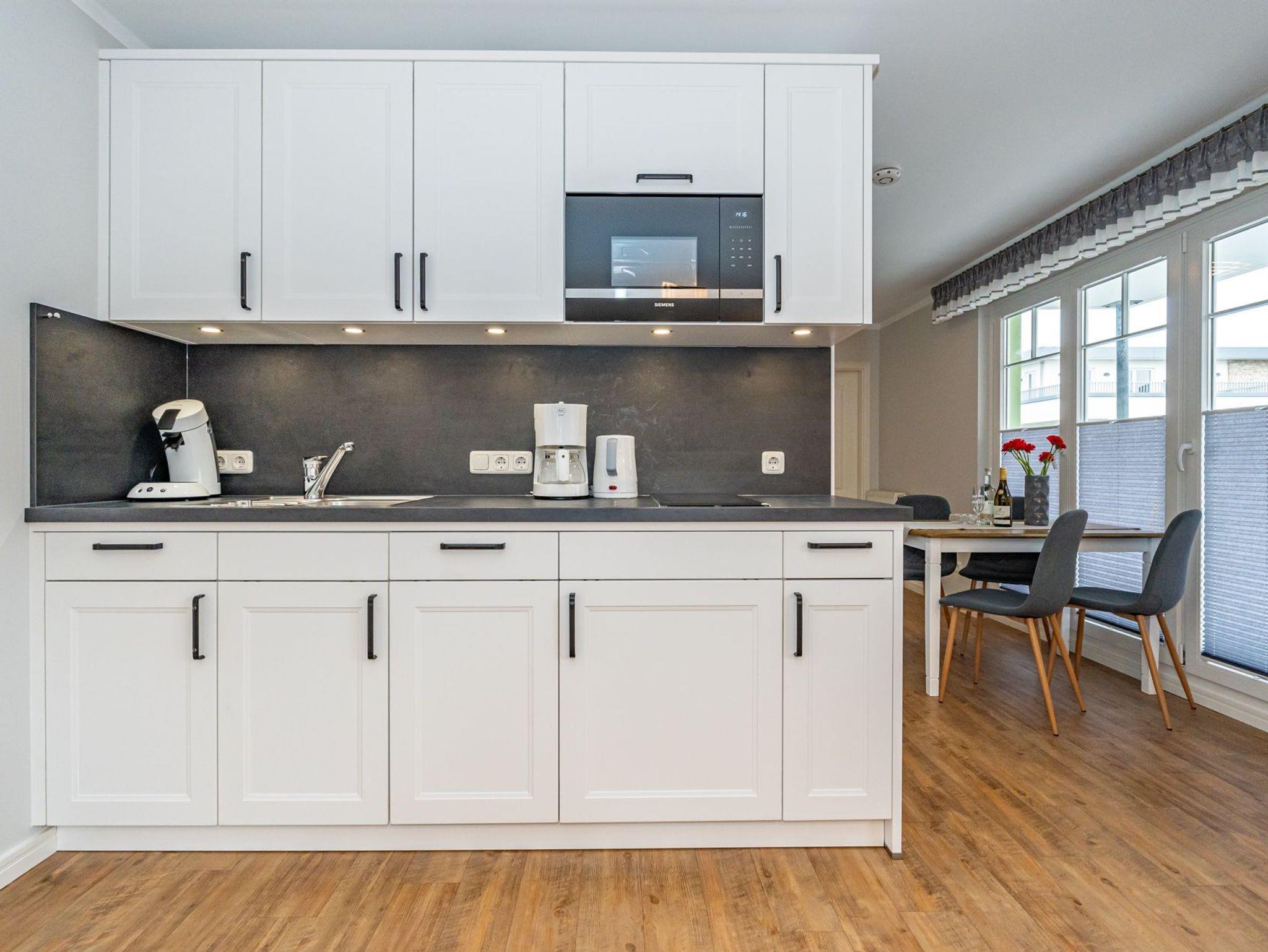 Die separate, neuwertige Küche ist bestens ausgestattet: Geschirrspüler, Cerankochfeld (4 Kochfelder), Mikrowelle und ein Kühlschrank mit 3*-Gefrierfach stehen zur Verfügung. Kaffeemaschine, Wasserkocher und Toaster gehören selbstverständlich zur Grundausstattung.