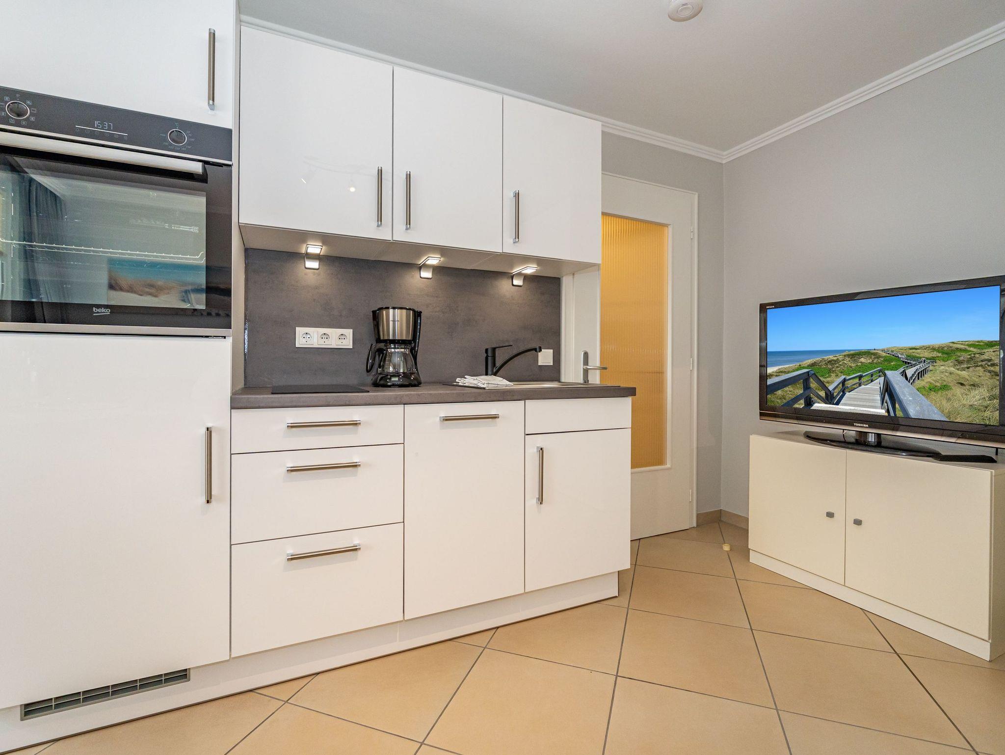 Die moderne, offene Küchenzeile ist ausgestattet mit einem Backofen, 2-Platten-Ceranfeld, Geschirrspüler, Kaffeemaschine, Wasserkocher und Toaster ? ideal für entspannte Selbstversorgung im Urlaub.