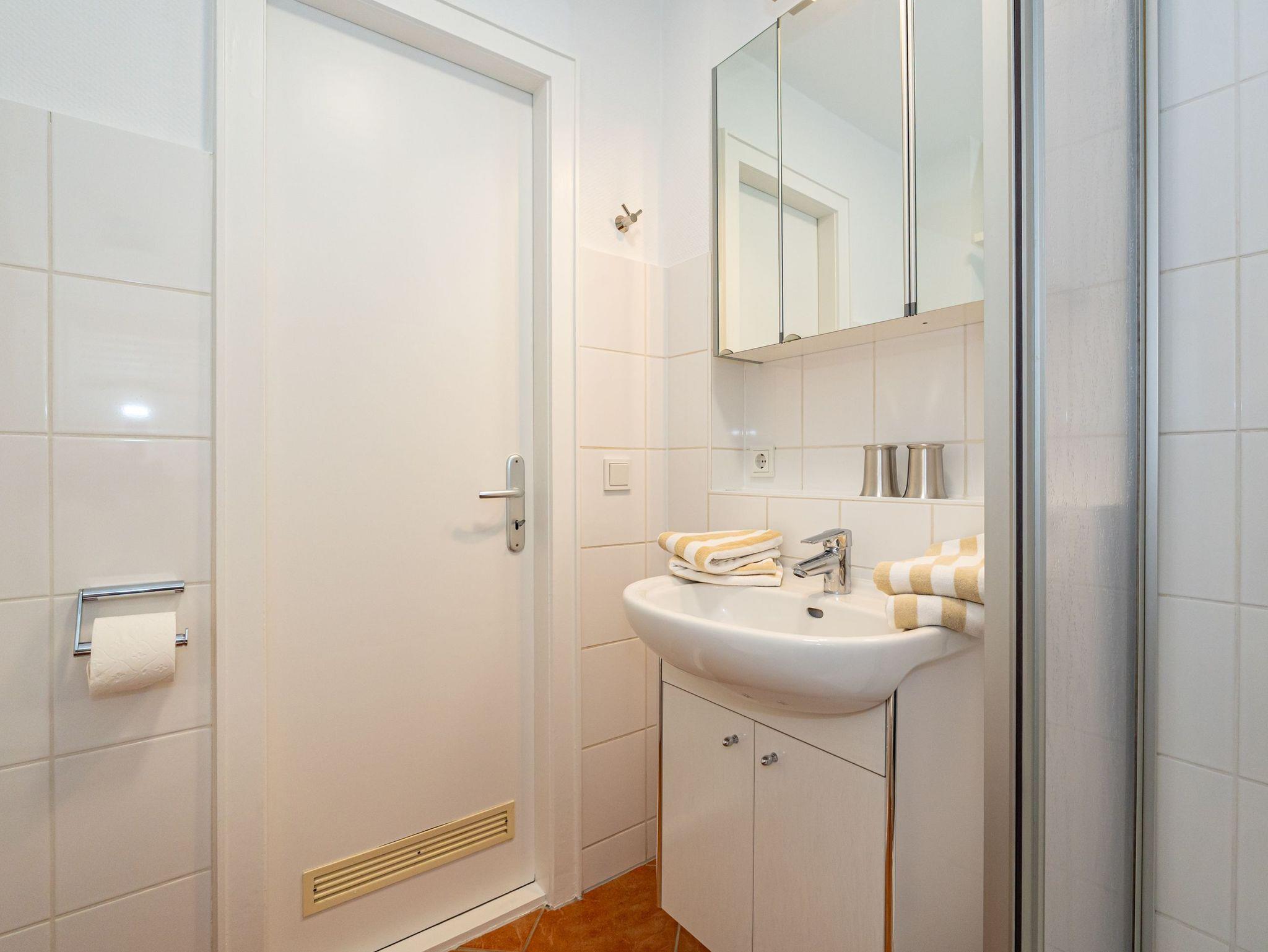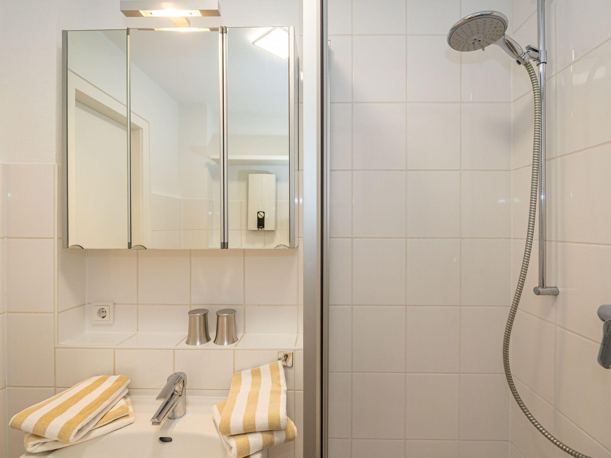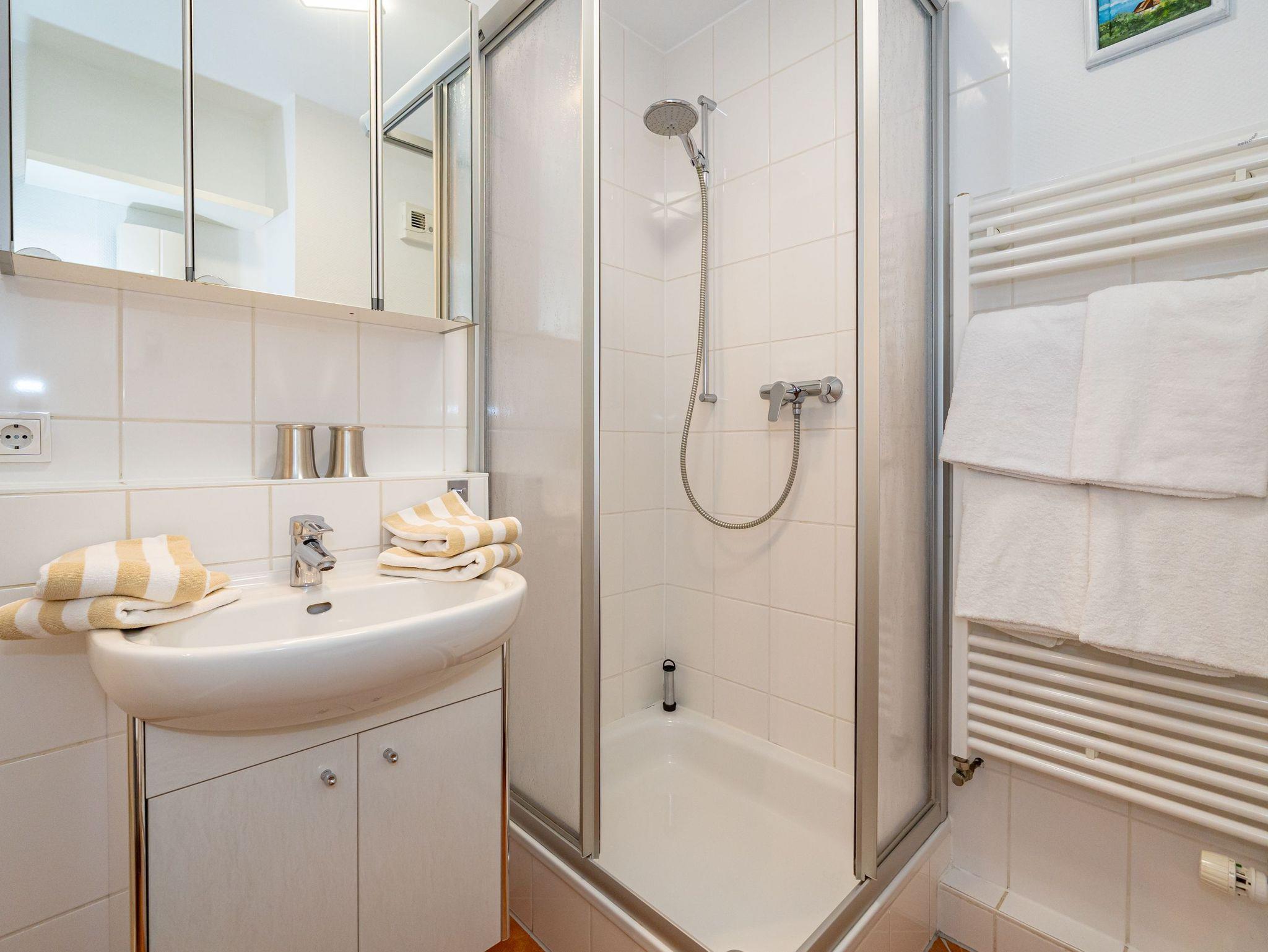 Das hell gestaltete Badezimmer ist funktional und bietet eine geräumige Dusche, ein WC sowie einen Waschtisch mit ausreichend Ablagefläche.