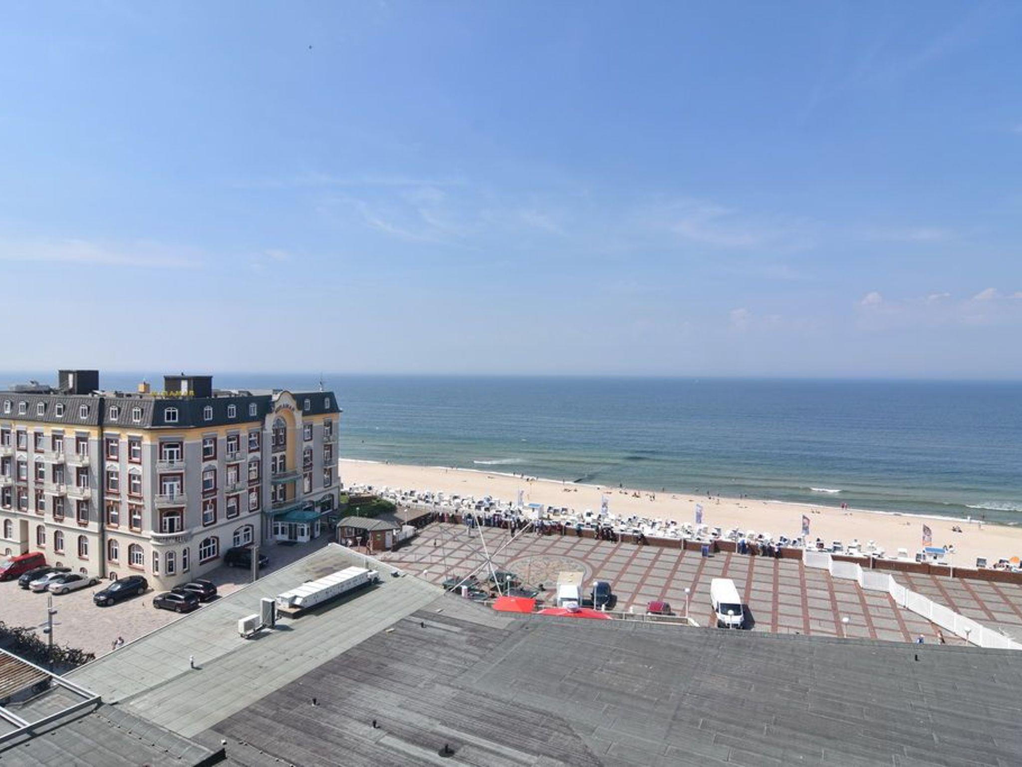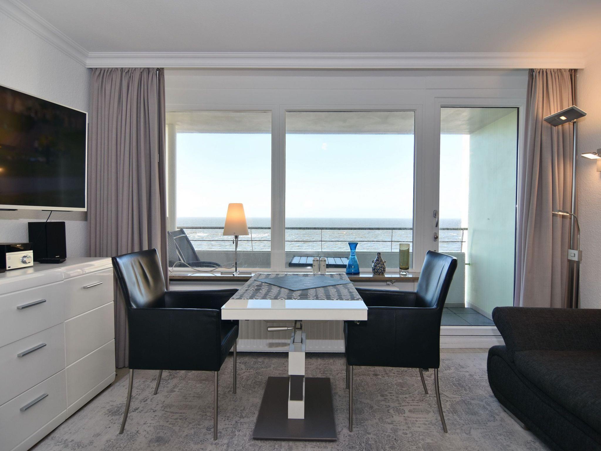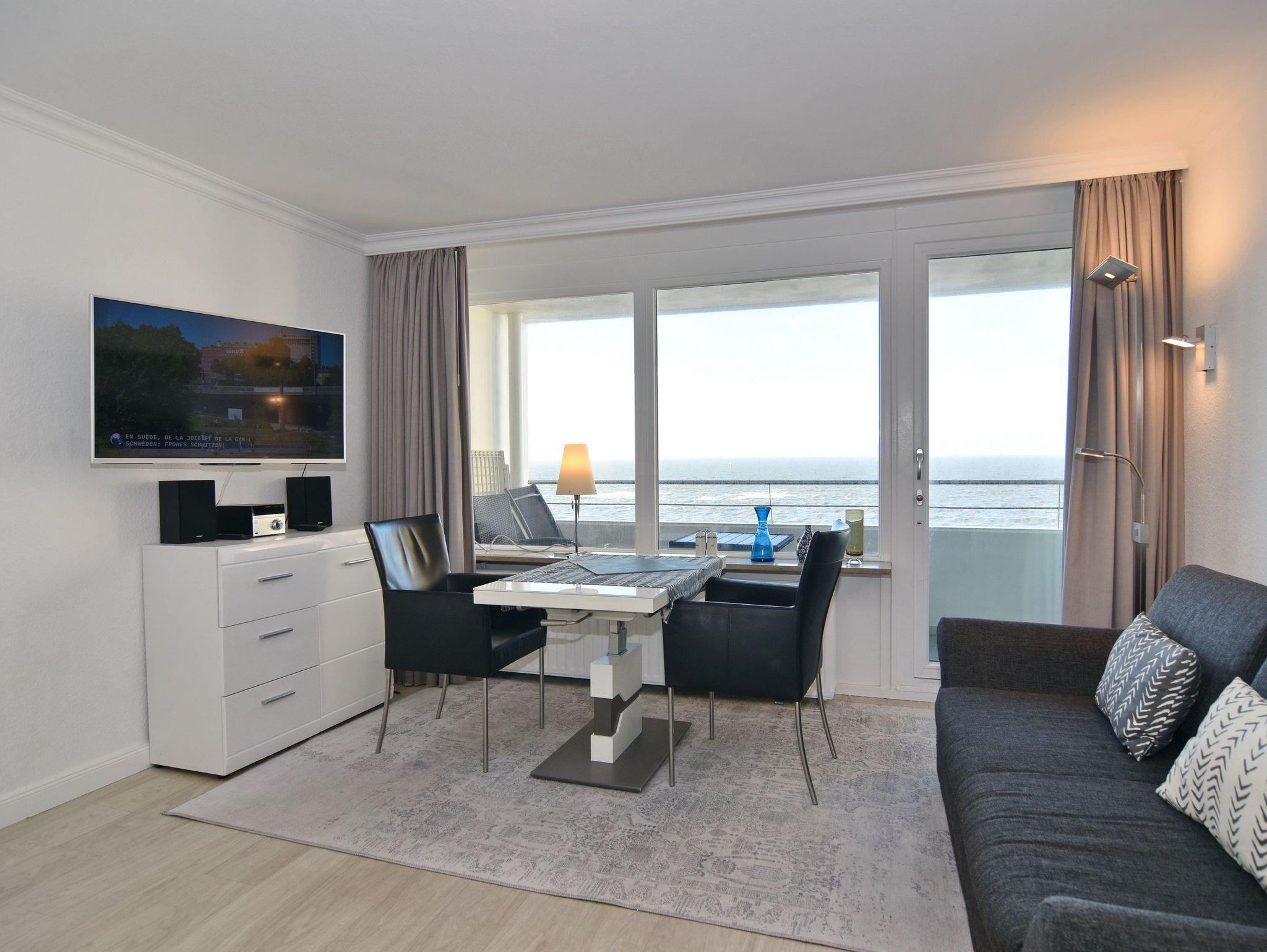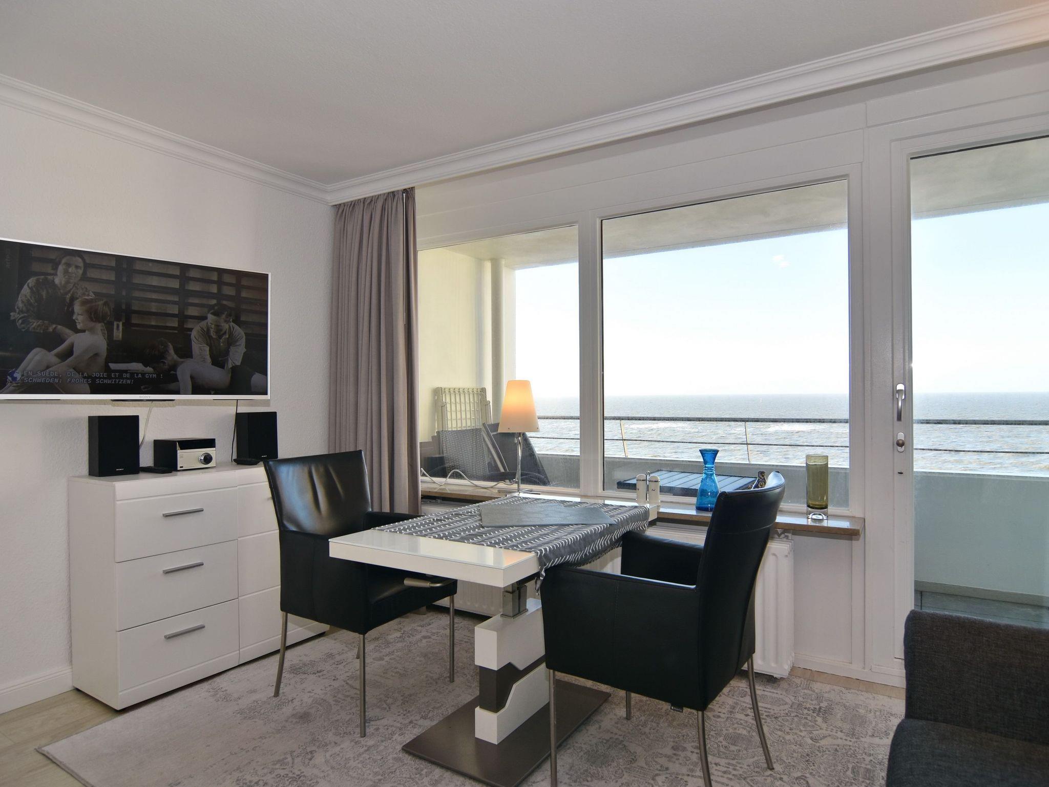 1-Zimmer-Ferienwohnung. ca. 34 m², 6.OG, Haus am Meer. Nichtraucher-Whg.! Wohn-/ Schlafraum mit Doppelschrankbett (2 Matratzen), Eßtisch am Fenster mit Blick auf das Meer, Zweisitzercouch, Flat-TV, Radio, Telefon, W-LAN (ohne Gewähr), Westbalkon mit Meeresblick und Balkonmöbeln, Küchenzeile im Flur m.Geschirrspüler u. Mikrowelle, Duschbad/WC. Tierhaltung ist nicht gestattet.[nbsp][nbsp]Das App. ist mit Design-Fußboden ausgelegt. Bettwäsche und Handtücher sind zur Anreise aufgezogen. Ein PKW-Stellplatz kann kostenpflichtig zugebucht werden.Beginnend vom 15.10.2025 bis 5.4.2026 (Ostern) findet die Fassandensanierung der Landseite (Osten) sowie des Südgiebels statt. Mit Baulärm ist in dieser Zeit zu rechnen.