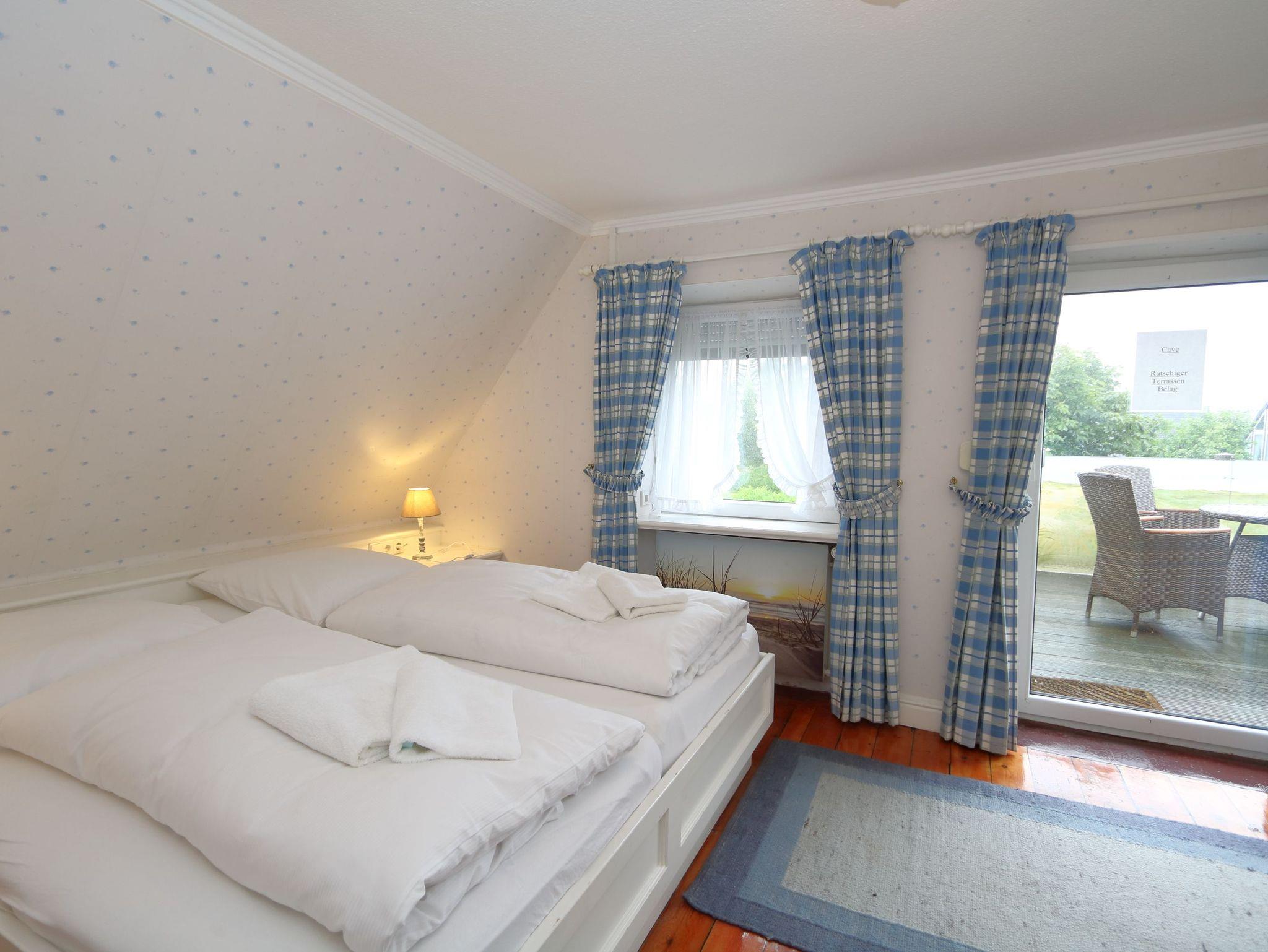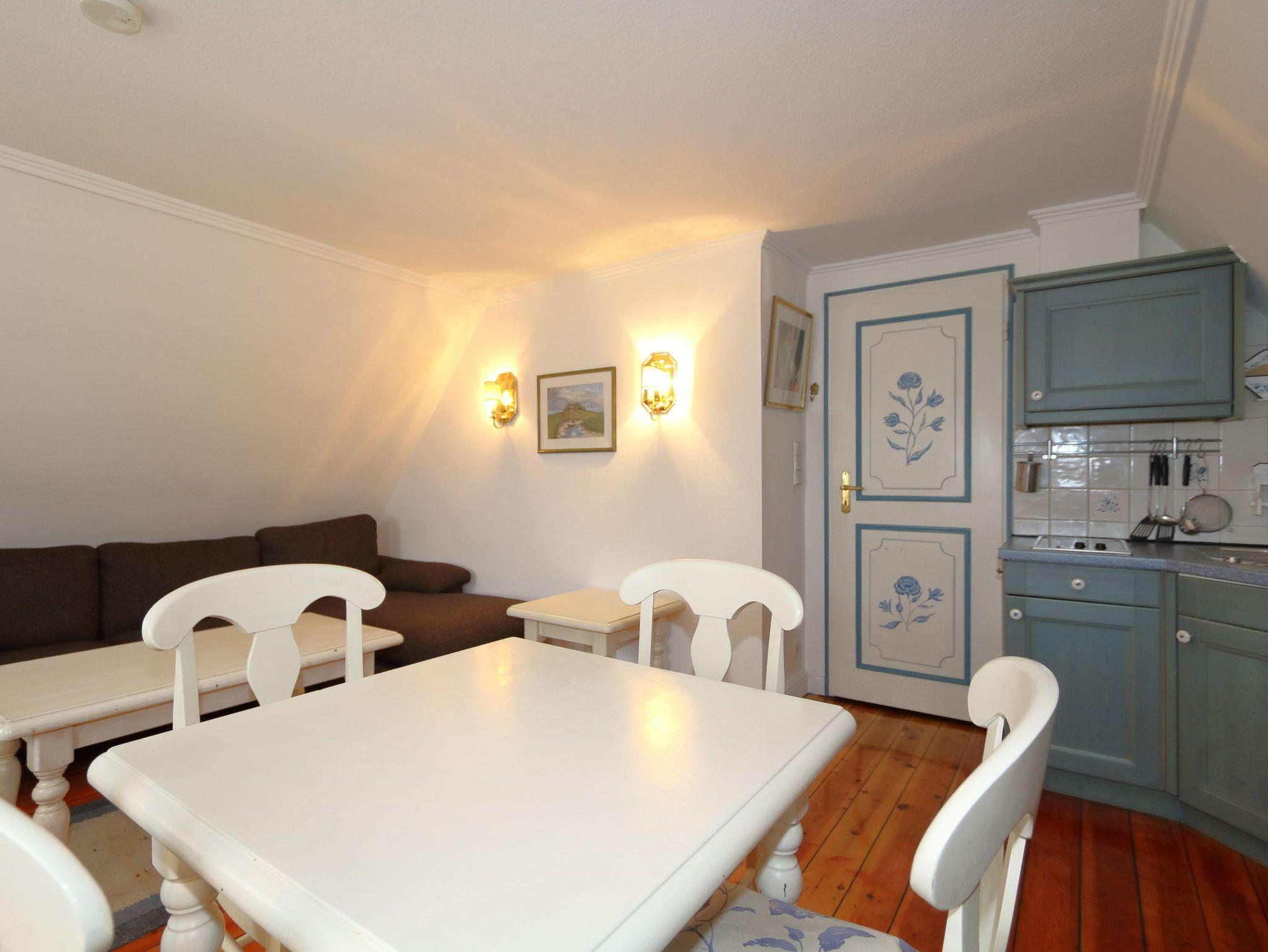 Das Wohnzimmer hat eine bequeme Couchgarnitur, die auch als Schlafgelegenheit dienen kann. Die im Wohnzimmer untergebrachte Küchenzeile ist komplett ausgestattet. Die gesamte Wohnung ist im „Laura Ashley“ Stil eingerichtet und hat viele liebevolle Details. Vom Schlafzimmer mit dem Doppelbett gelangt man auf die uneinsehbare Dachterrasse mit Balkonmöbeln und Strandkorb. Im Bad mit Dachfenster ist eine Dusche.