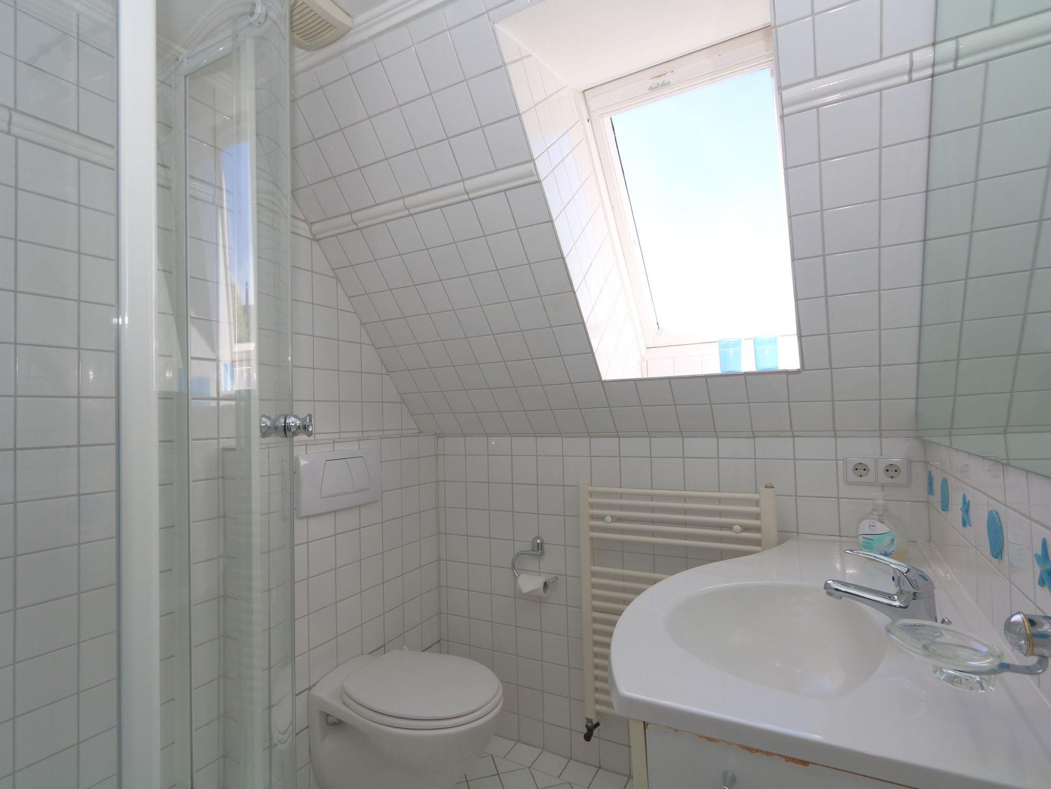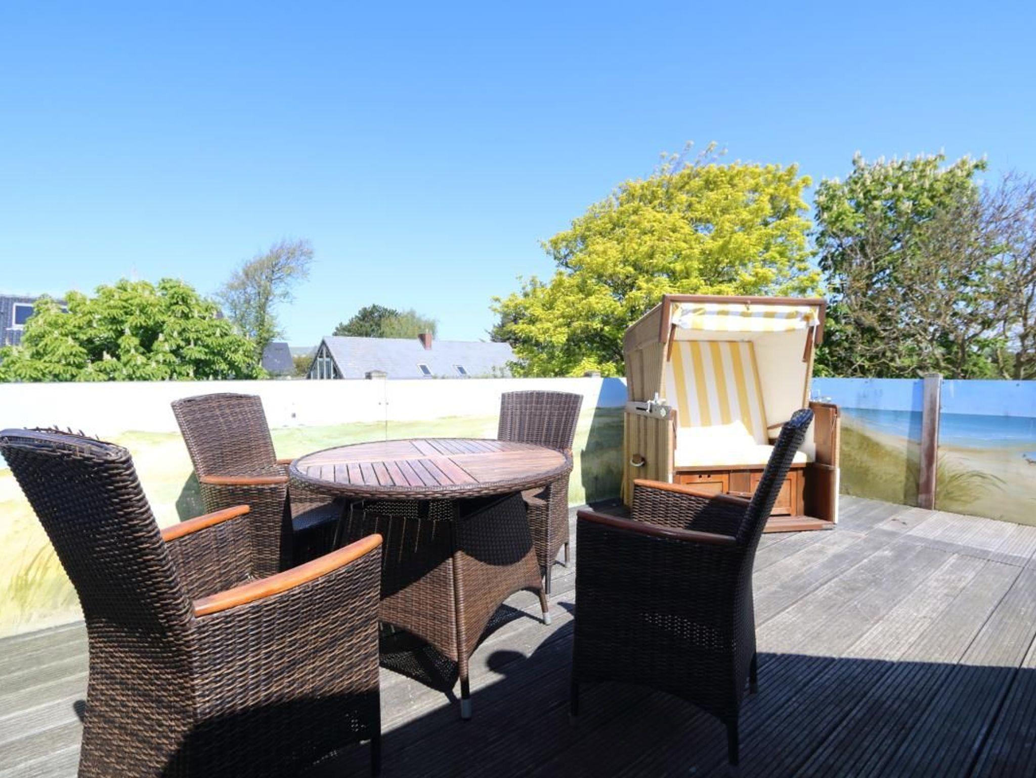 Das Wohnzimmer hat eine bequeme Couchgarnitur, die auch als Schlafgelegenheit dienen kann. Die im Wohnzimmer untergebrachte Küchenzeile ist komplett ausgestattet. Die gesamte Wohnung ist im Laura Ashley Stil eingerichtet und hat viele liebevolle Details. Vom Schlafzimmer mit dem Doppelbett gelangt man auf die uneinsehbare Dachterrasse mit Balkonmöbeln und Strandkorb. Im Bad mit Dachfenster ist eine Dusche.