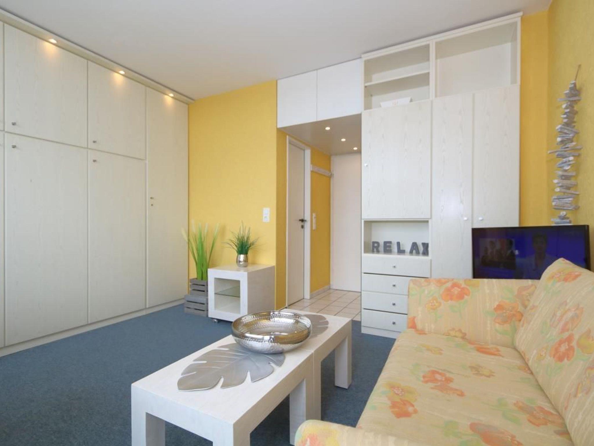 Im kombinierten Wohn und Schlafraum befindet sich ein Schrankbett , Sitzecke und Eßplatz an der großen Fensterfront.