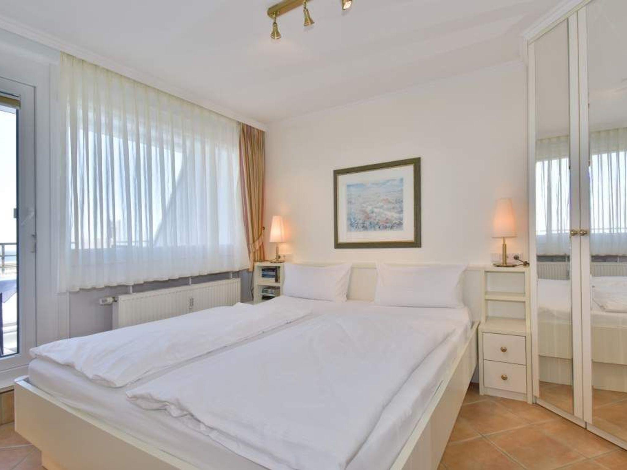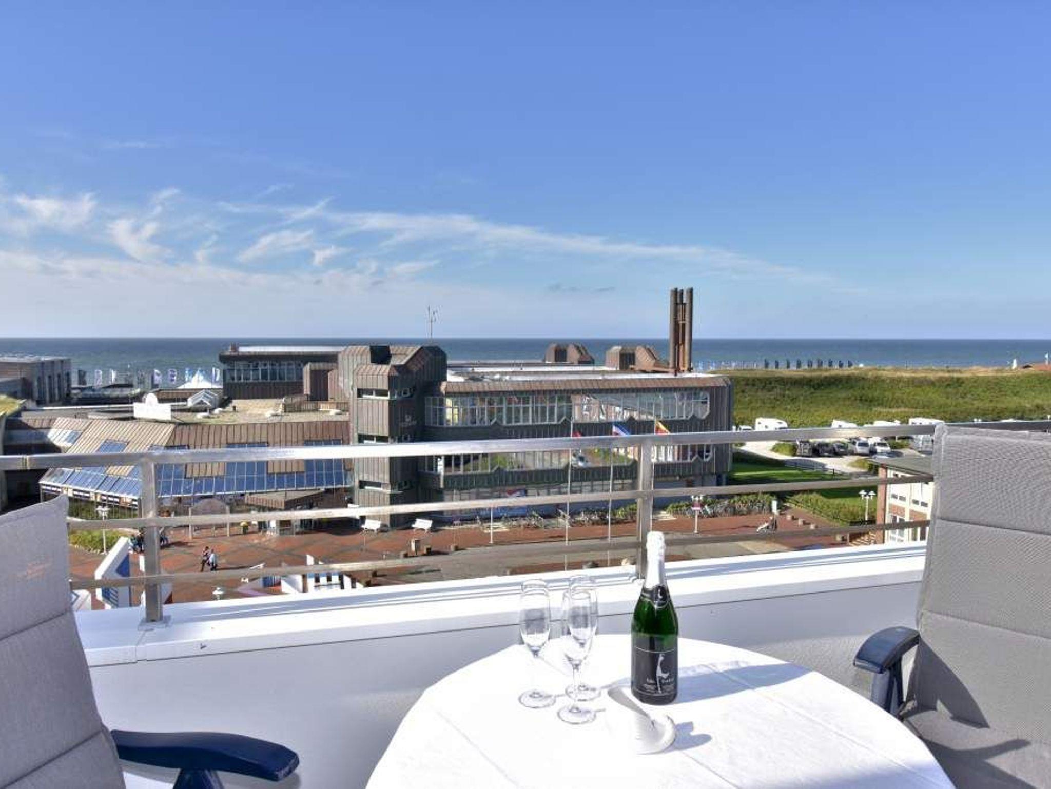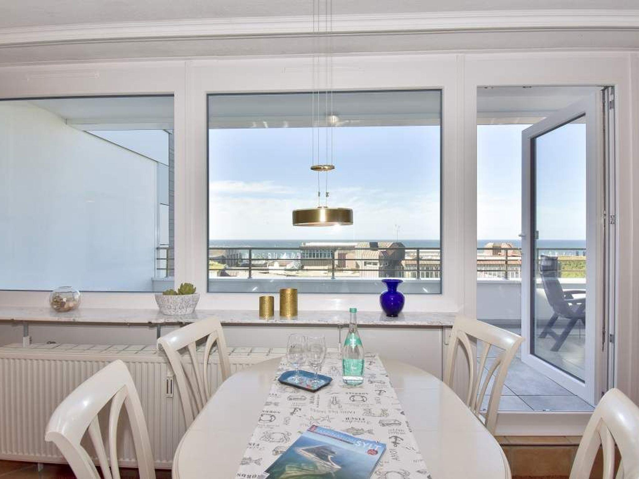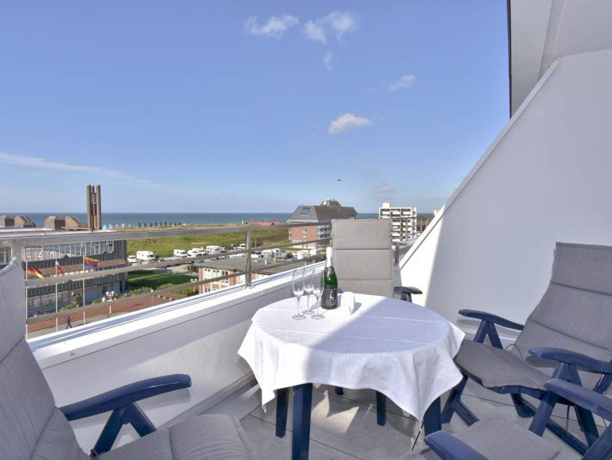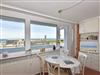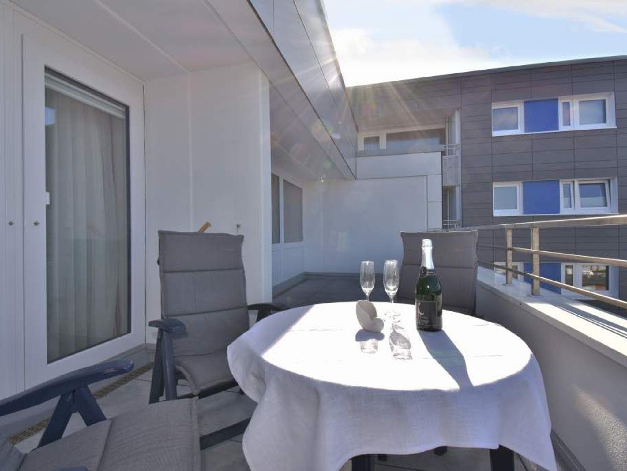 Exklusiv eingerichtete, komplett geflieste 2-Zimmer-Nichtraucher-Ferienwohnung (ca. 53 qm), in der 5. Etage zur Seeseite mit schönem Meerblick und Dachterrasse (Nachmittags- und Abendsonne, mit Balkonmöbeln und Auflagen).