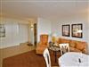 Der Wohnraum (mit Zugang zum Schlafzimmer) besteht aus einer bequemen Sitzgarnitur (2-Sitzer-Couch und Ohrensessel mit Fußhocker), einem Essplatz, zwei separat stehenden Einzelschrankbetten, Kabel-Flachbild-TV.