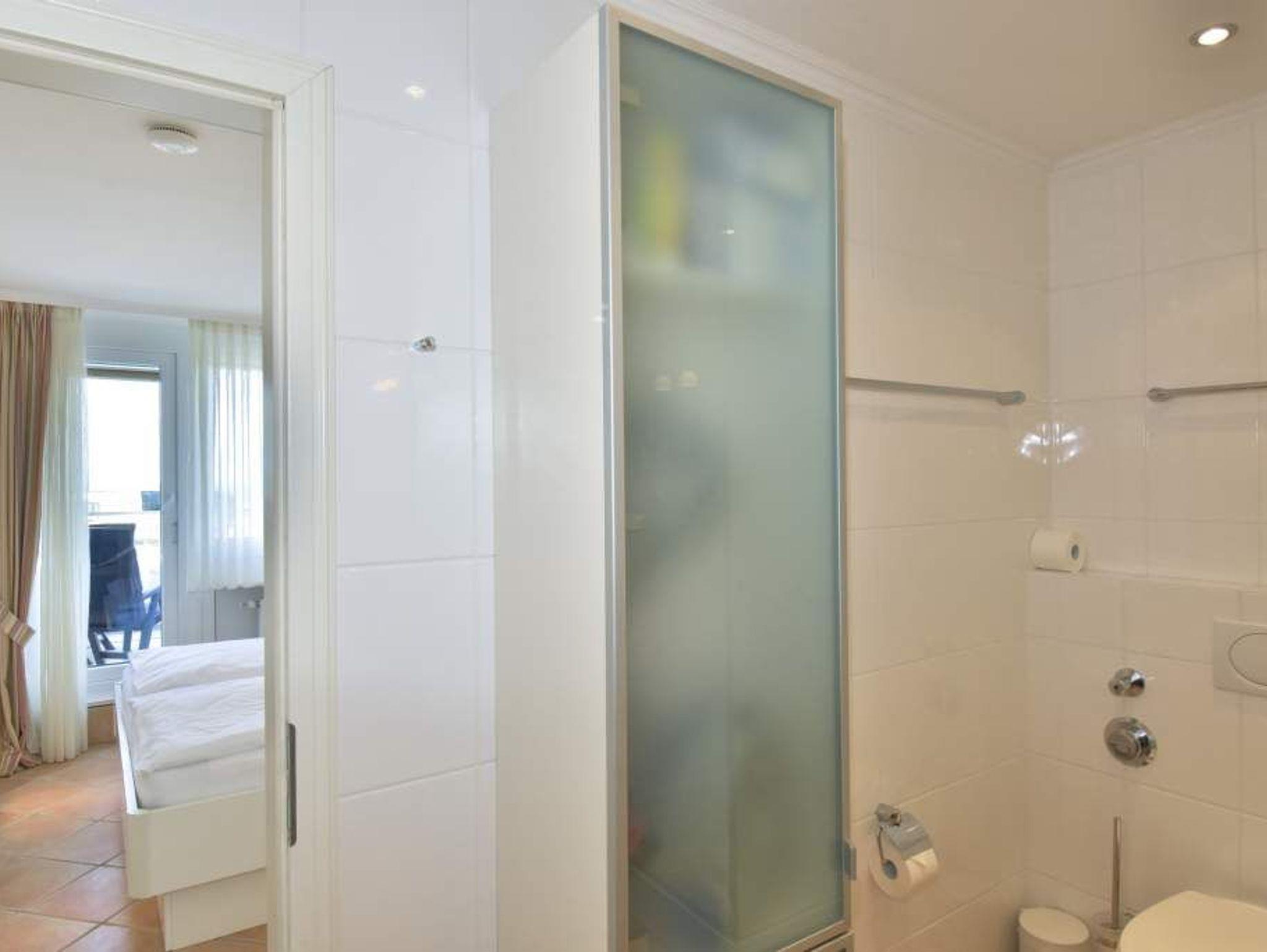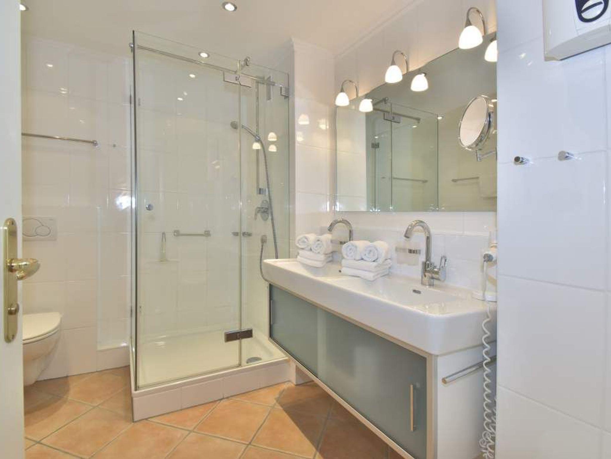 Das Duschbad/WC ist vom Wohnzimmer und Schlafzimmer aus zu betreten und ist mit zwei Waschbecken, Fön und Kosmetikspiegel ausgestattet.