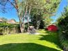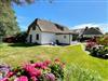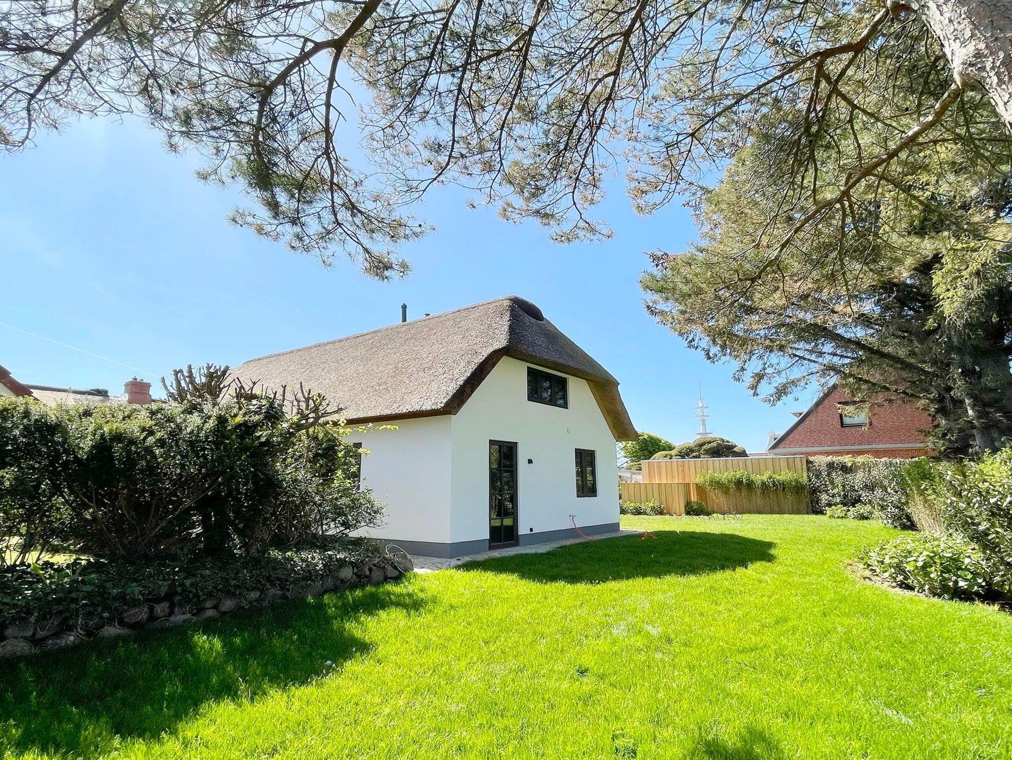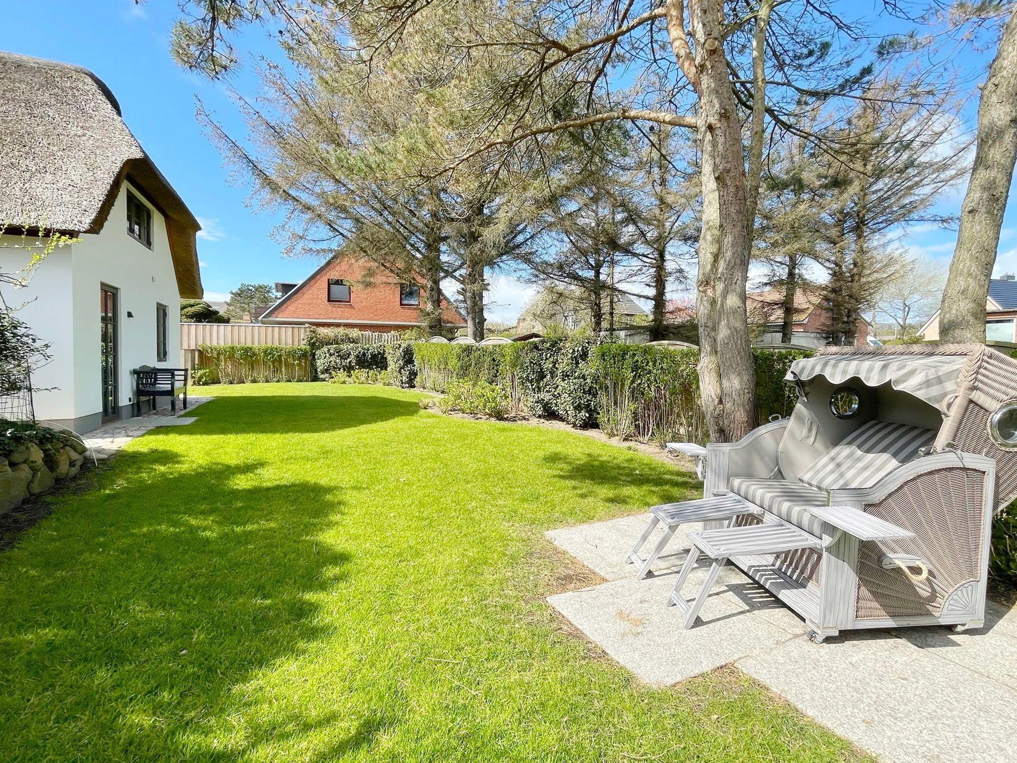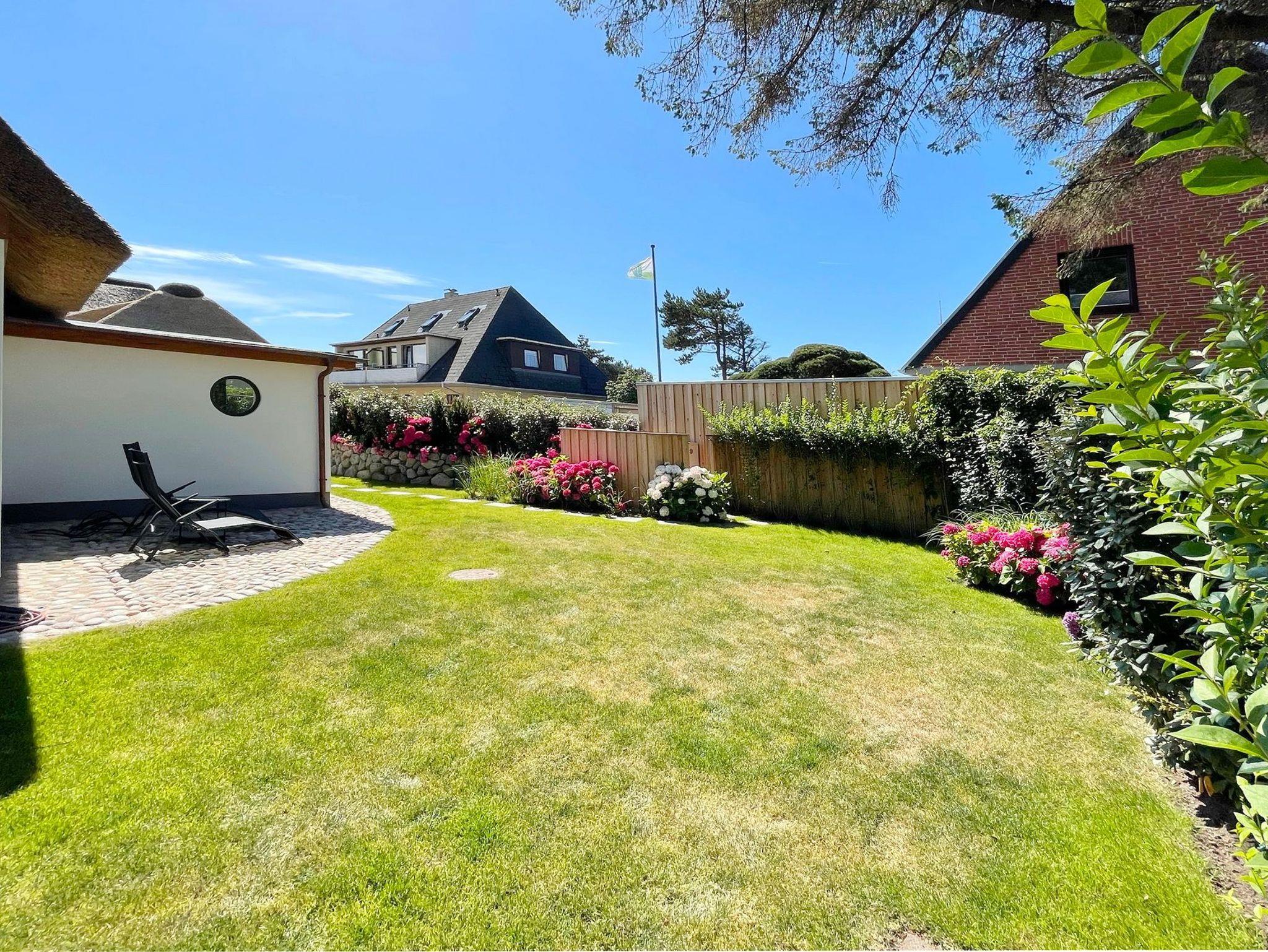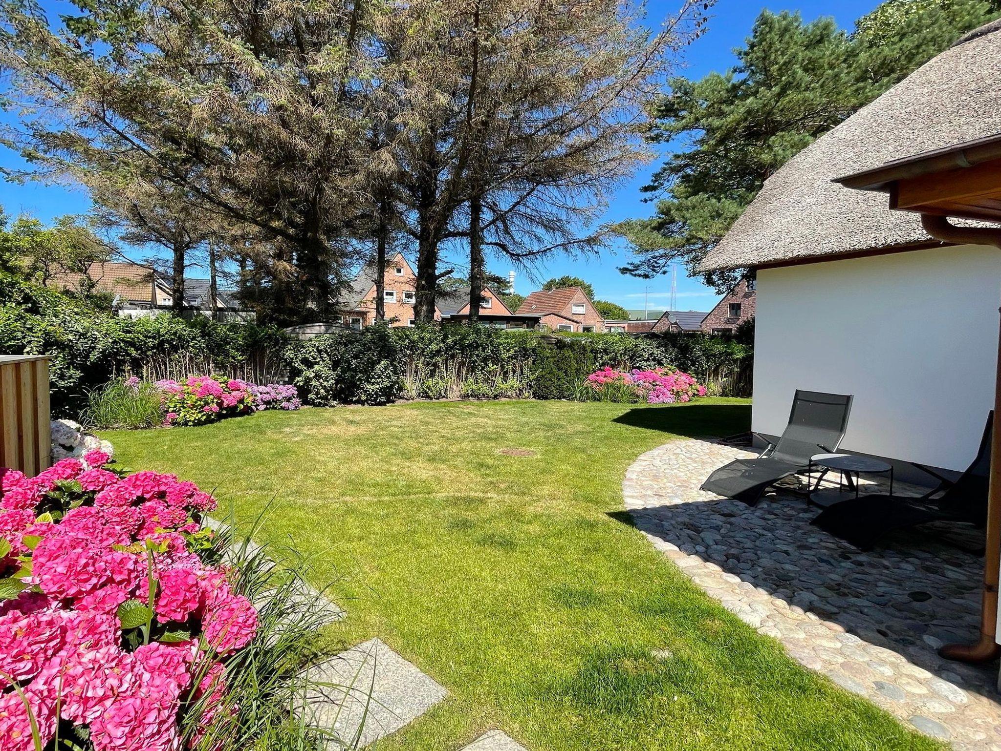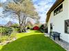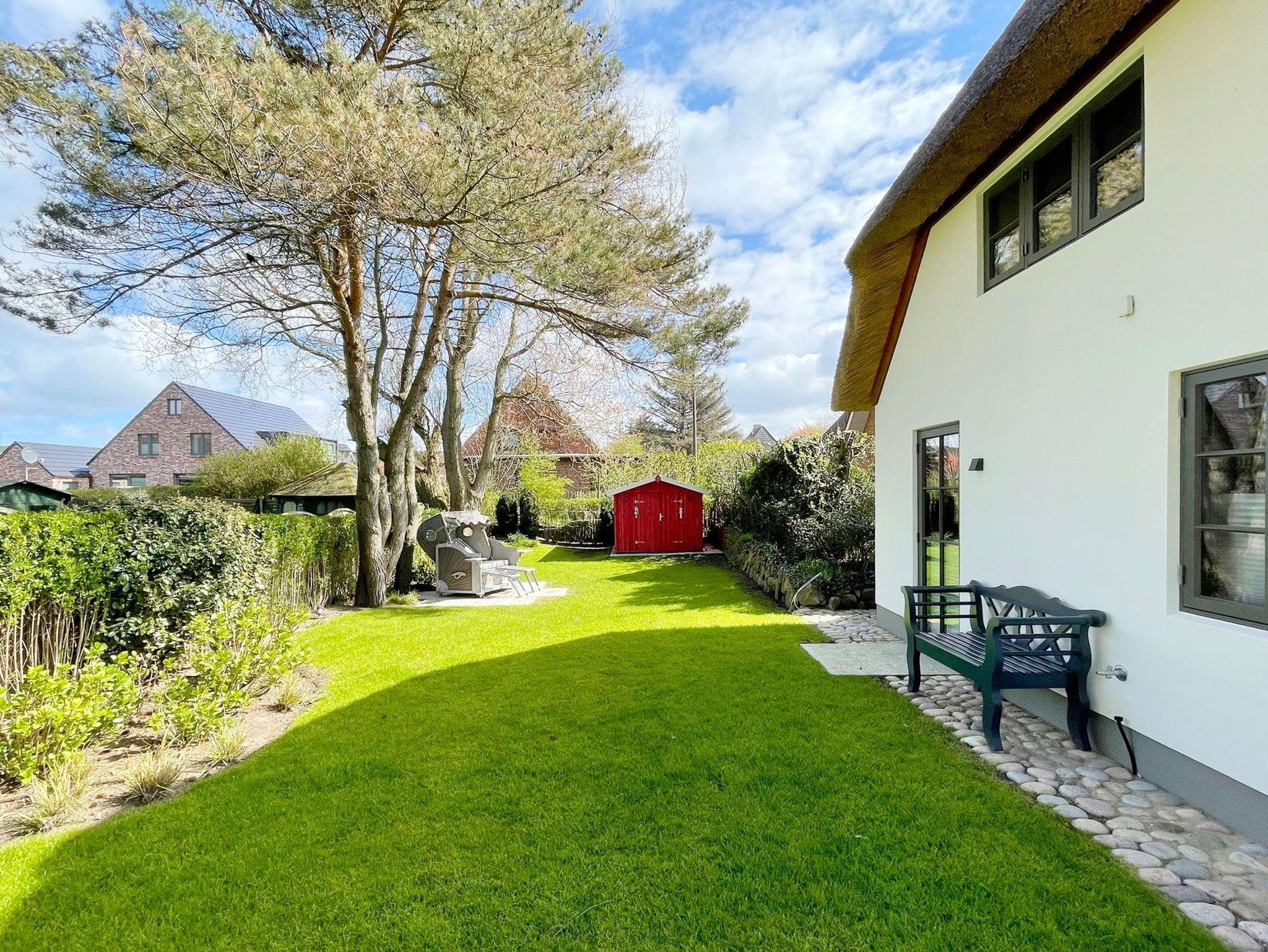 Der ebenfalls von einem Landschafts- und Gartenbauer neu gestaltete Garten wird von einem Friesenwall mit Eingangspforte umgeben und lässt inklusive des Vorplatzes am Abend wunderschön beleuchten. Dieser umgibt das Haus, bietet viel Privatsphäre und ganz nach Wunsch Sonne oder Schatten auf Krusten-Naturstein / Katzenkopfpflaster-Terrassen oder auf dem Rasen, schwedenrotes Gartenhaus für die Terrassenmöbel im Garten und eine Alu-Fahrradbox direkt am Haus.