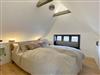 OG: Bis in den Giebel geöffnete kleine Galerie mit Reetdach-Gaube, von der nach links und rechts jeweils ein Schlafzimmer mit Doppelbett, Einbauschrank und Sprossenfenstern mit Verdunklungsrollo abgehen.