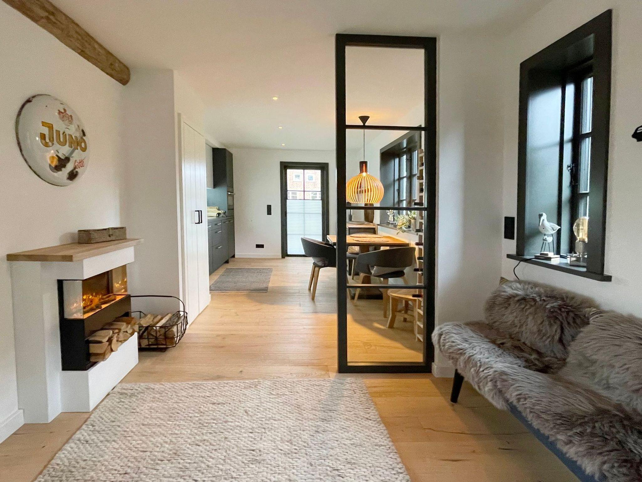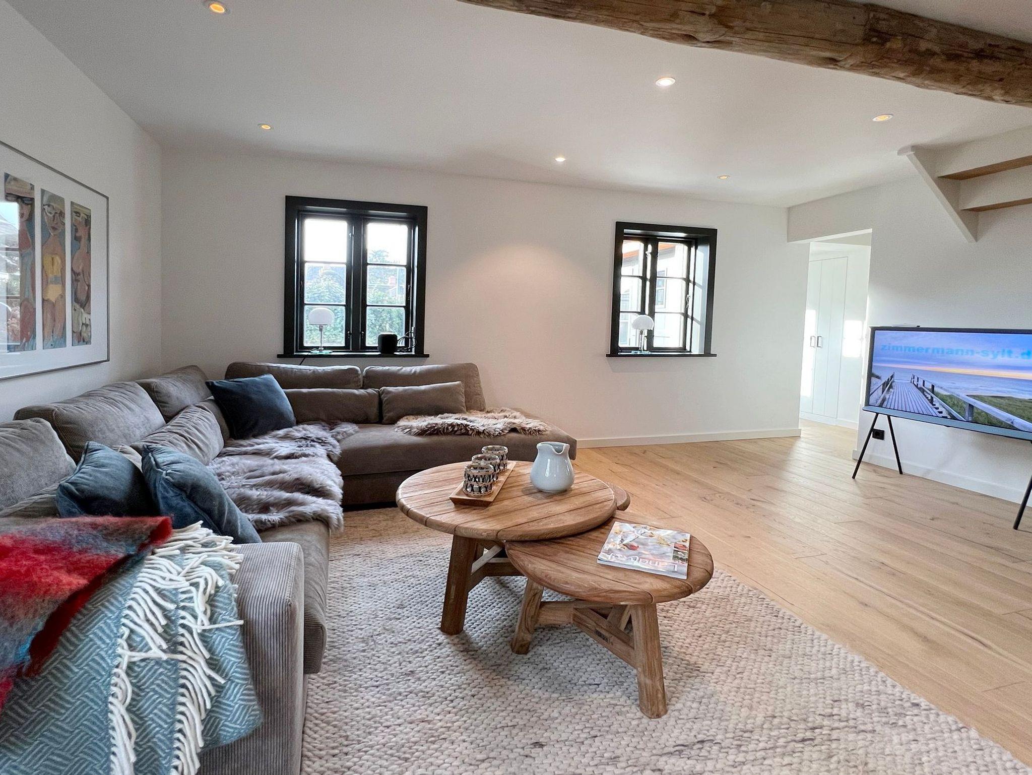 EG: Wohnbereich mit großzügiger Lounge-Ecke und Schaukelsessel mit Footstool zum Relaxen, Smeg-Kühlschrank, Magenta TV und Apple-Box, Elektrokamin mit Kaminbank für 2. Die offene moderne Küche der Firma Leicht ist top ausgestattet und verfügt über eine Arbeitsplatte mit Lautsprecher und Aufladestation . Hier ist auch ein kleiner Sitzplatz für 2-3 Personen.