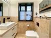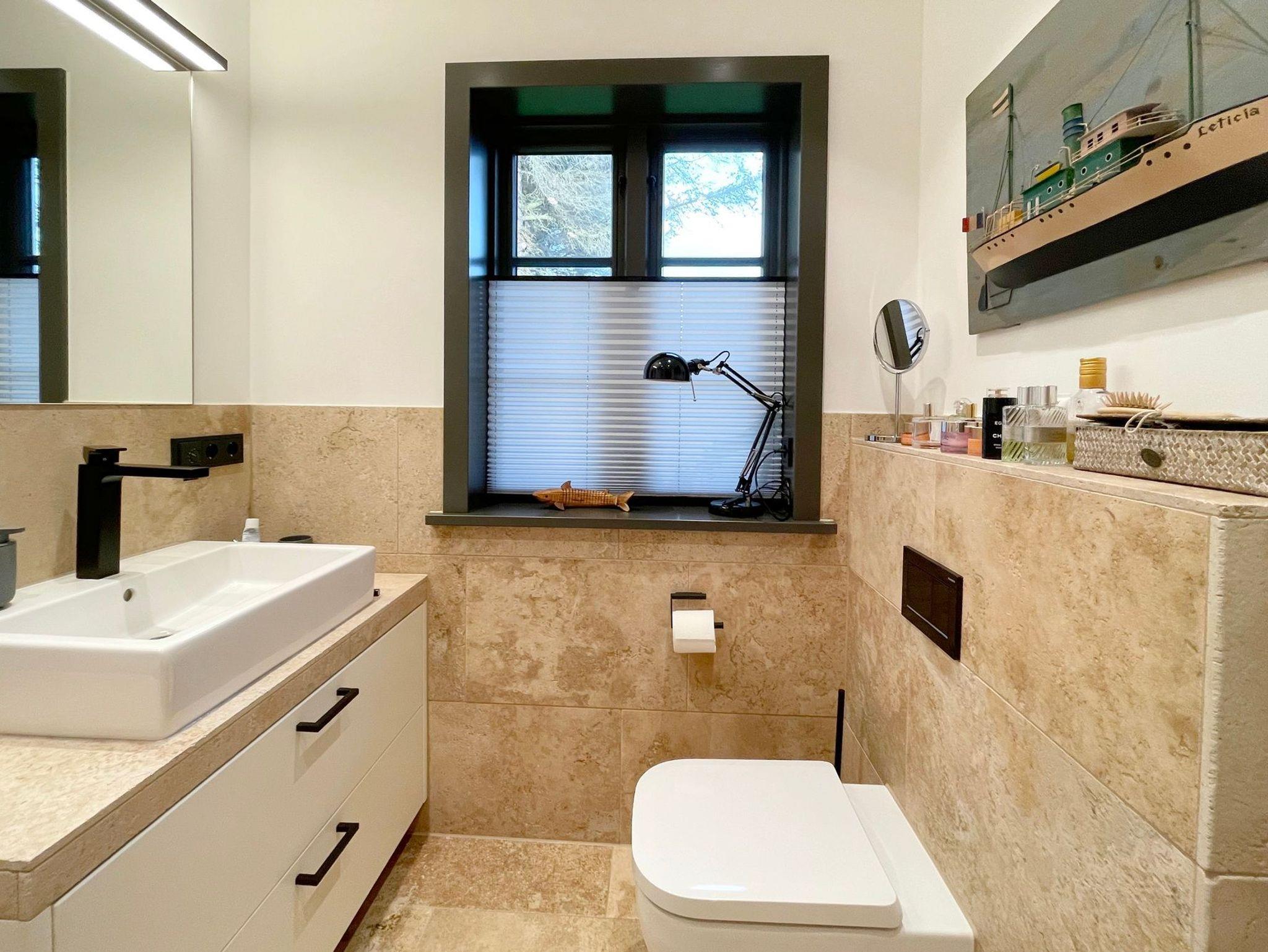 Badezimmer: Natursteinbad mit großer Walk-In-Dusche und Raindance-Deckendusche und Handbrause. Handtuchheizkörper, WC und Einbau-Duravit-Waschtisch