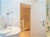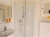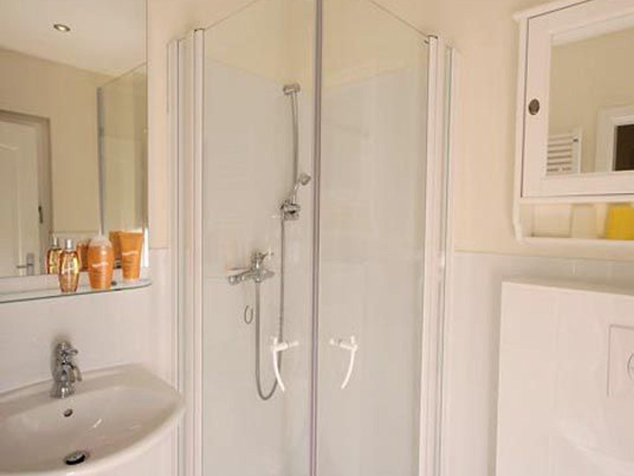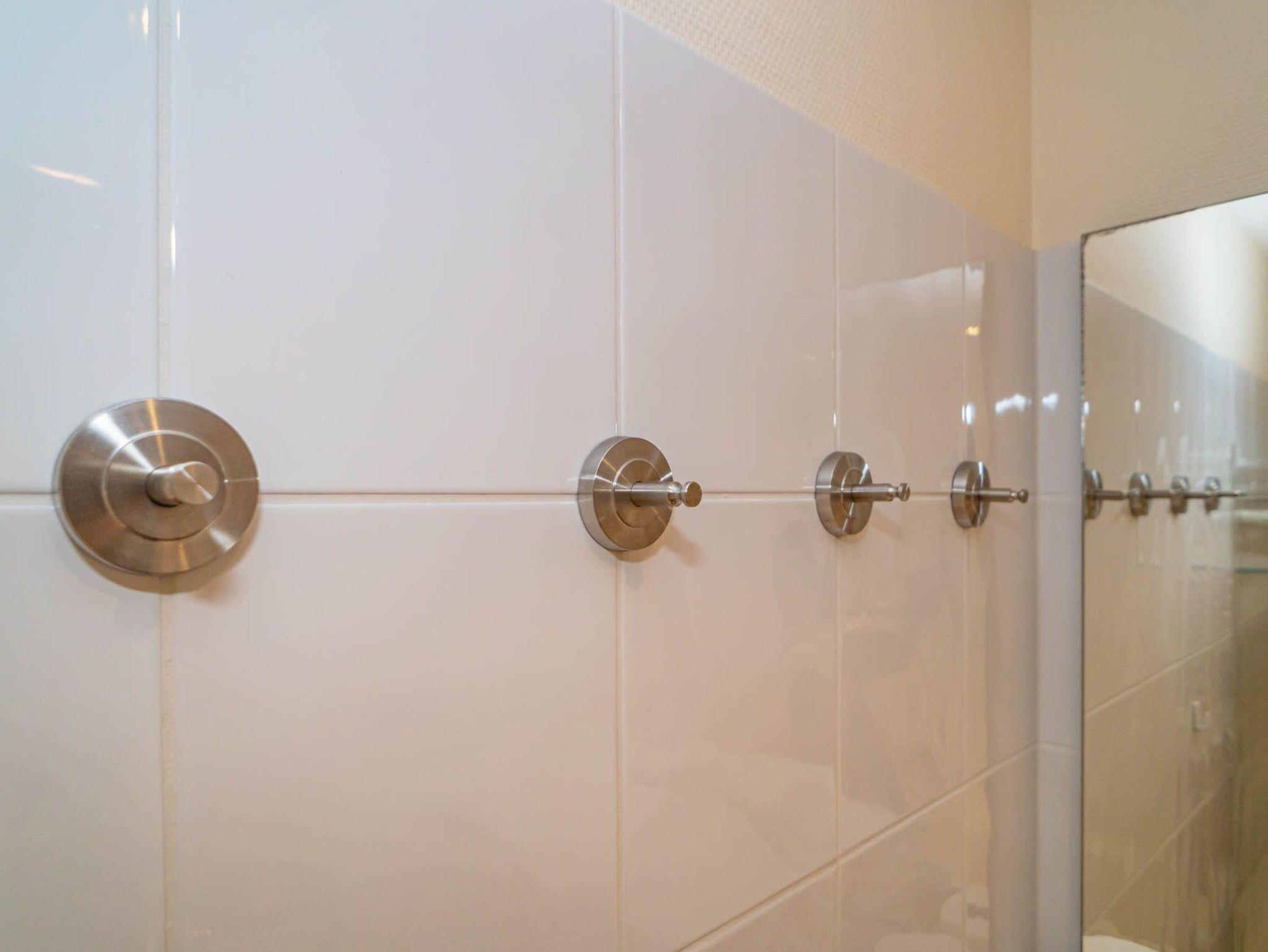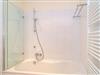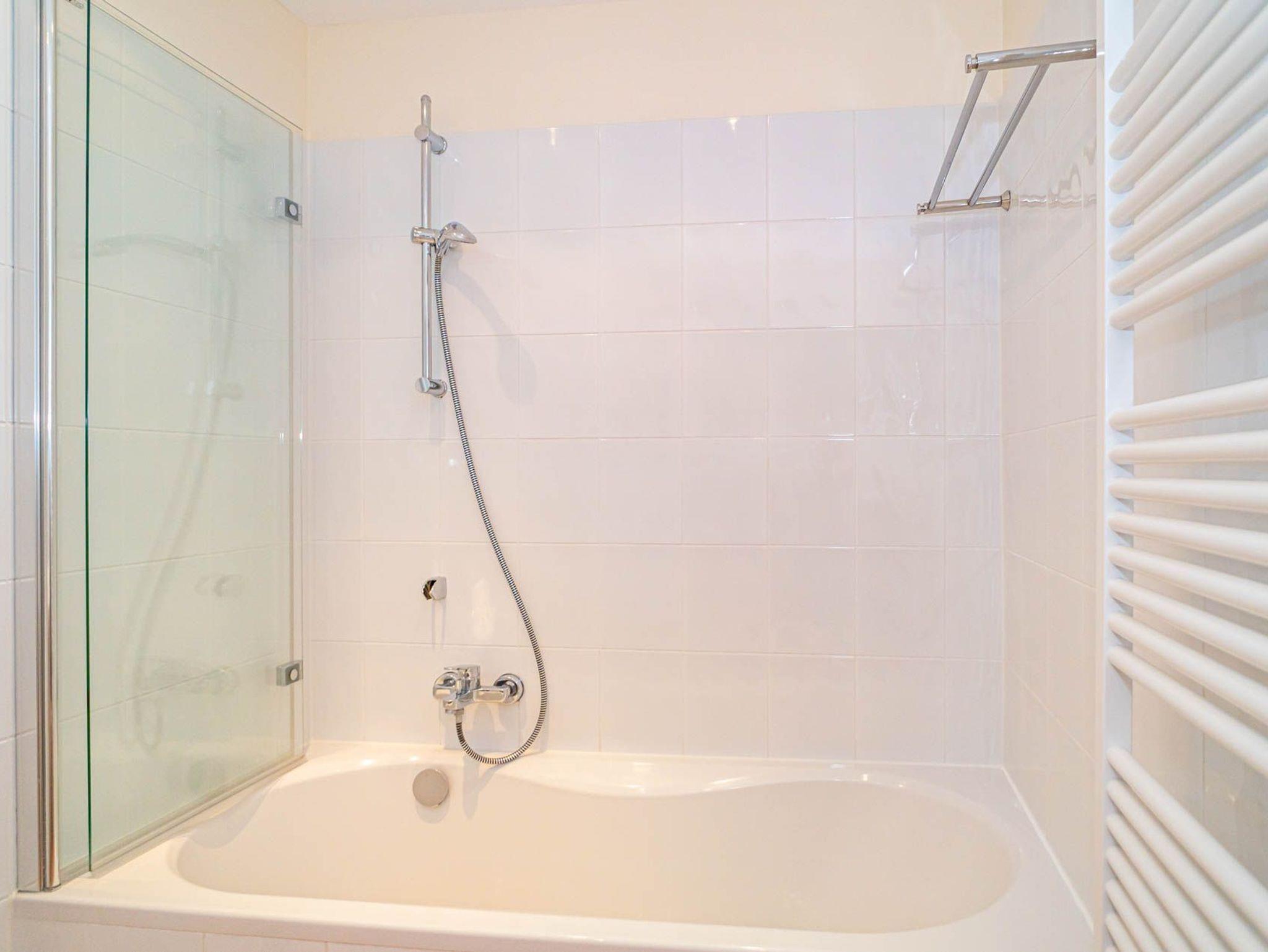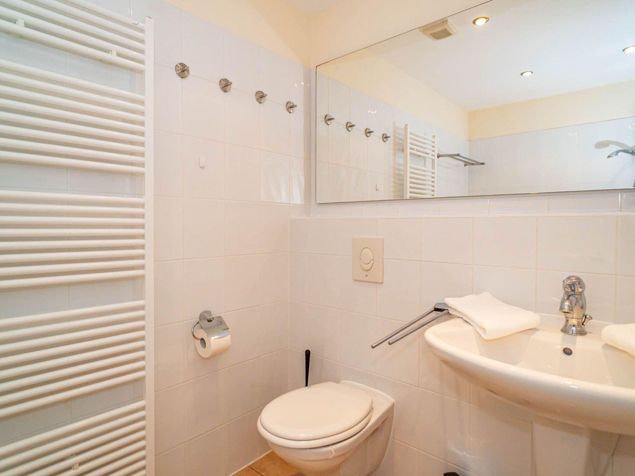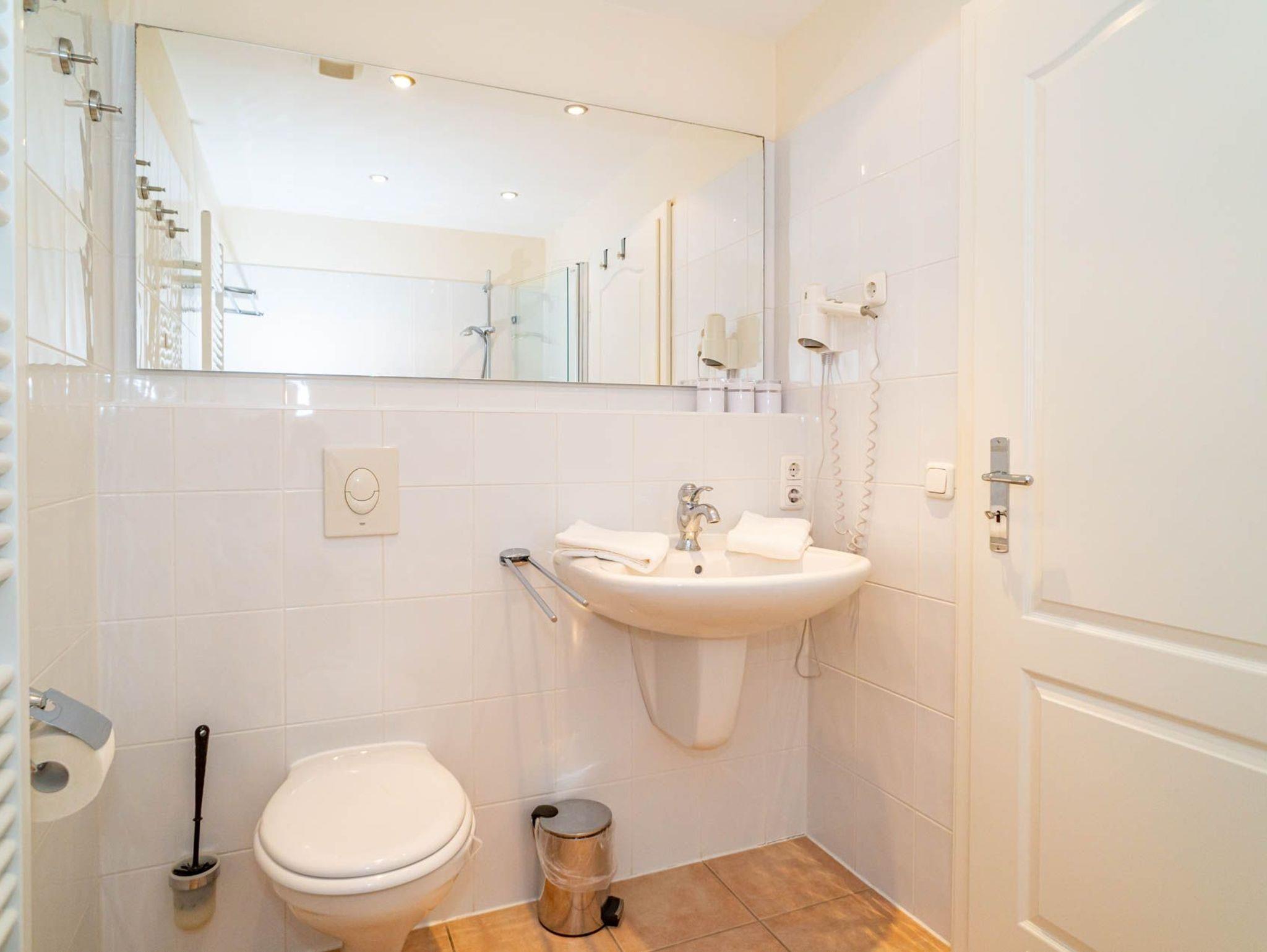 Im Bad befinden sich eine Dusche, ein WC, ein Waschtisch, ein Handtuchtrockner, ein Fön und ein Kosmetikspiegel.