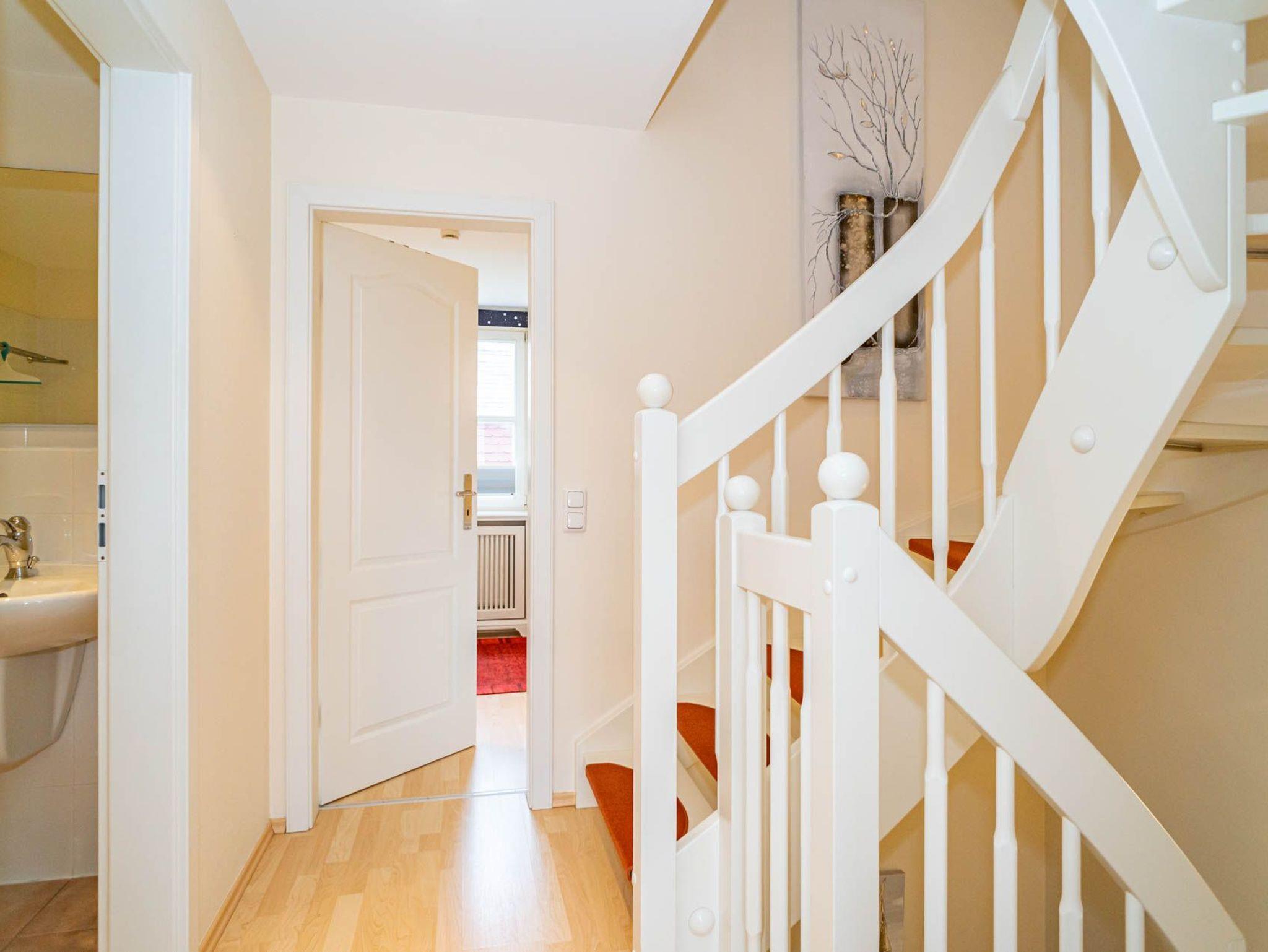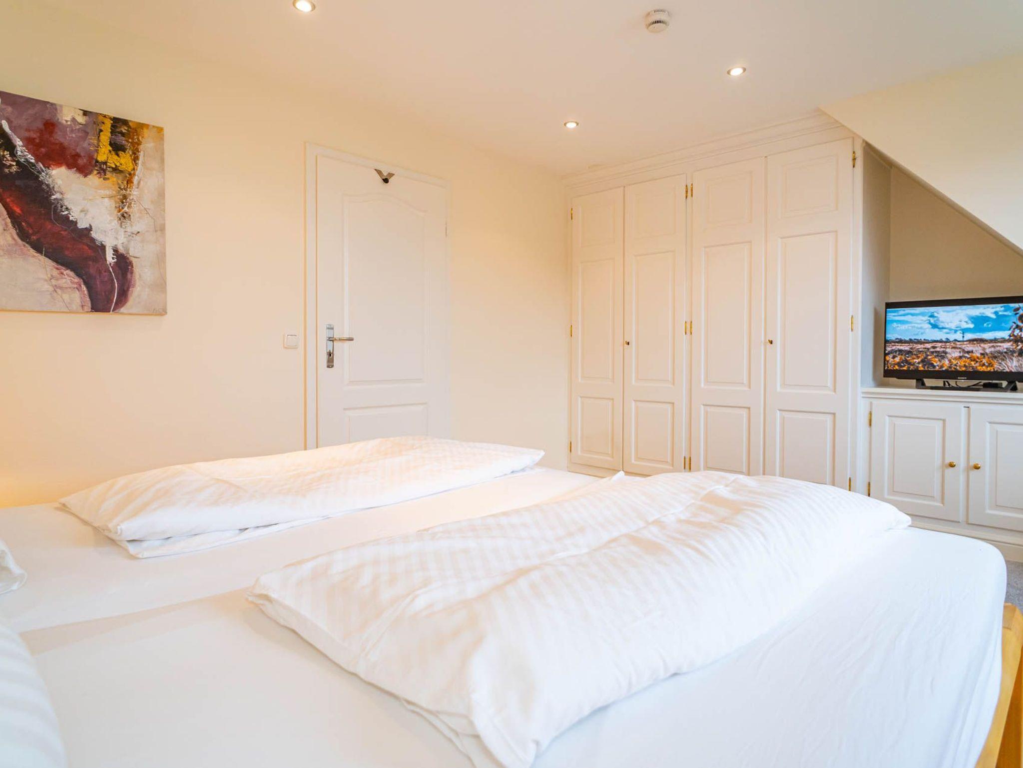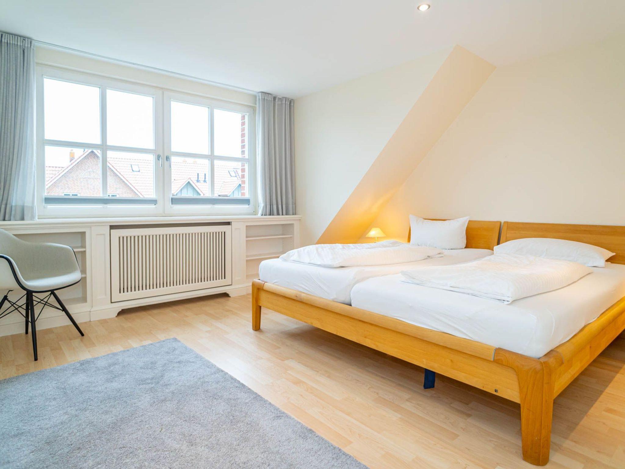 Im 1. Obergeschoss befinden sich zwei mit Ahornlaminat ausgelegte Schlafzimmer, eines mit Doppelbett, das andere mit zwei Einzelbetten.