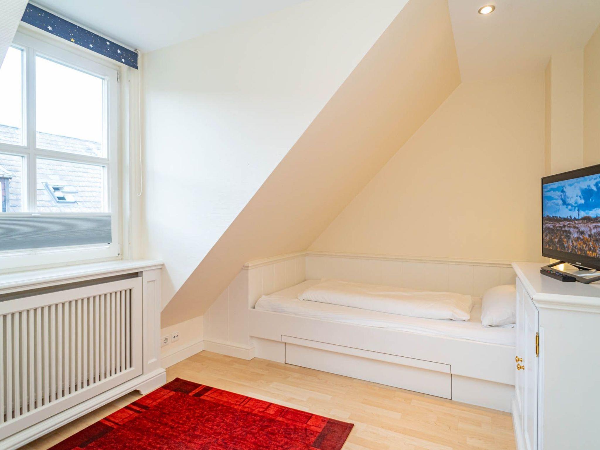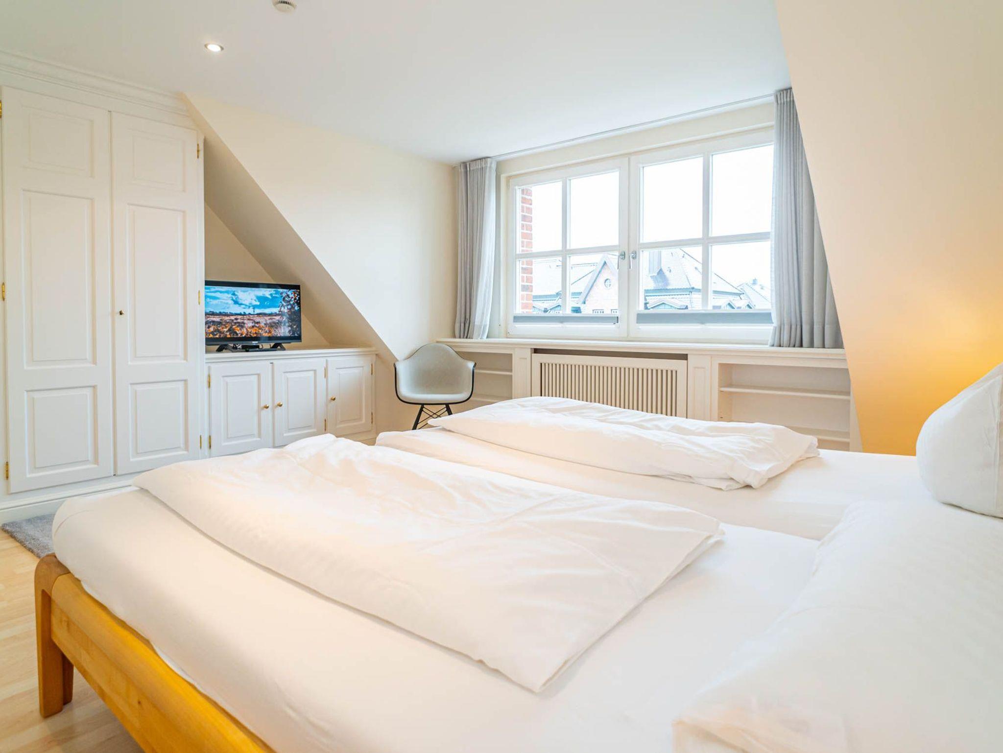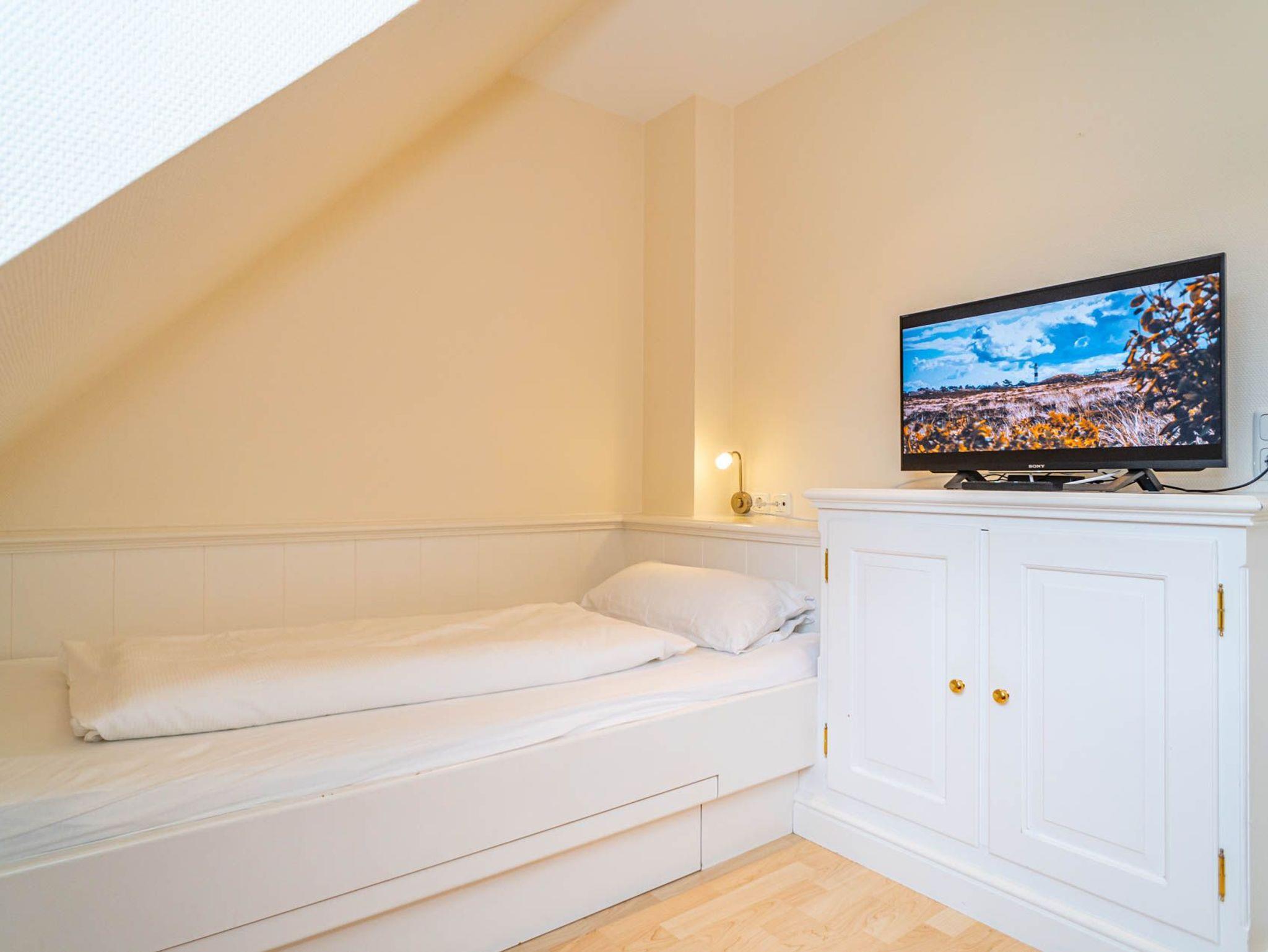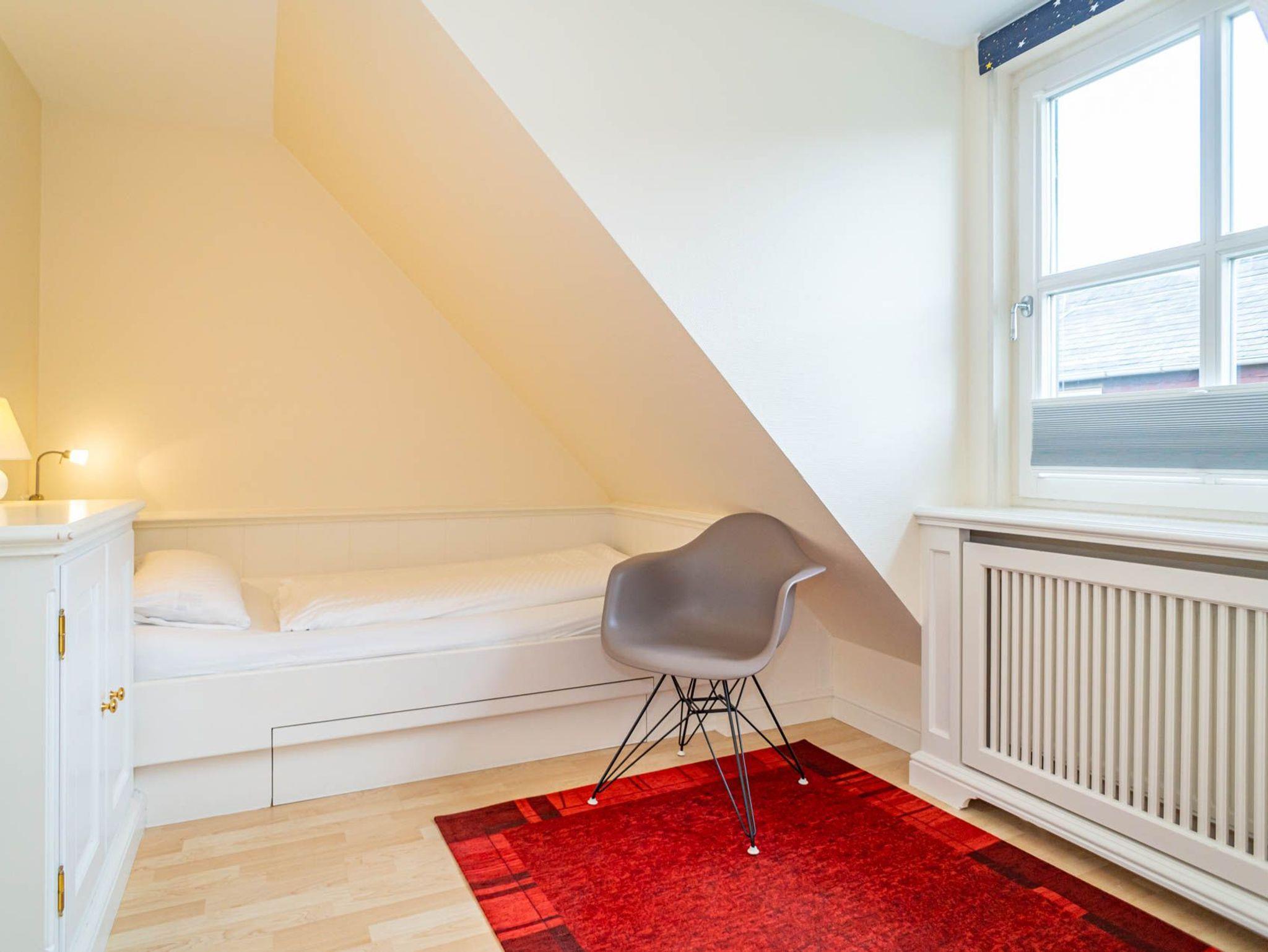 Im 1. Obergeschoss befinden sich zwei mit Ahornlaminat ausgelegte Schlafzimmer, eines mit Doppelbett, das andere mit zwei Einzelbetten.