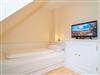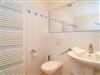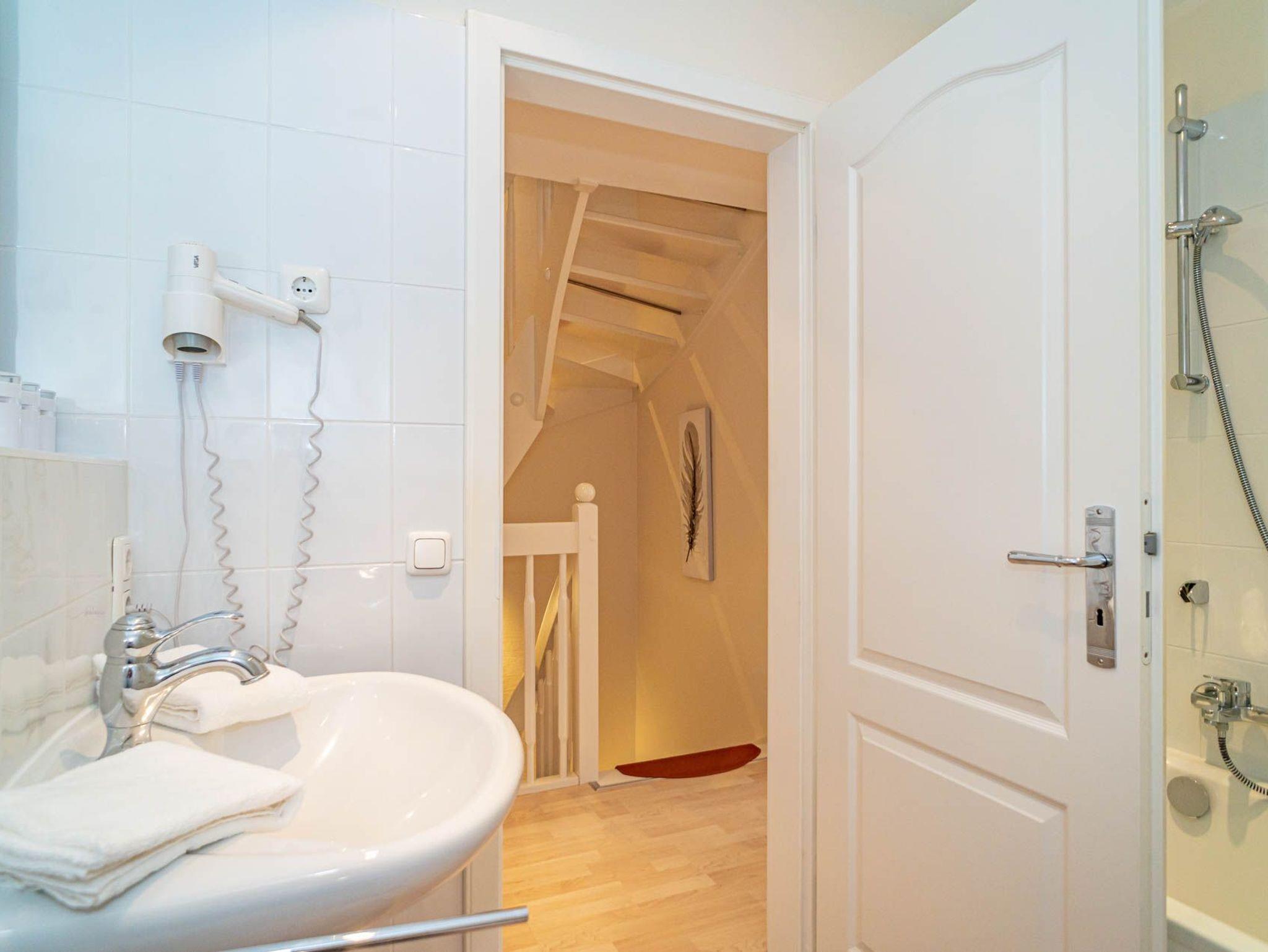 Im Bad befinden sich eine Wanne mit Duschvorrichtung, ein WC, ein Waschtisch.