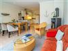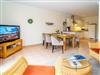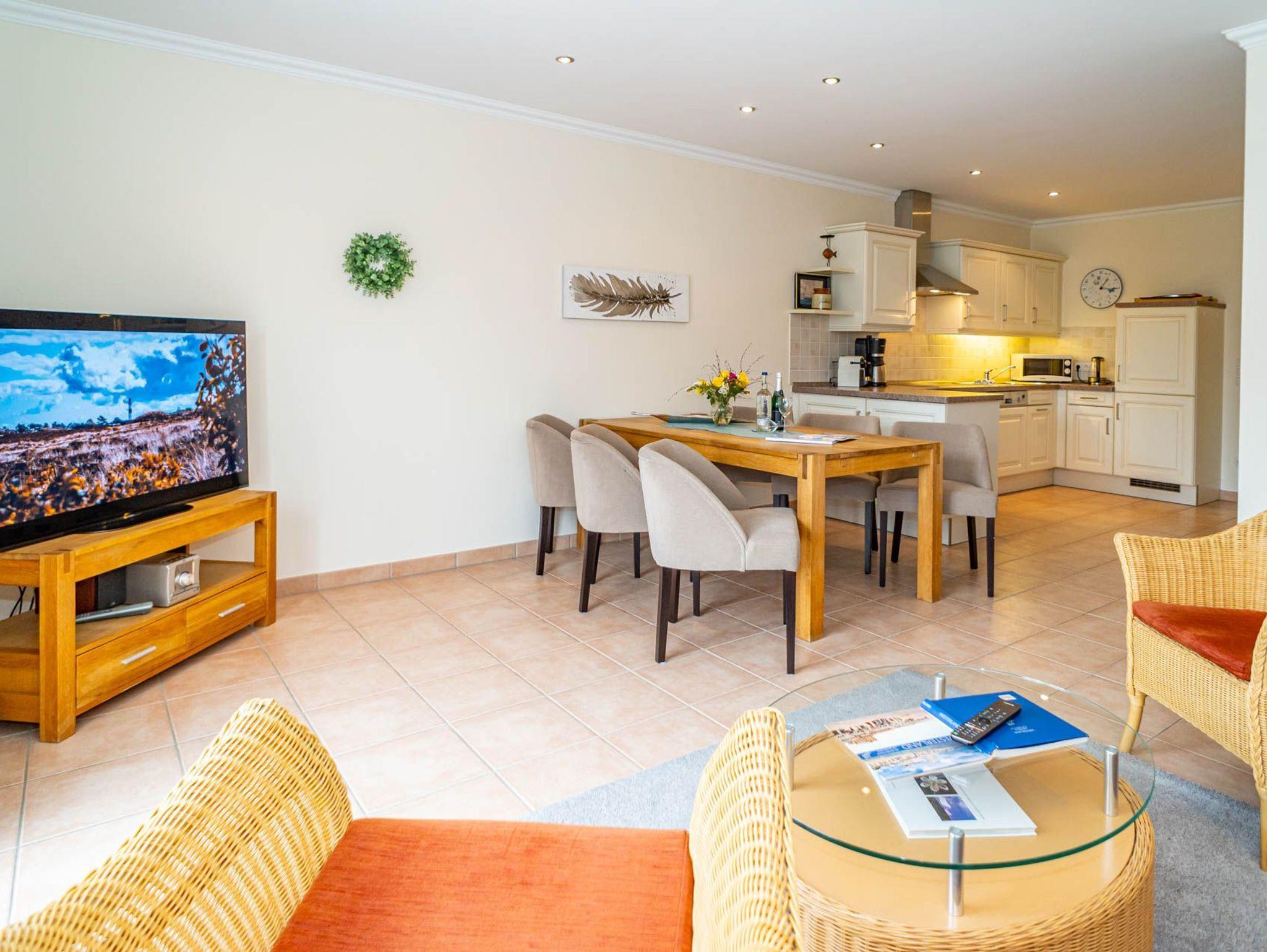 Das komplett geflieste Wohnzimmer ist mit einer Dreisitzer-Couch, zwei Korbsesseln, einem Essplatz, einem Kaminofen, Flachbild-TV, Stereoanlage mit Fernbedienung inkl. CD/DVD und Radio ausgestattet.