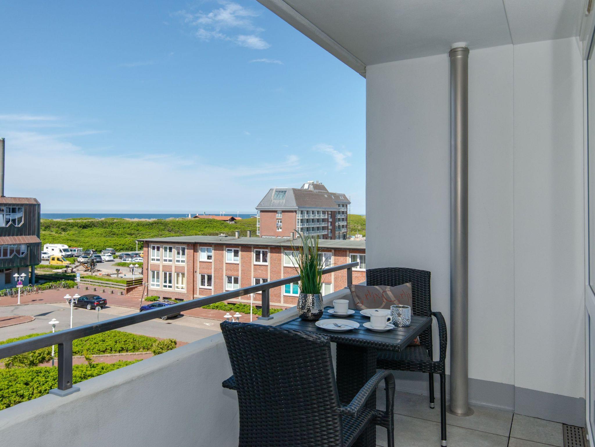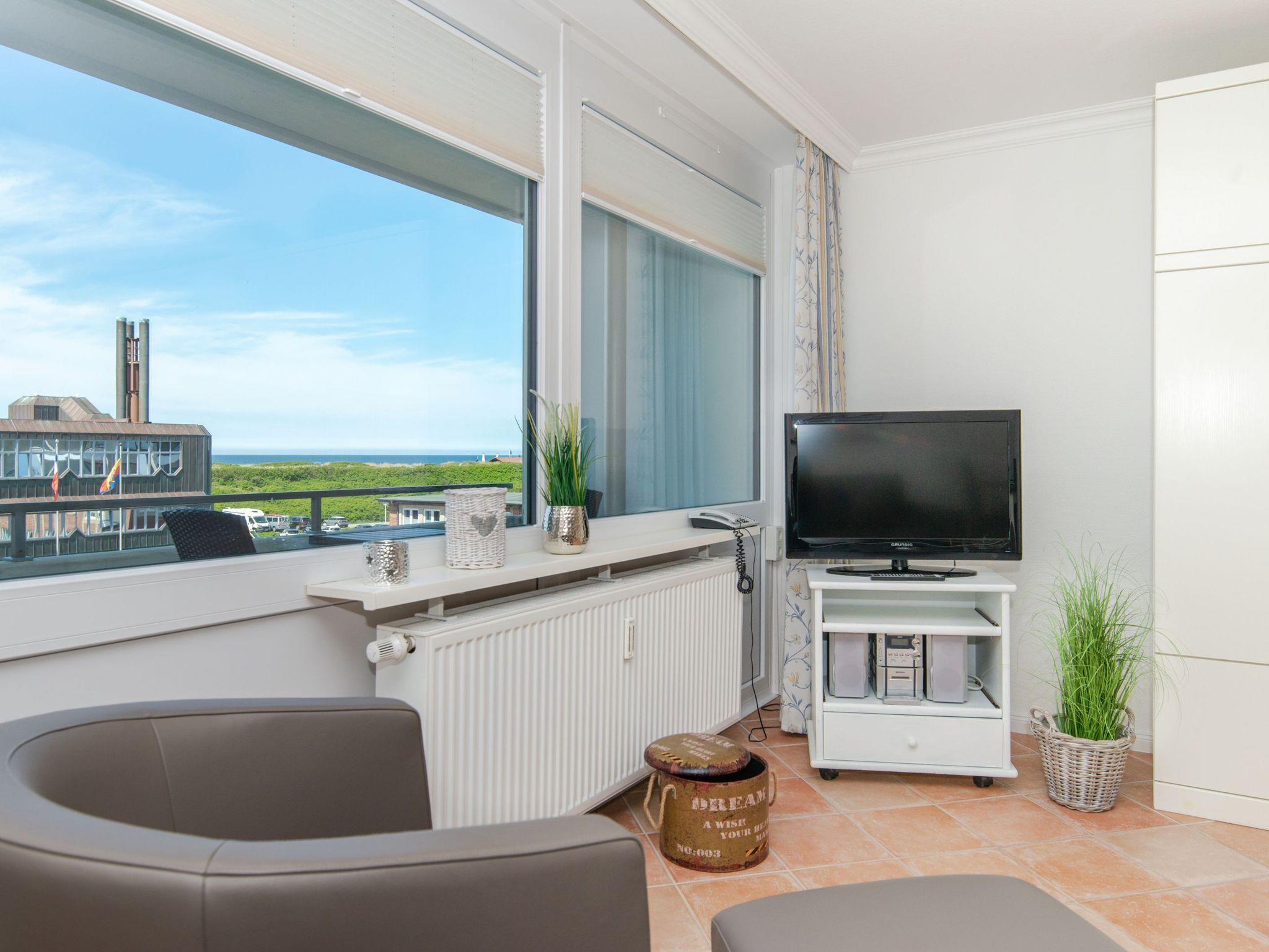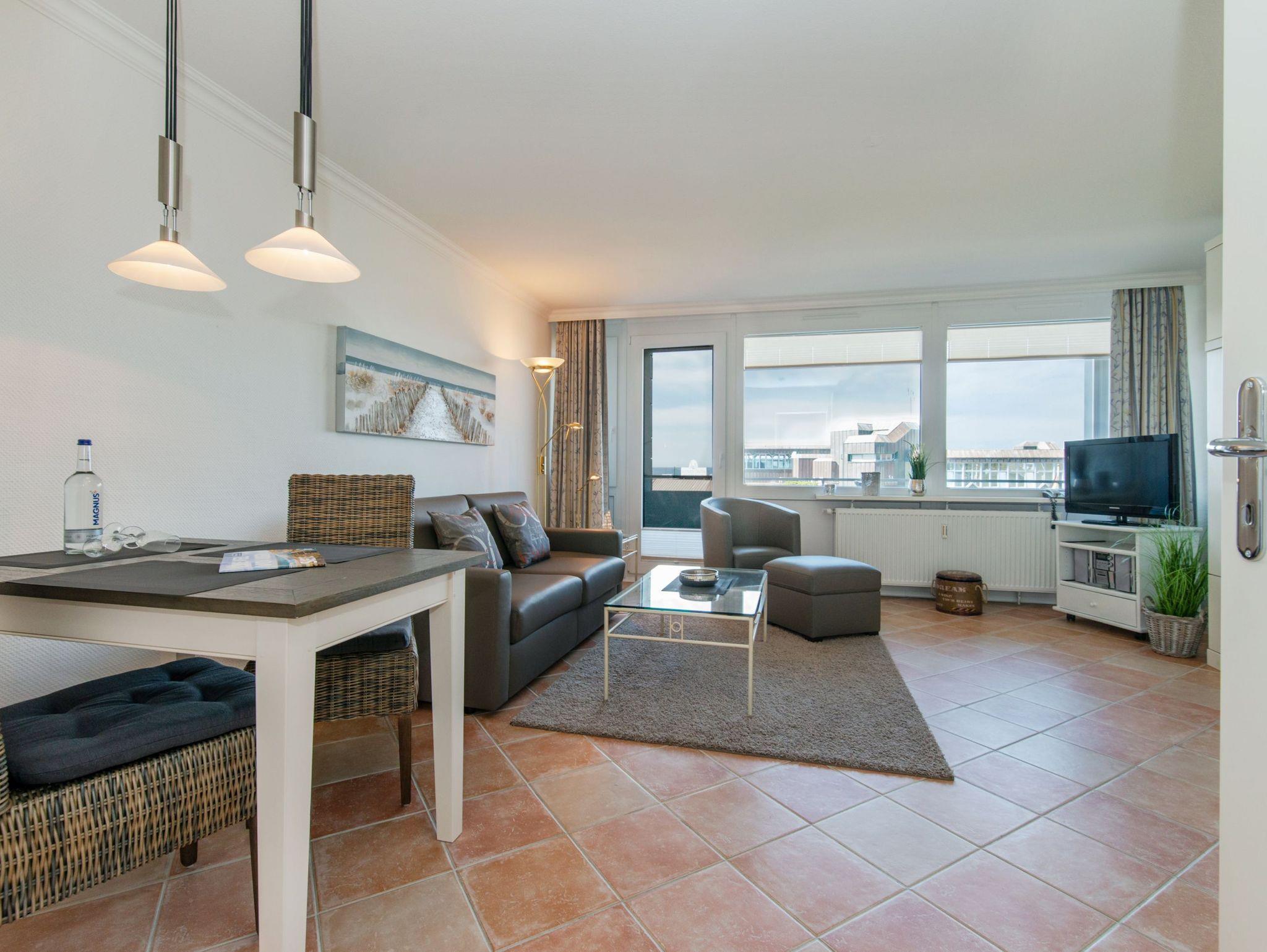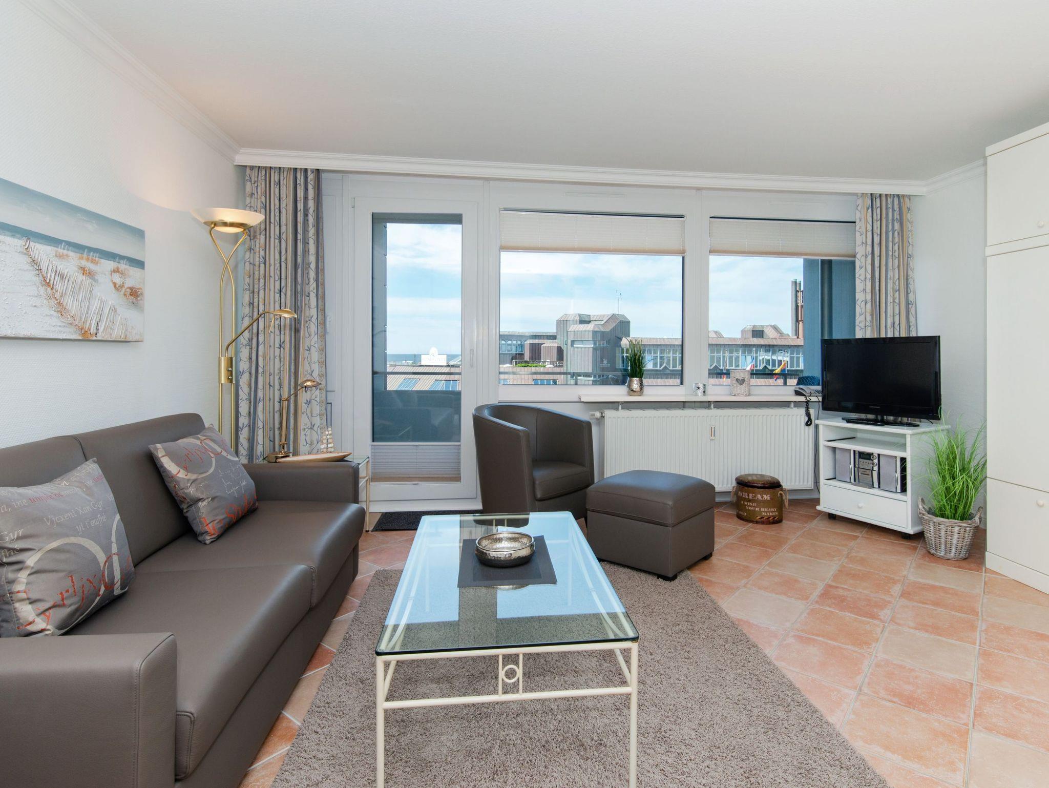 Geschmackvoll eingerichtete, komplett geflieste 1-Zimmer-Nichtraucher-Ferienwohnung (ca. 40 qm) in der 3. Etage mit Meerblick und Westloggia (Nachmittagssonne, mit Balkonmöbeln und Auflagen) für max. 2 Personen.