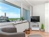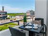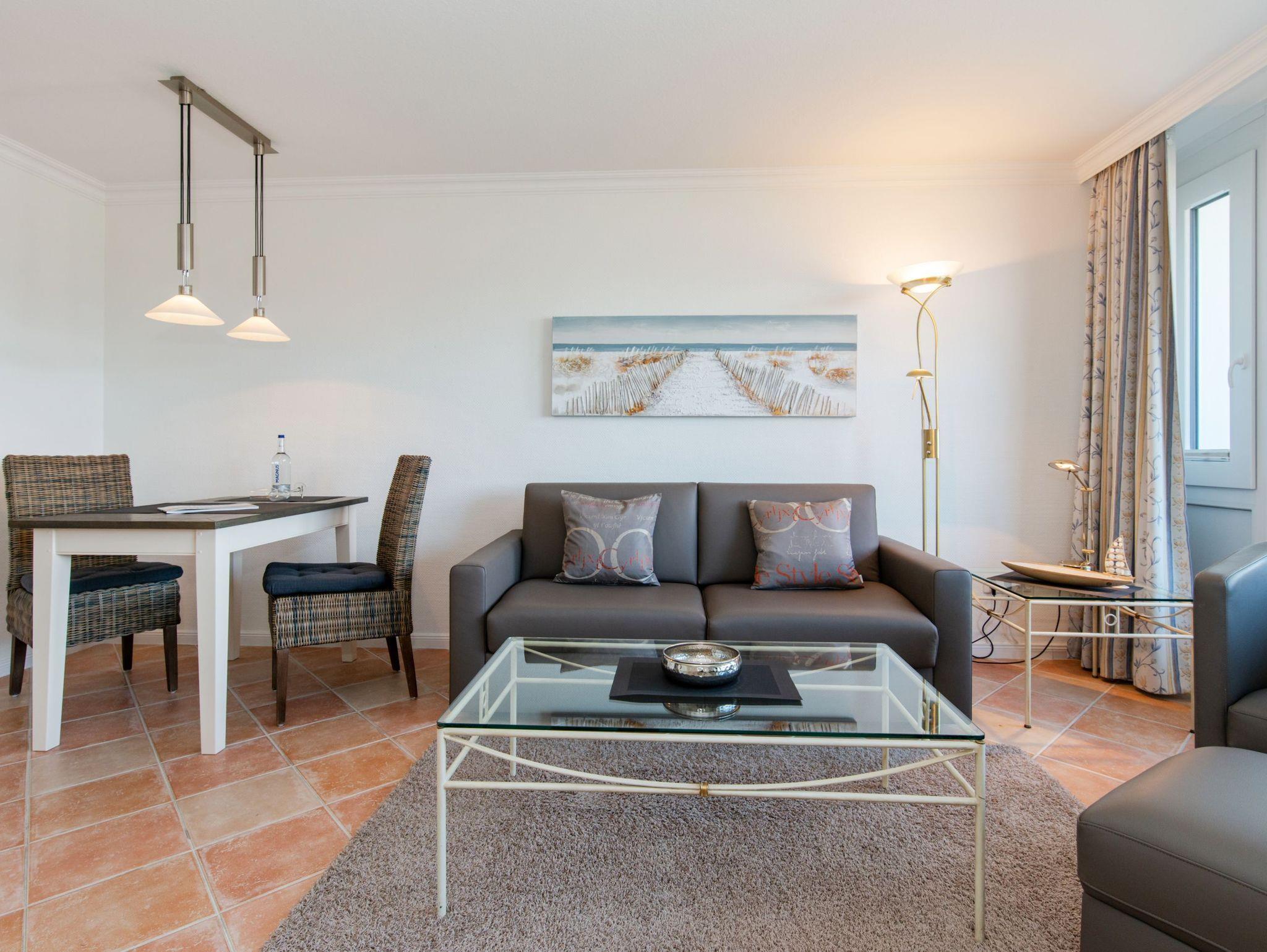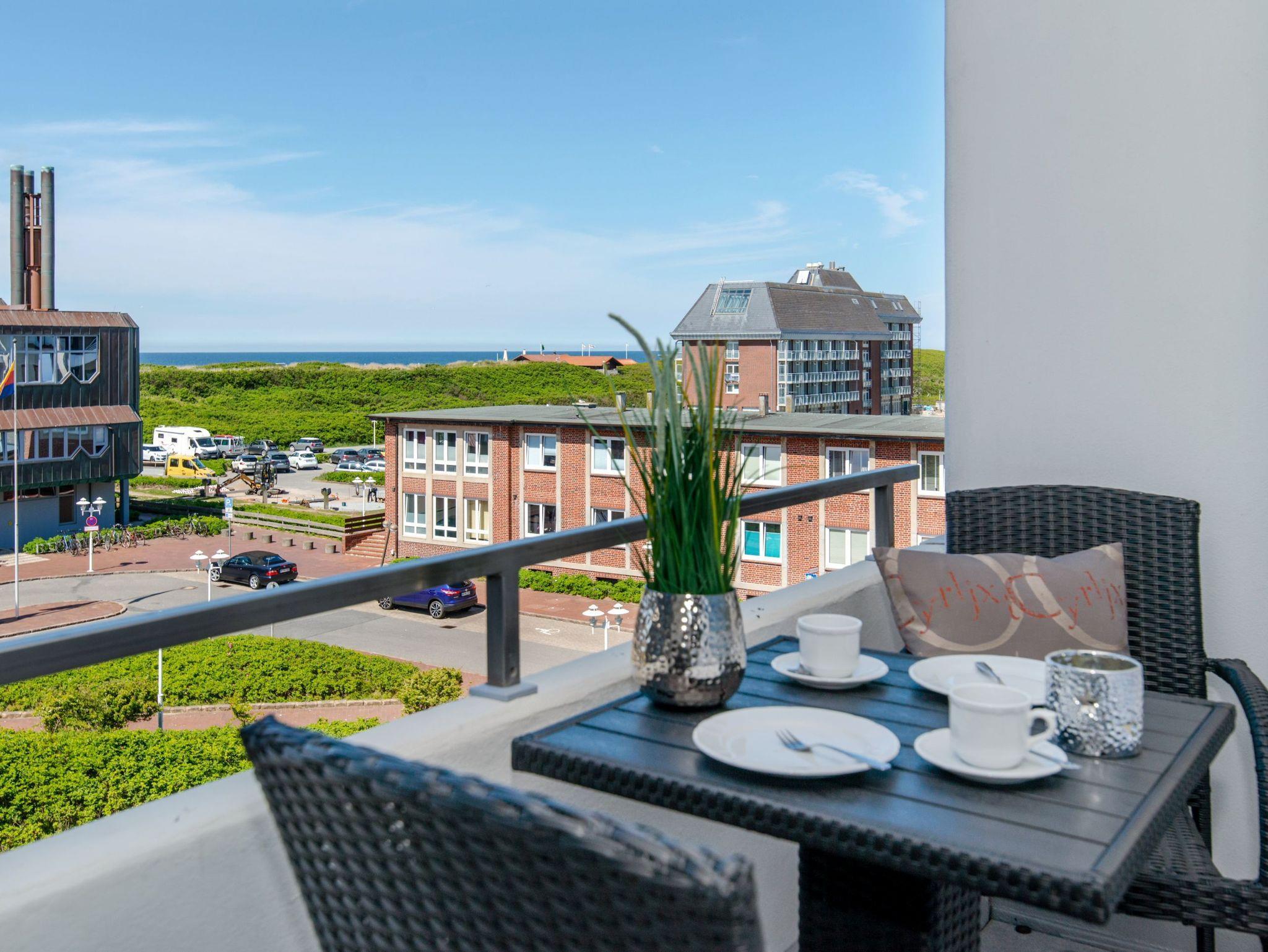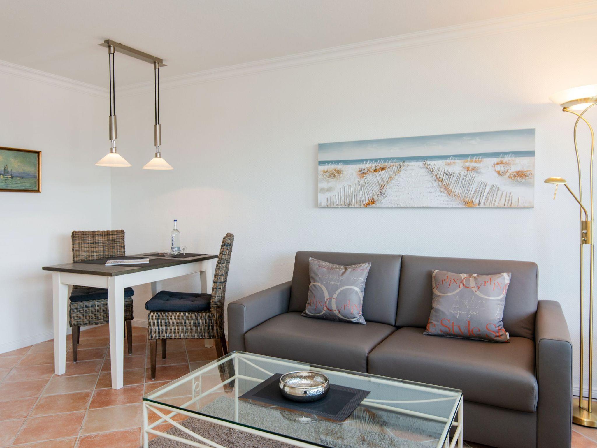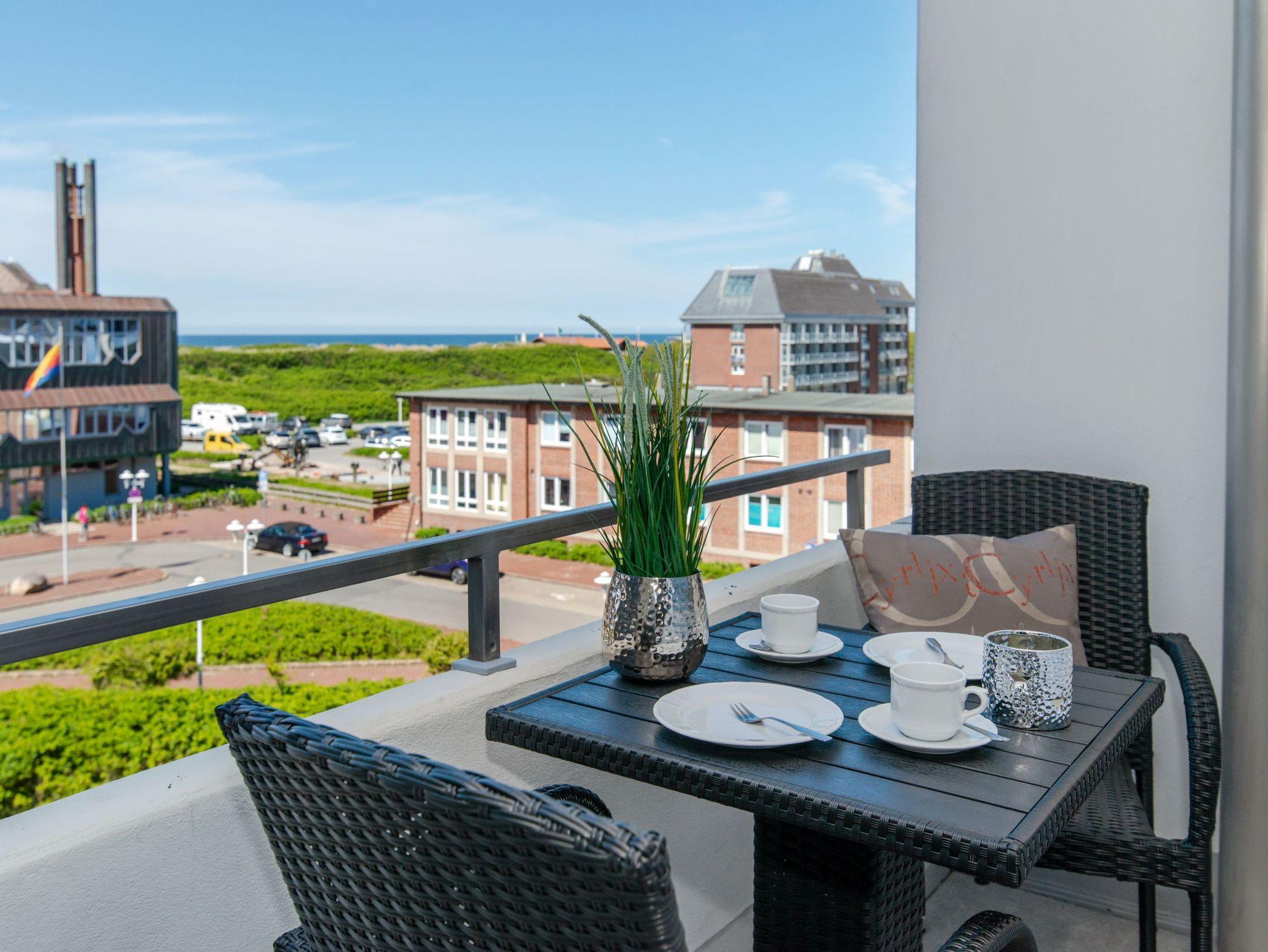 Geschmackvoll eingerichtete, komplett geflieste 1-Zimmer-Nichtraucher-Ferienwohnung (ca. 40 qm) in der 3. Etage mit Meerblick und Westloggia (Nachmittagssonne, mit Balkonmöbeln und Auflagen) für max. 2 Personen.