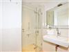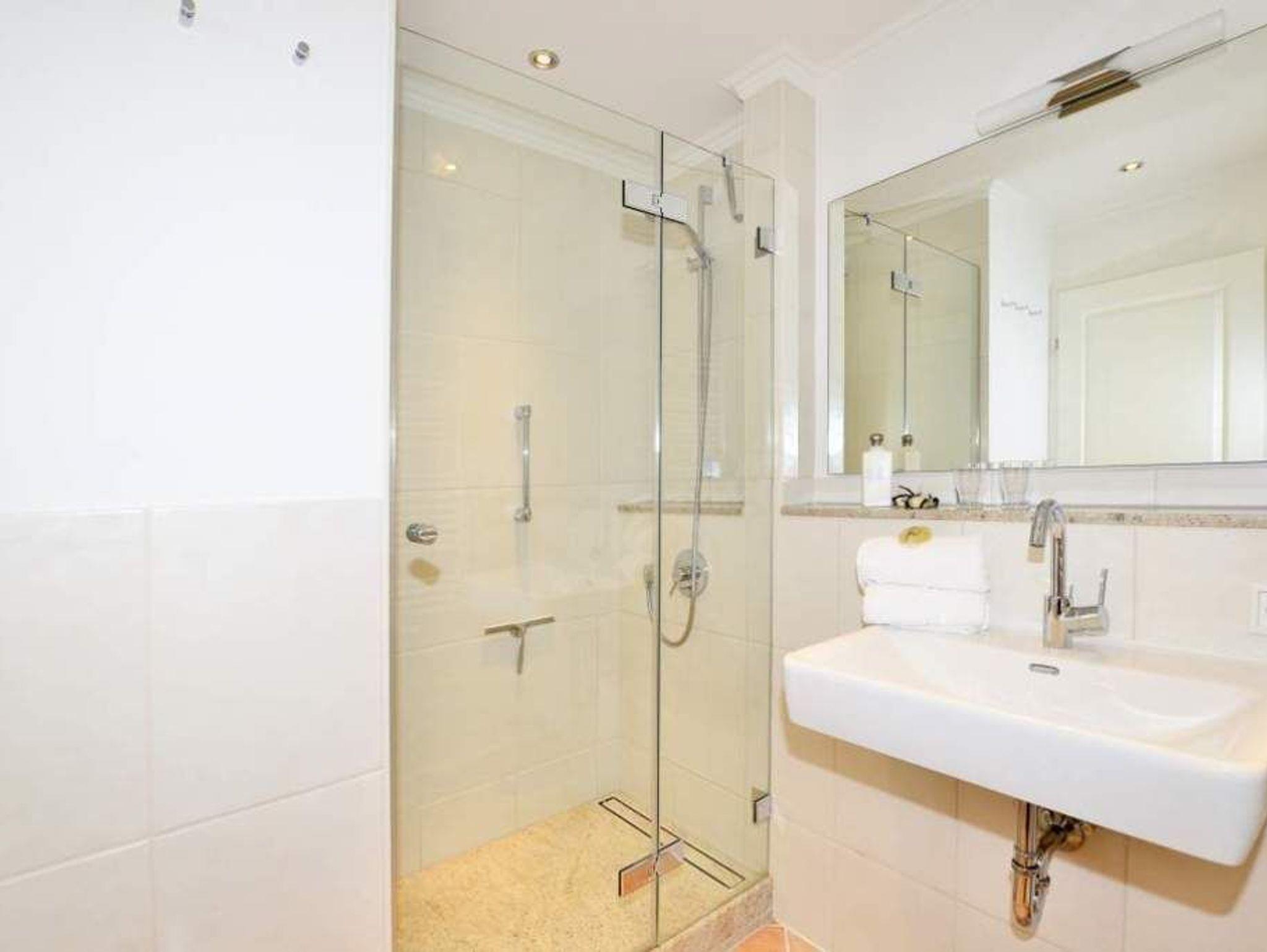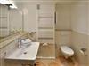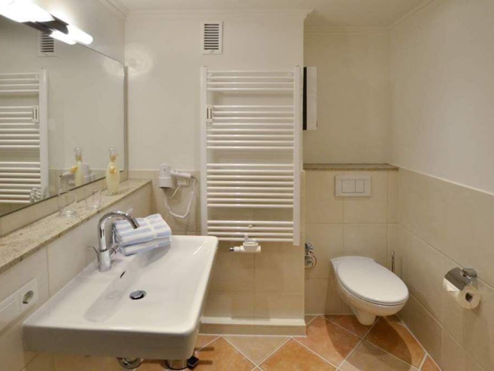 Das helle, neue Duschbad/WC hat einen Waschtisch, einen Handtuchtrockner und einen festinstallierten Fön.