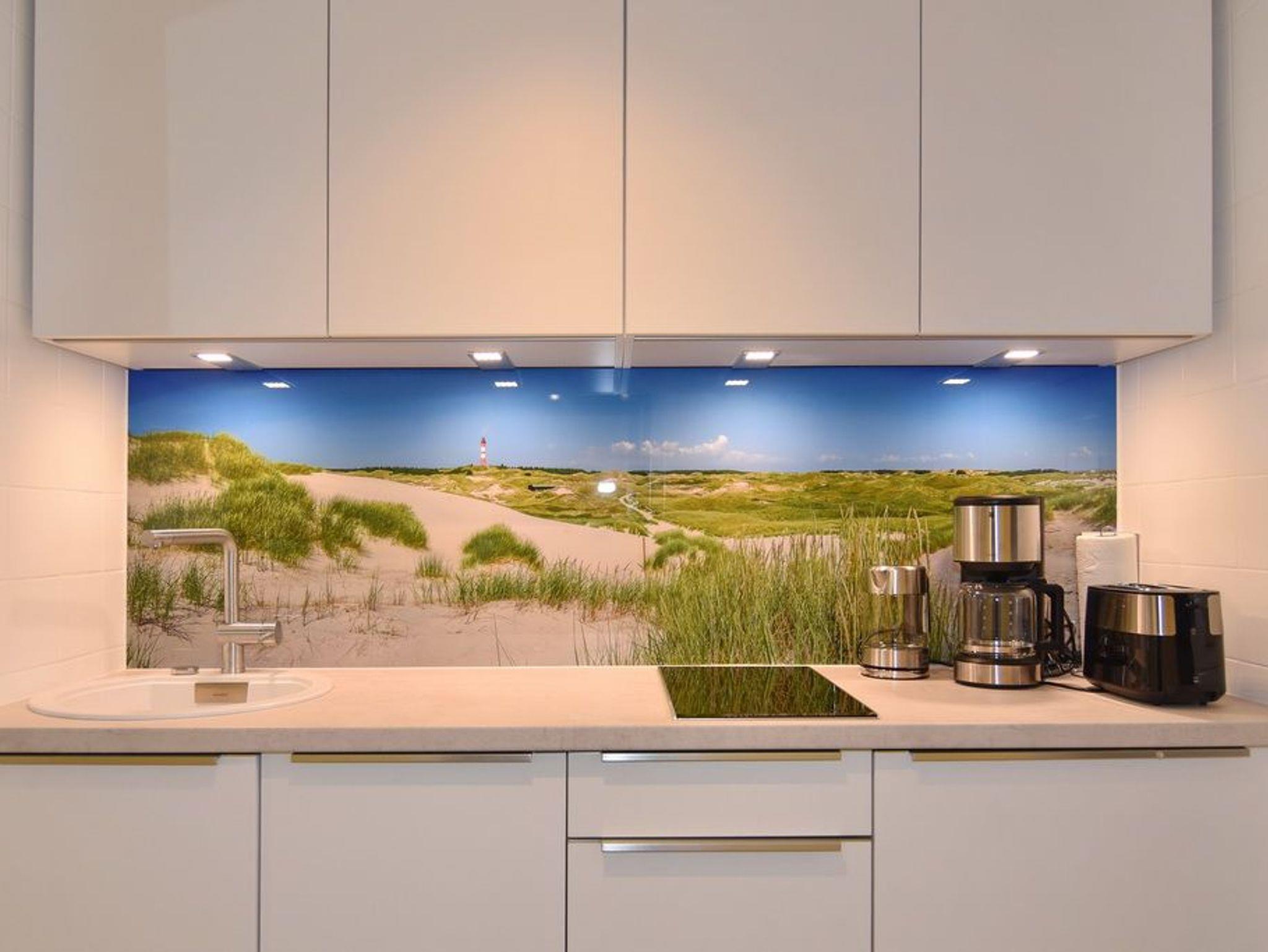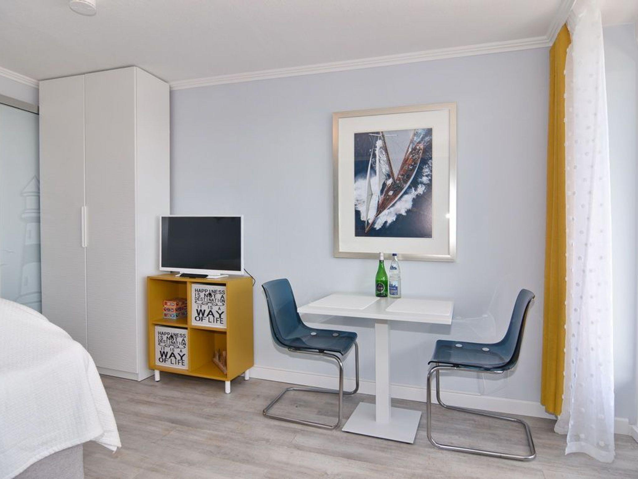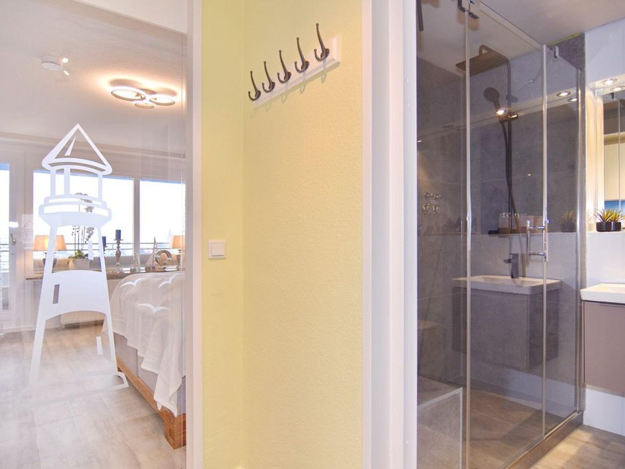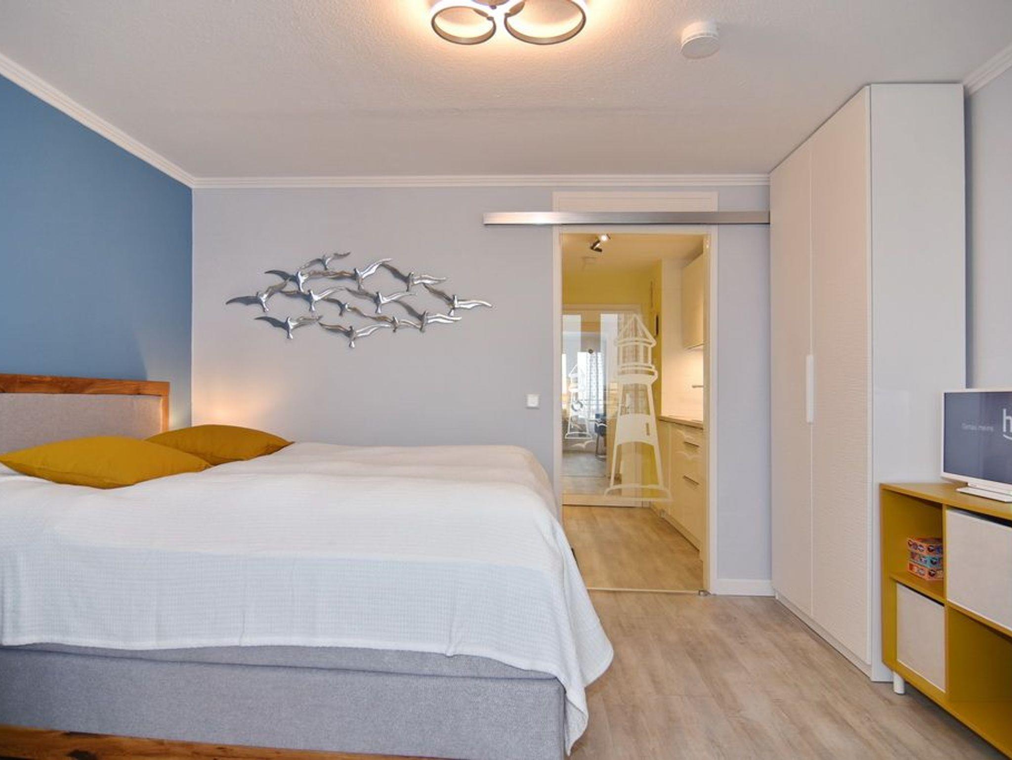 Moderne 1-Zimmer-Ferienwohnung mit ca. 30m² im 6.OG zur Landseite im Haus Sylter Welle. Nichtraucher-Whg.! Kombinierter Wohn-/Schlafraum mit Boxspringbett (2x80x200 ), 2-Sitzer-Couch, Essplatz für zwei Personen, Flat-TV mit integriertem Radio, W-Lan (ohne Gewähr). Einladender Ostbalkon mit Balkonmöbeln und Blick über die Innenstadt von Westerland. Helle Küchenzeile im Flurbereich mit Geschirrspüler, 2-Platten-Ceranfeld. Duschbad mit großzügiger Wellnessdusche. Bettwäsche und Handtücher sind zur Anreise aufgezogen. Ein PKW-Stellplatz kann kostenpflichtig zugebucht werden. Tierhaltung (Hund) ist gestattet, muss bitte angemeldet werden!