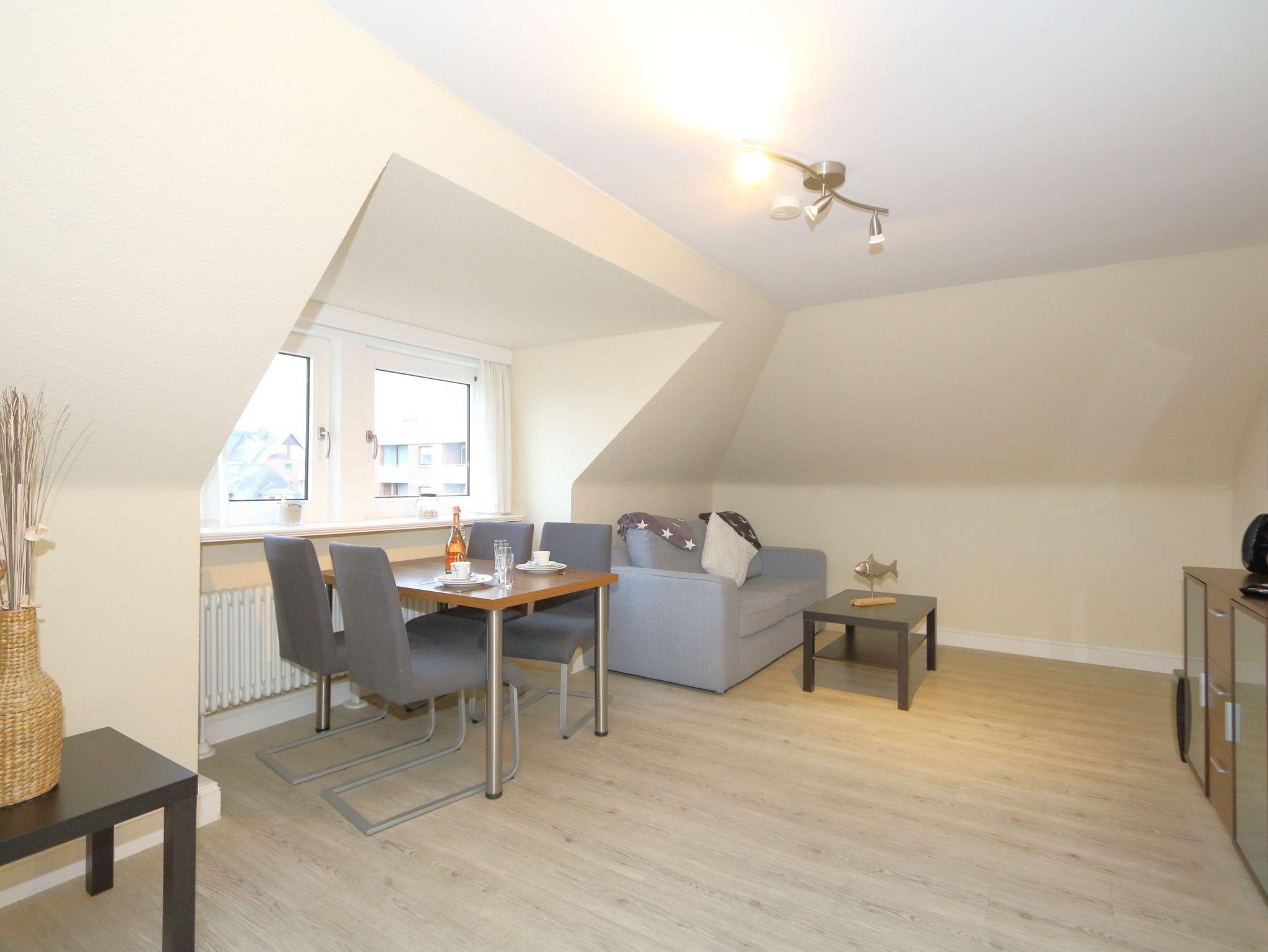 Im Wohnzimmer ist eine bequeme Schlaf-Couchgarnitur mit Clubtisch und Sessel. Eine kleine Eßecke für 4 Personen schließt sich daran an.