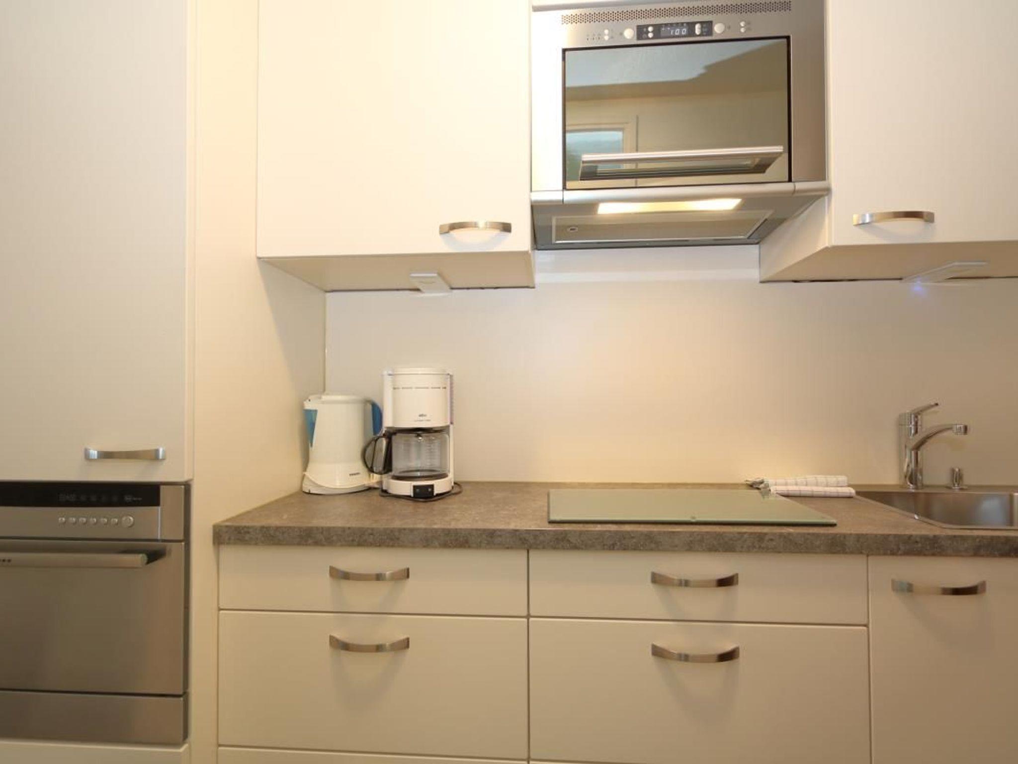 Das Appartement ist großzügig ausgestattet mit u.a. einem festen Boxspringbett, und Westbalkon, moderner Küchenzeile im Flur und ein Badezimmer mit Dusche.