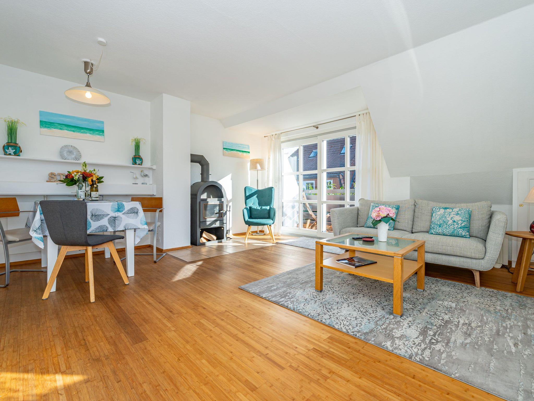 Hochwertig ausgestattete lichtdurchflutete 2-Zimmer-Nichtraucher-Ferienwohnung, Wohnen auf 2 Ebenen, ca. 65 qm im 1. OG mit Balkon und Balkonmöbeln für max. 2 Personen.