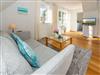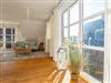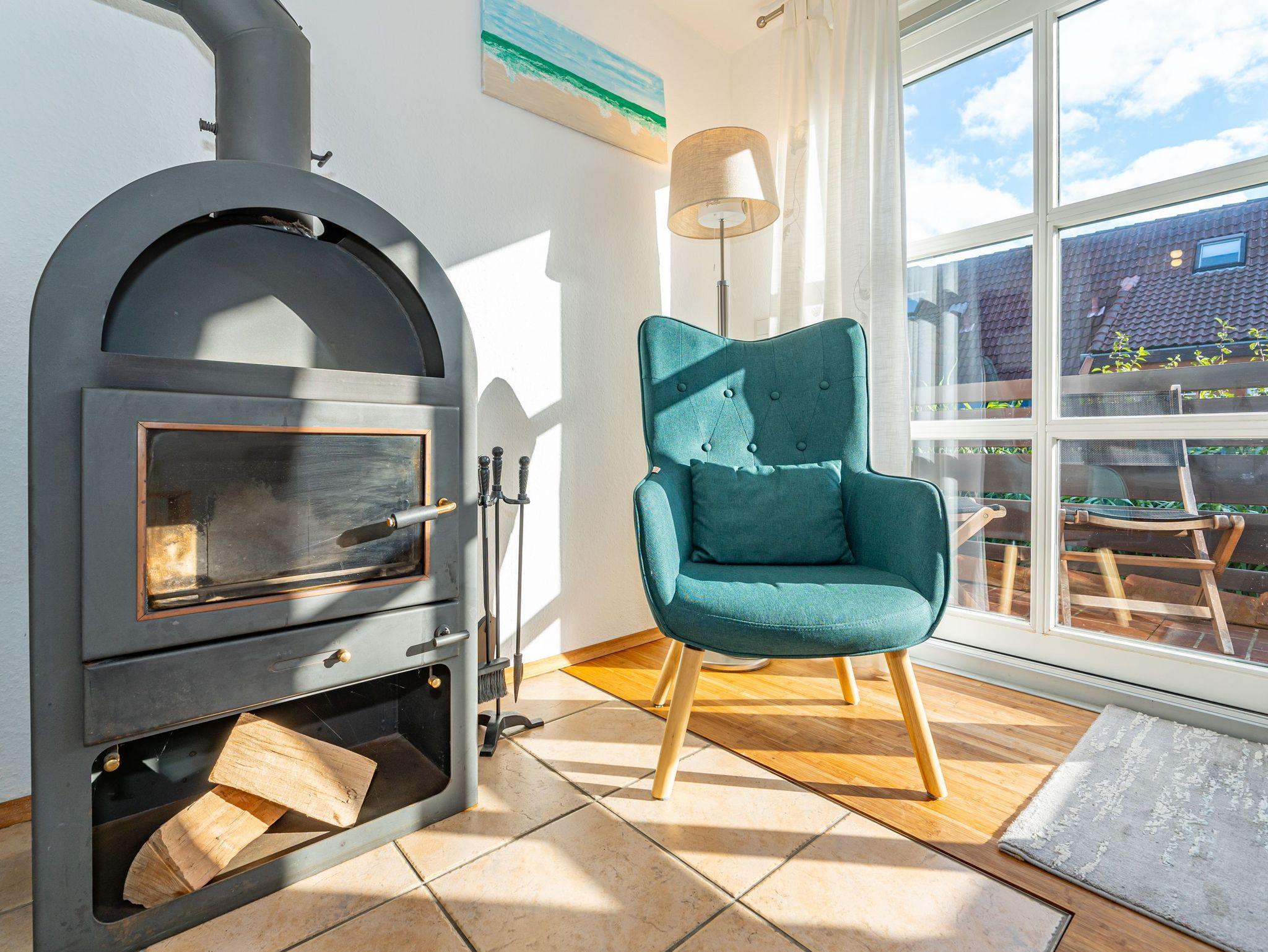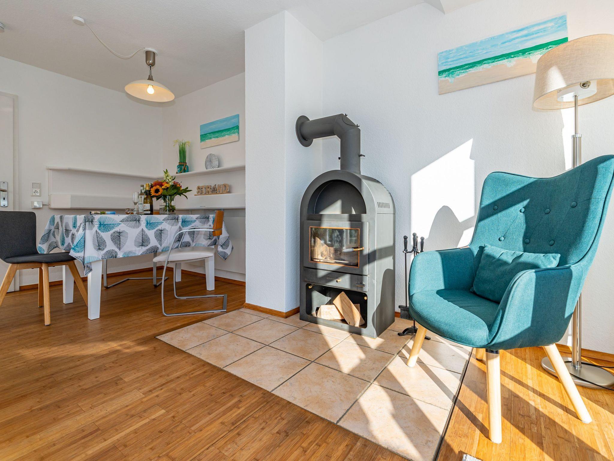 Der Wohnraum verfügt über eine gemütliche Sitzecke (2,5-Sitzer-Sofa) mit Sessel, einen separaten Essplatz, Radio/CD und Flachbild-TV, einen Kaminofen und ein großes Panoramafenster nach Westen