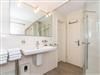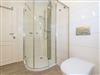 Das Badezimmer mit Fenster ist mit einer Dusche und WC, Waschtisch, Fön und Kosmetikspiegel ausgestattet.