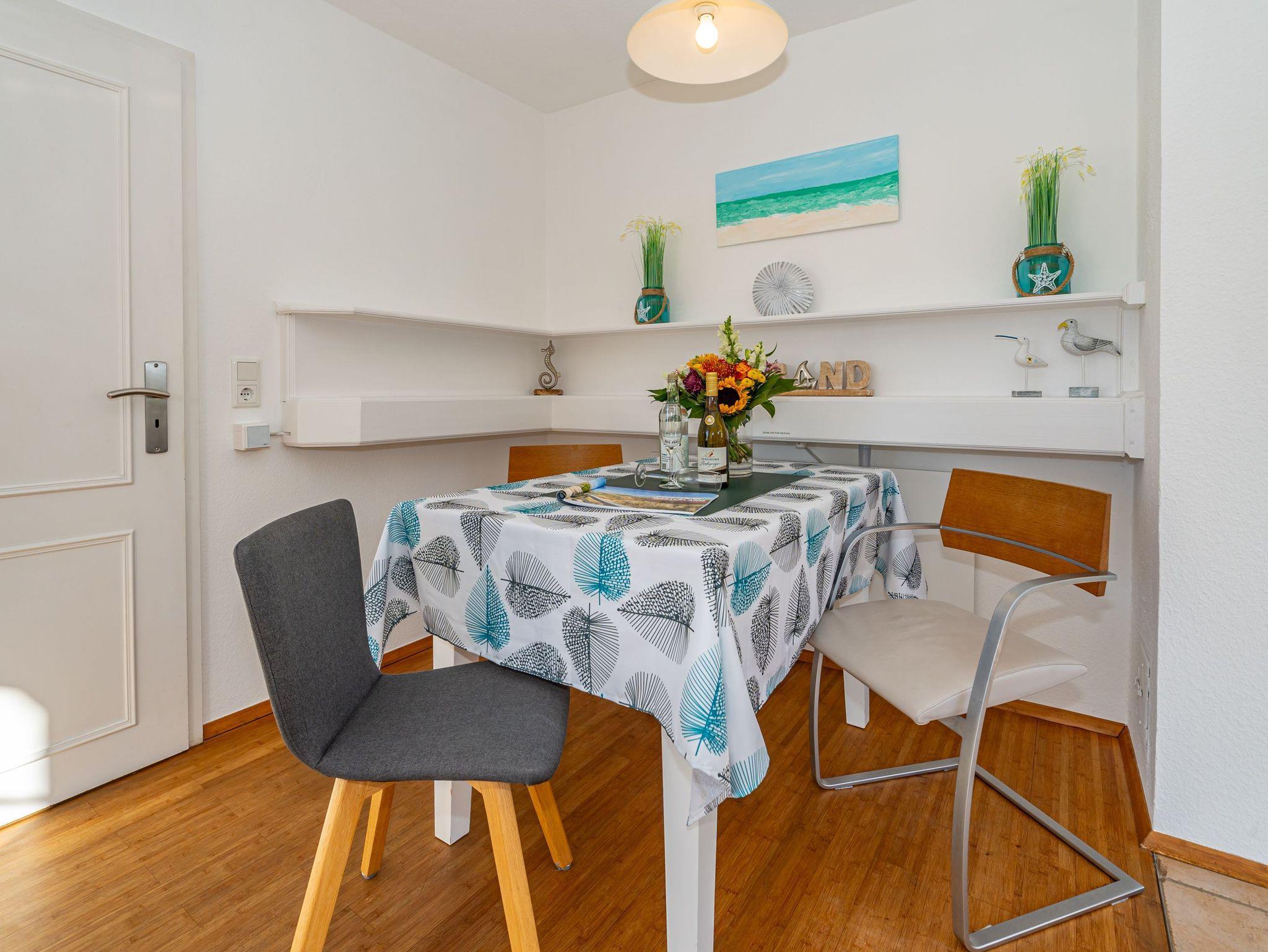 Das Schlafzimmer ist mit einem guten Doppelbett (durchgehende hochwertige Kaltschaummatratze, Liegefläche 1,80 x 2,00 m), Kleiderschrank und mit einer kleinen Sitzecke mit einem Sessel eingerichtet. Die Wohnung bietet teilweise Dünenblick.
